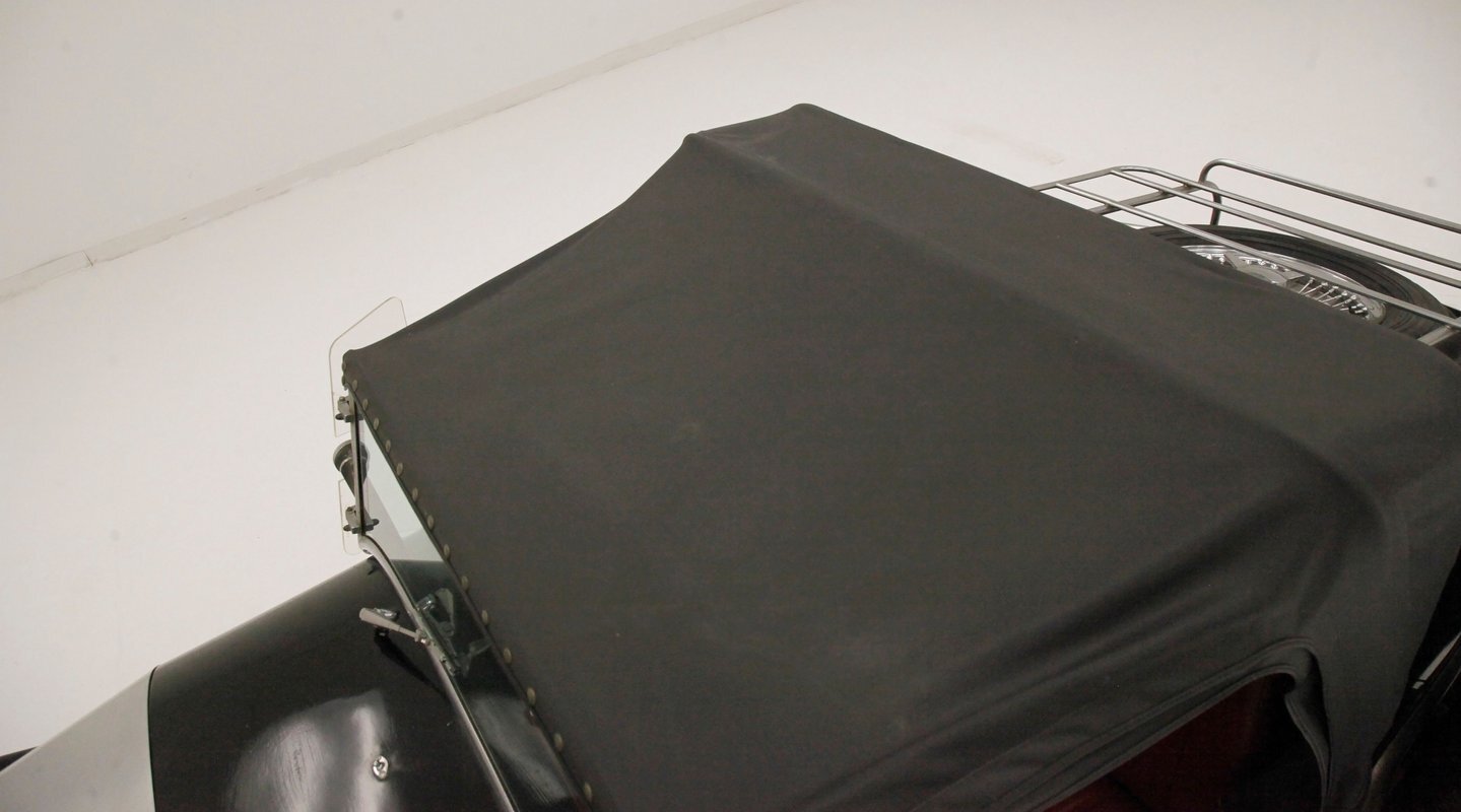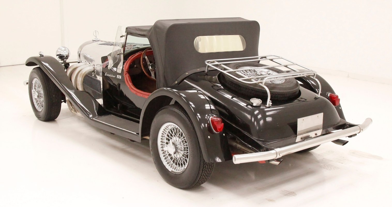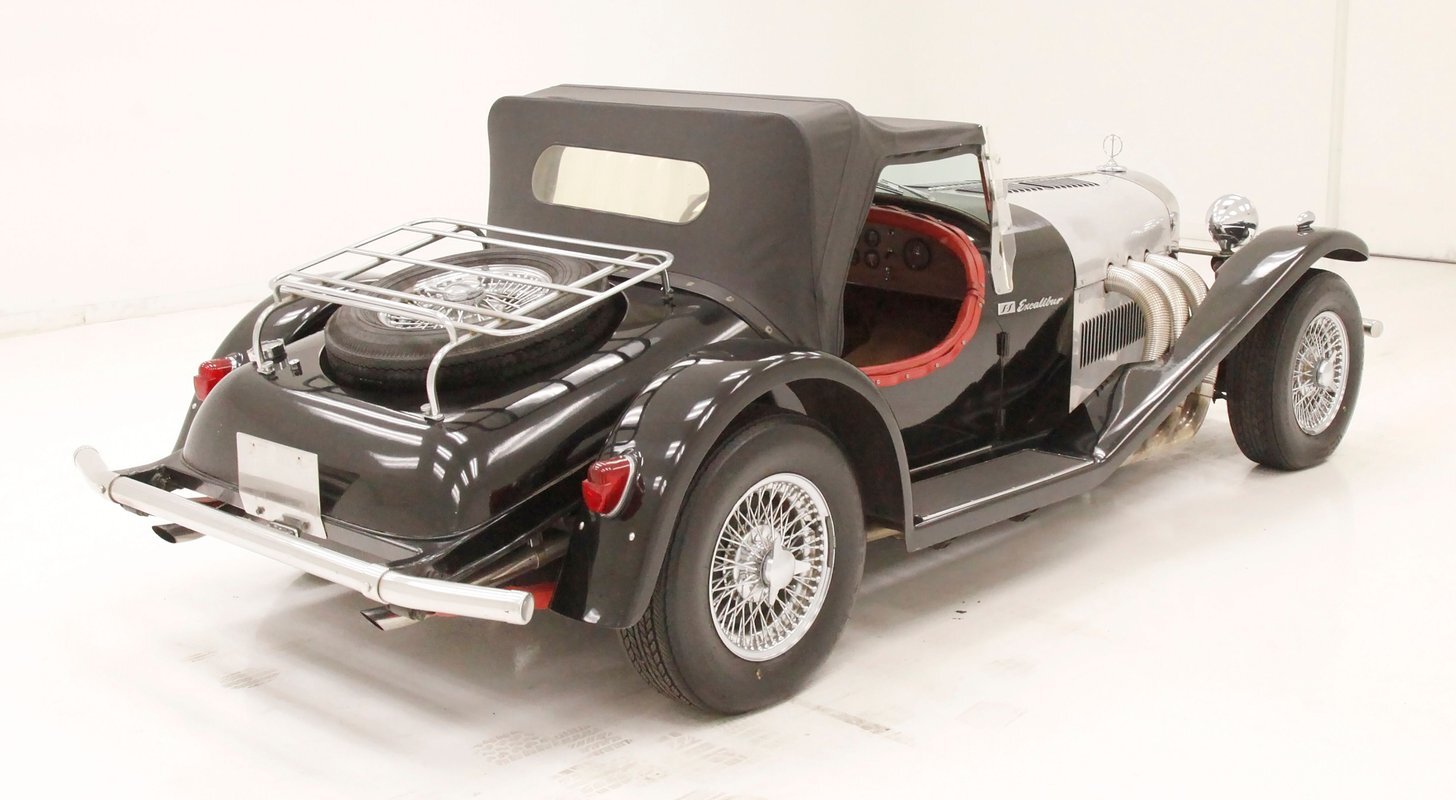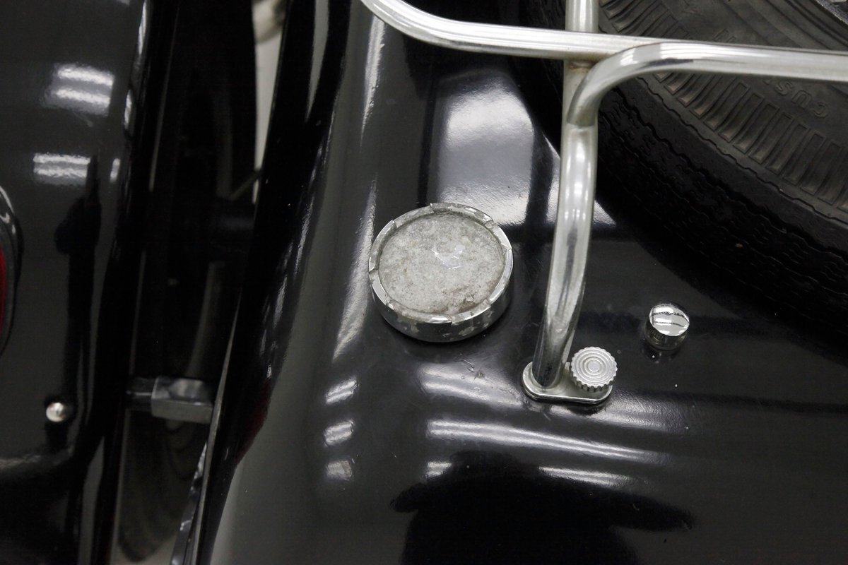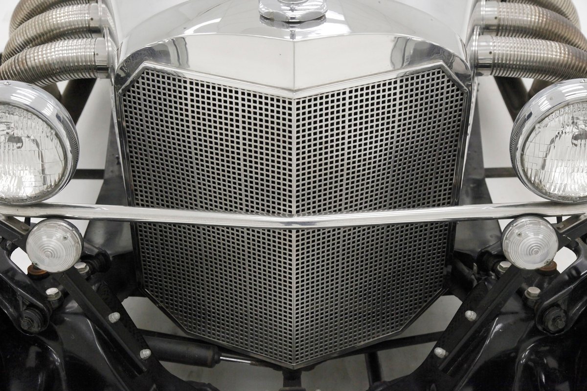 A long cowl makes its way rearward from the chromed grille and radiator surround with vertical ribs. Cord-esque exhaust pipes emanate from either side of the cowl and go exterior to eventually work their way horizontally through the running boards to the back of the car. The hood and cowl are polished aluminum and the exterior mounted fenders are painted black. Also the passenger compartment and trunk area are in black. A black convertible top is on and shiny chrome bumpers protect chromed wire wheels with knock off hubs. A chrome luggage rack is on the back.