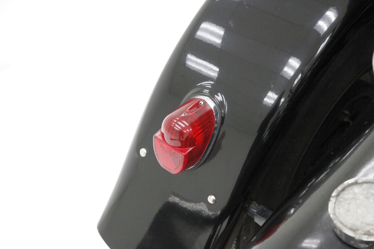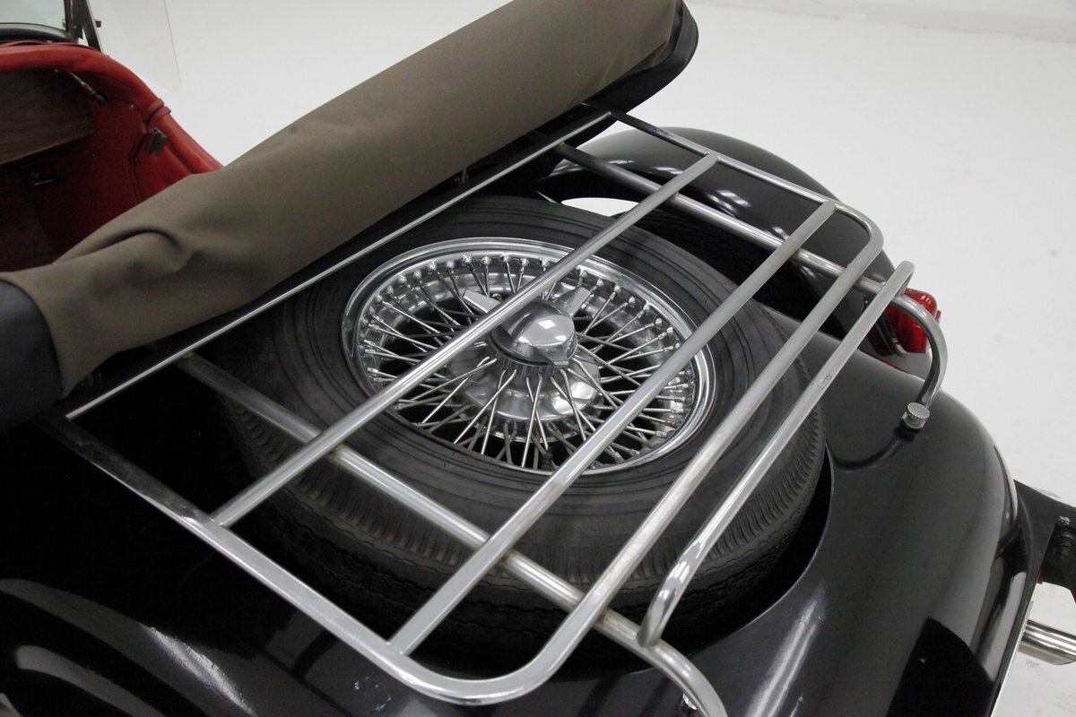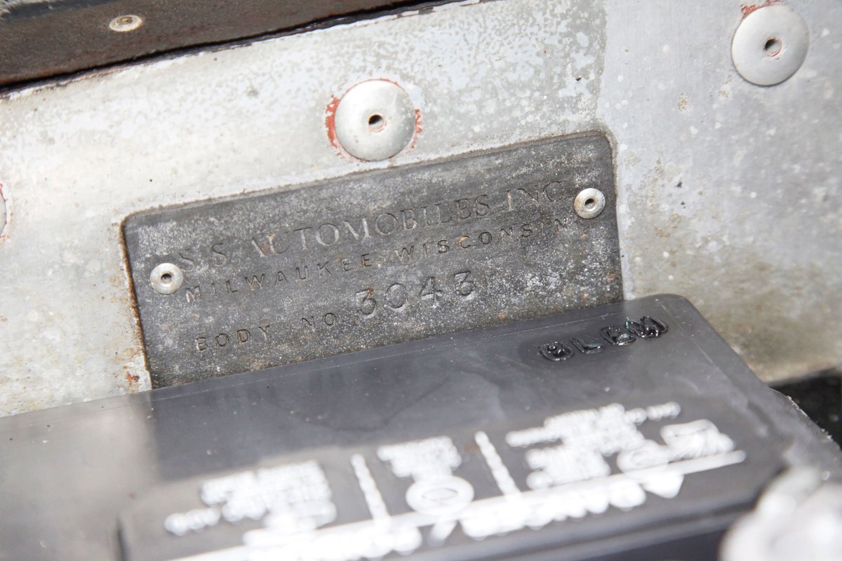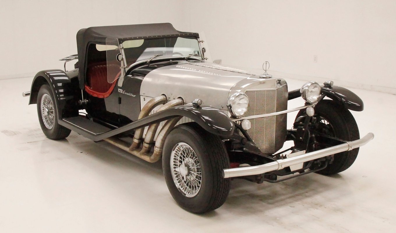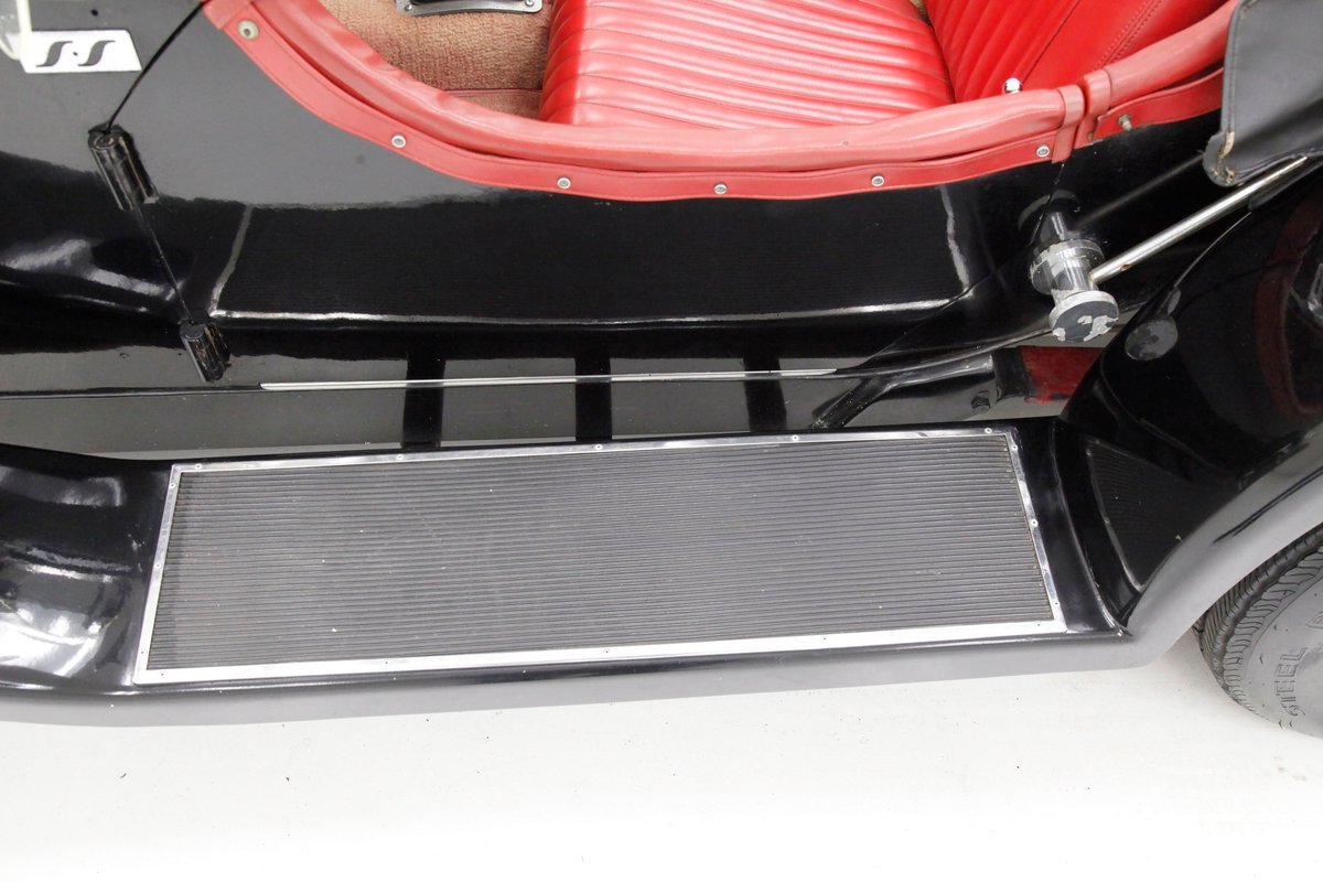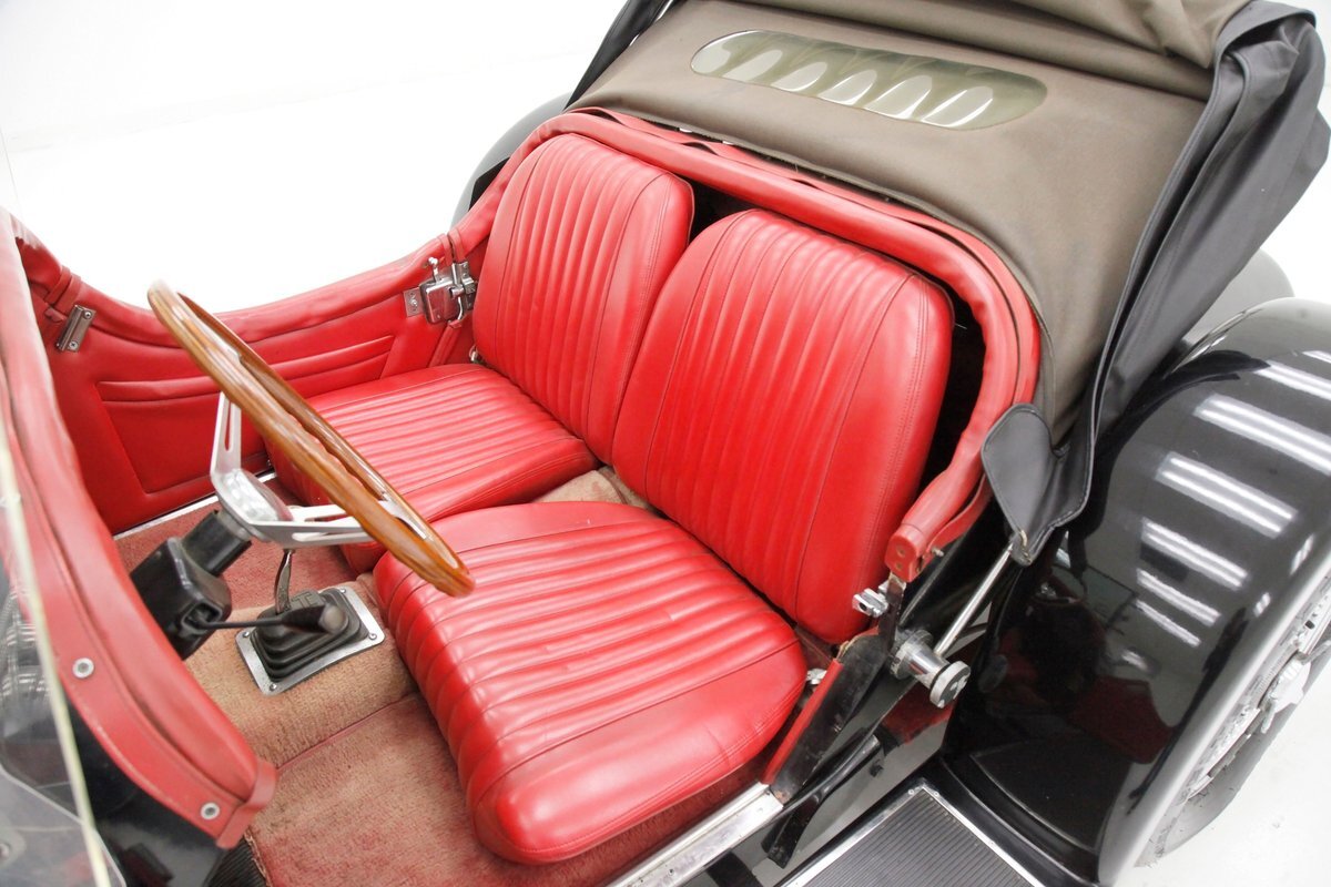 A long cowl makes its way rearward from the chromed grille and radiator surround with vertical ribs. Cord-esque exhaust pipes emanate from either side of the cowl and go exterior to eventually work their way horizontally through the running boards to the back of the car. The hood and cowl are polished aluminum and the exterior mounted fenders are painted black. Also the passenger compartment and trunk area are in black. A black convertible top is on and shiny chrome bumpers protect chromed wire wheels with knock off hubs. A chrome luggage rack is on the back.