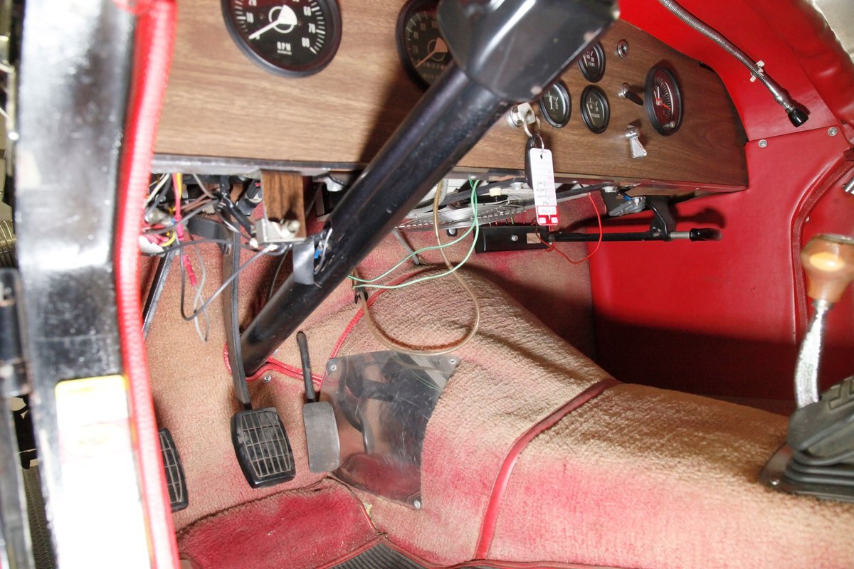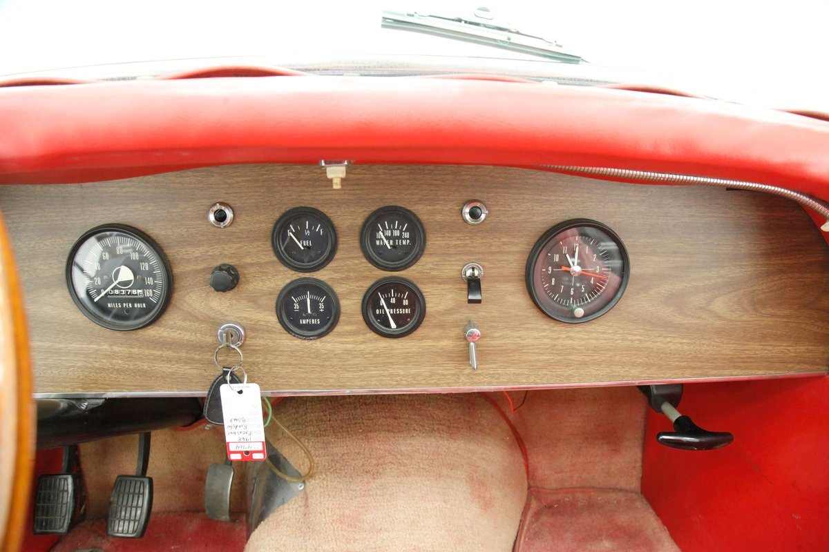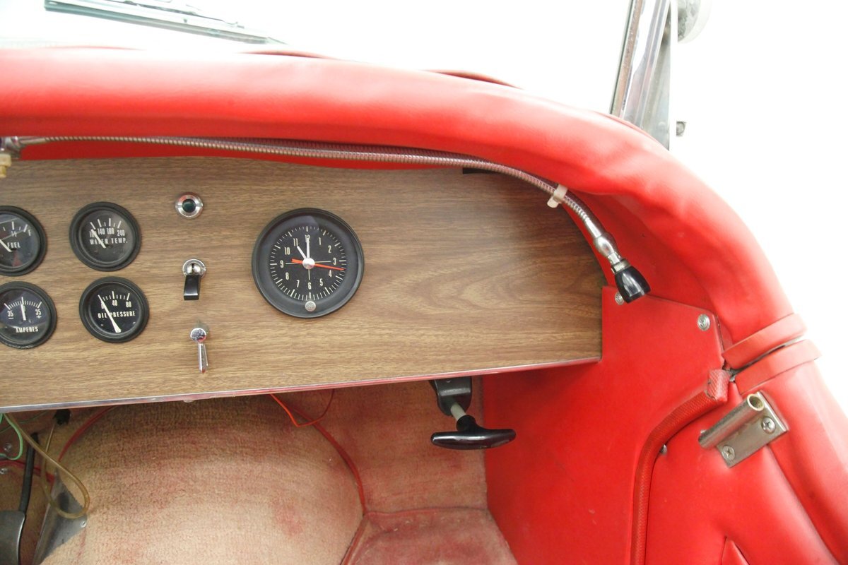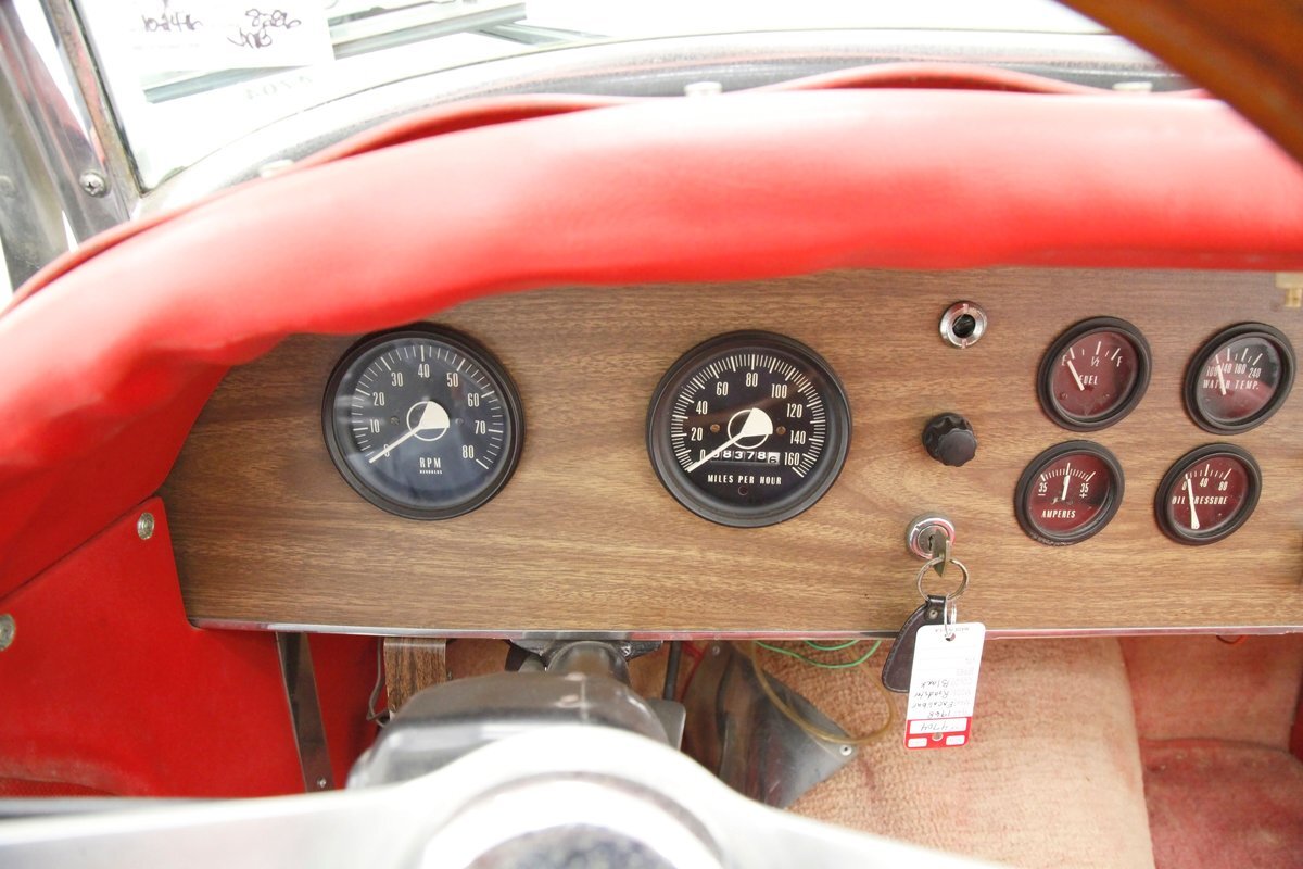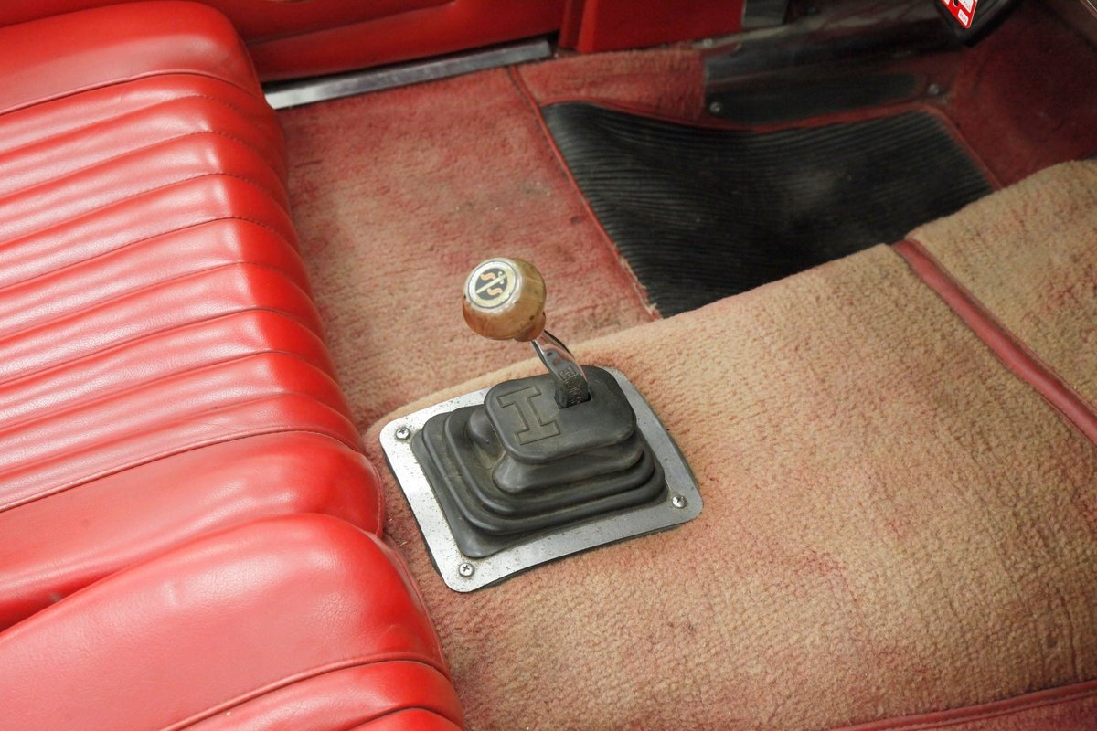 Red red red makes up the interior with red tuck and roll bomber style low back buckets, a rolled red surround on the passenger compartment edges, and stitched red door panels. Walnut veneer is on the dash front, and this sports round black bezel gauges peppering it across the length. A wood rimmed rally style steering wheel fronts the dash. All this floats in a sea of slightly faded red carpeting. In the center hump is a small shaft Hurst shifter.