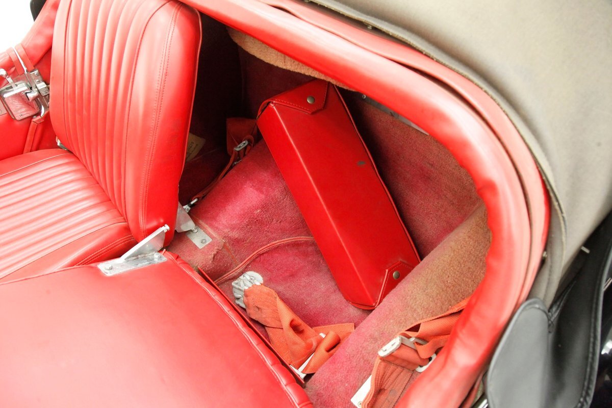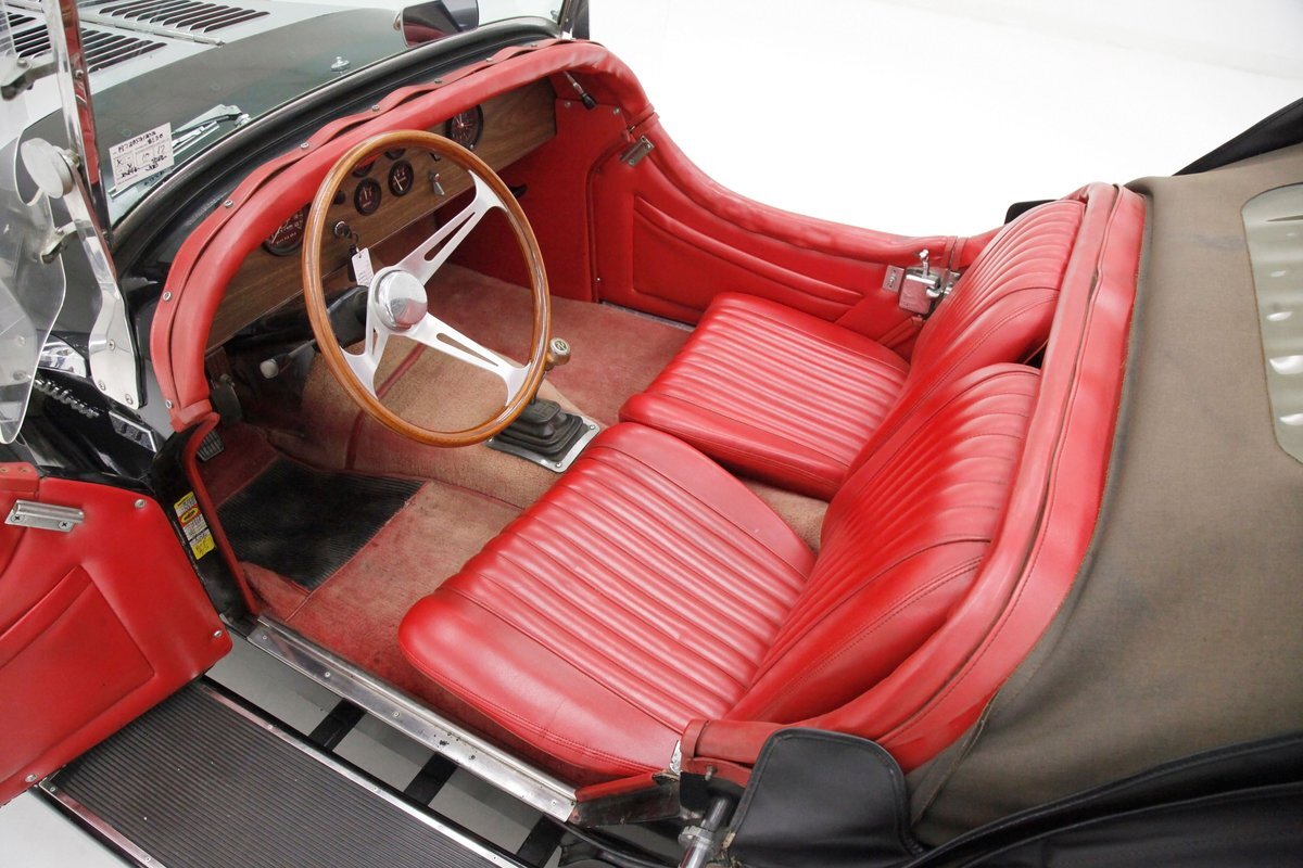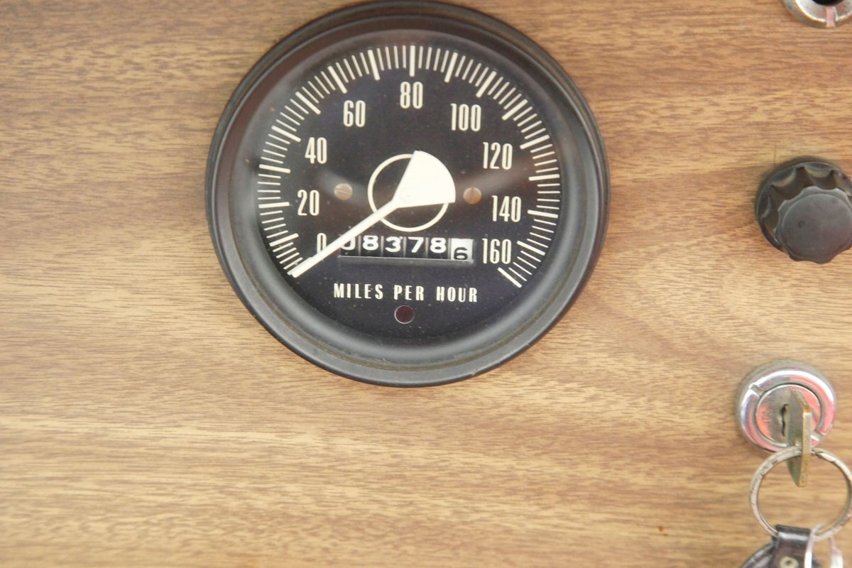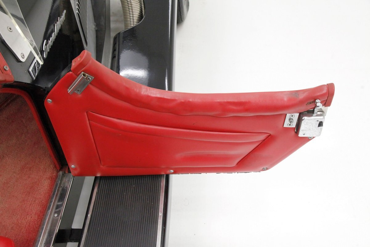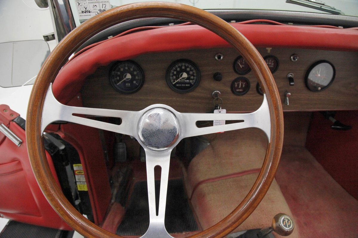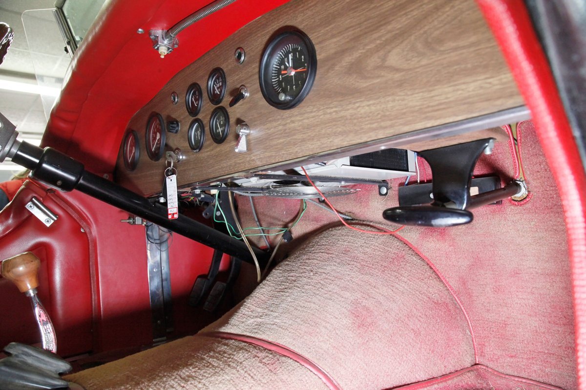 Red red red makes up the interior with red tuck and roll bomber style low back buckets, a rolled red surround on the passenger compartment edges, and stitched red door panels. Walnut veneer is on the dash front, and this sports round black bezel gauges peppering it across the length. A wood rimmed rally style steering wheel fronts the dash. All this floats in a sea of slightly faded red carpeting. In the center hump is a small shaft Hurst shifter.