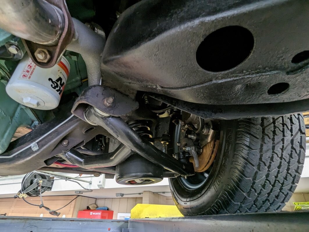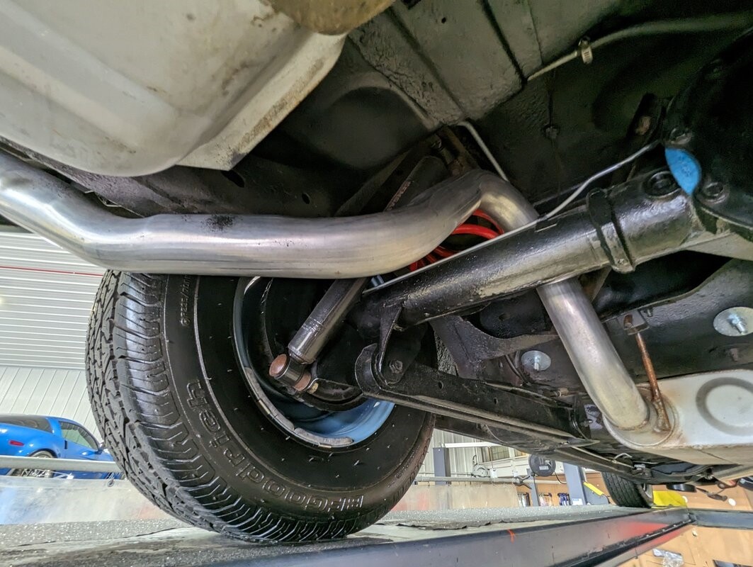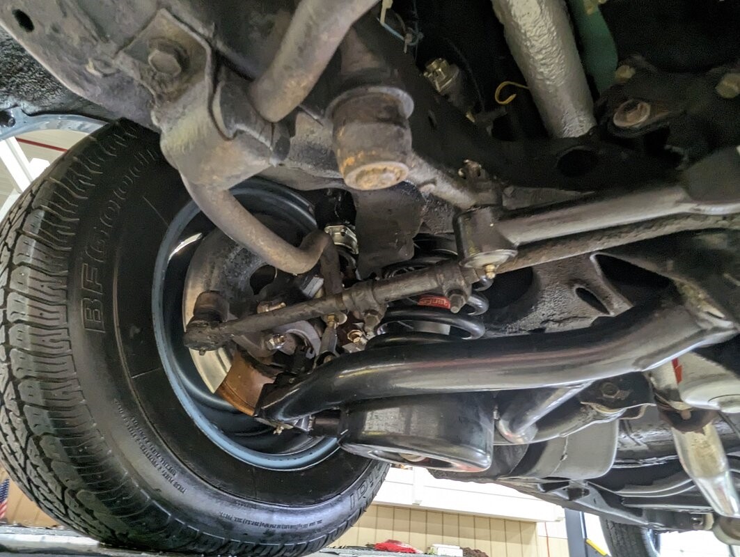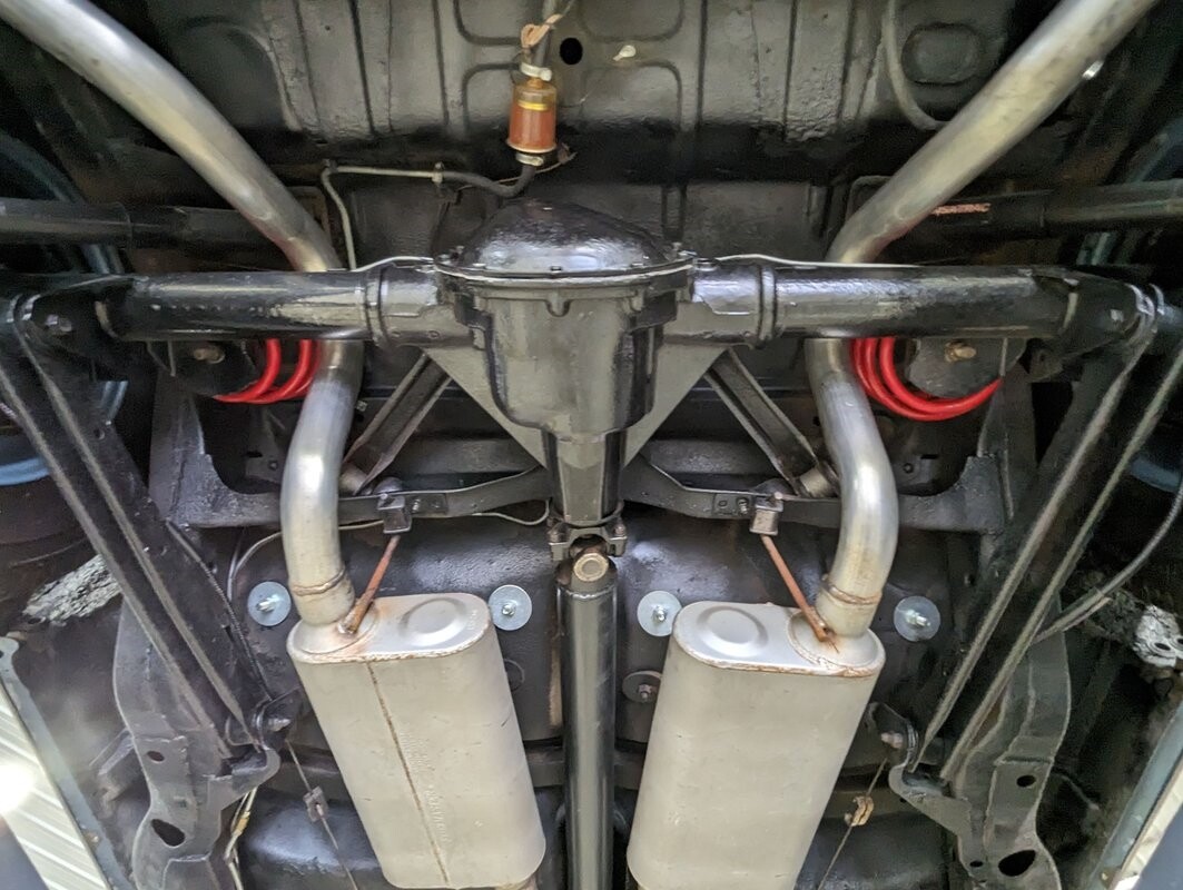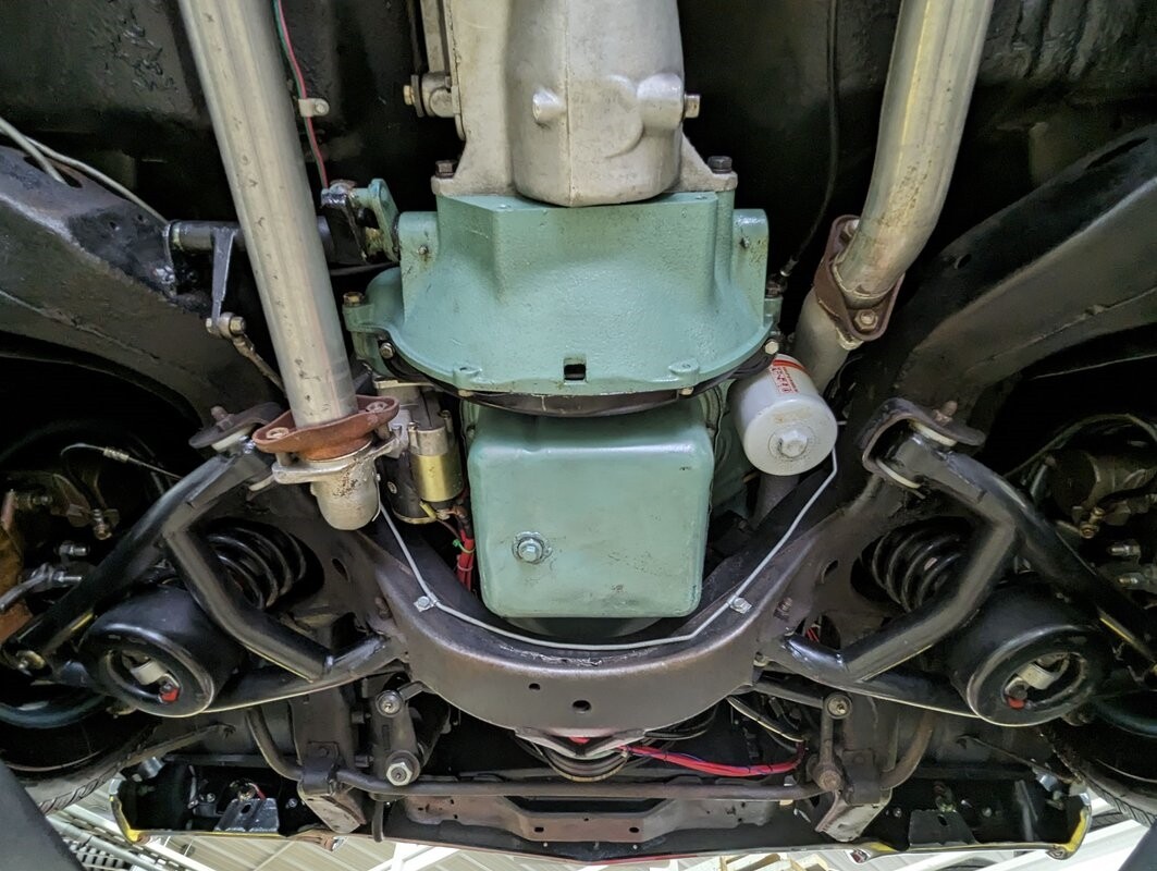 UNDERSIDE: This car has received a detailed restoration then was maintained as needed since completion. It appears that the steering gearbox and center link have been replaced. The front suspension has been upgraded with tubular upper and lower control arms as well as Gas-A-Just coilover shocks. It has a sway bar as well. The rear suspension also looks great with fresh shocks and springs. It has power brakes that are discs up front and drum in the rear, all the lines have been replaced also. It is equipped with a full dual exhaust system that was replaced during restoration and has Flowmaster mufflers. Looking up at the 401 Nailhead V8 engine everything looks clean and correct. Same thing goes for the Muncie M-21 4-speed manual transmission, it looks like it was serviced and does not have any visible leaks. It has a 10 bolt rear end that was neatly painted black. The floors appear to have been undercoated from the factory and freshened up with black paint.