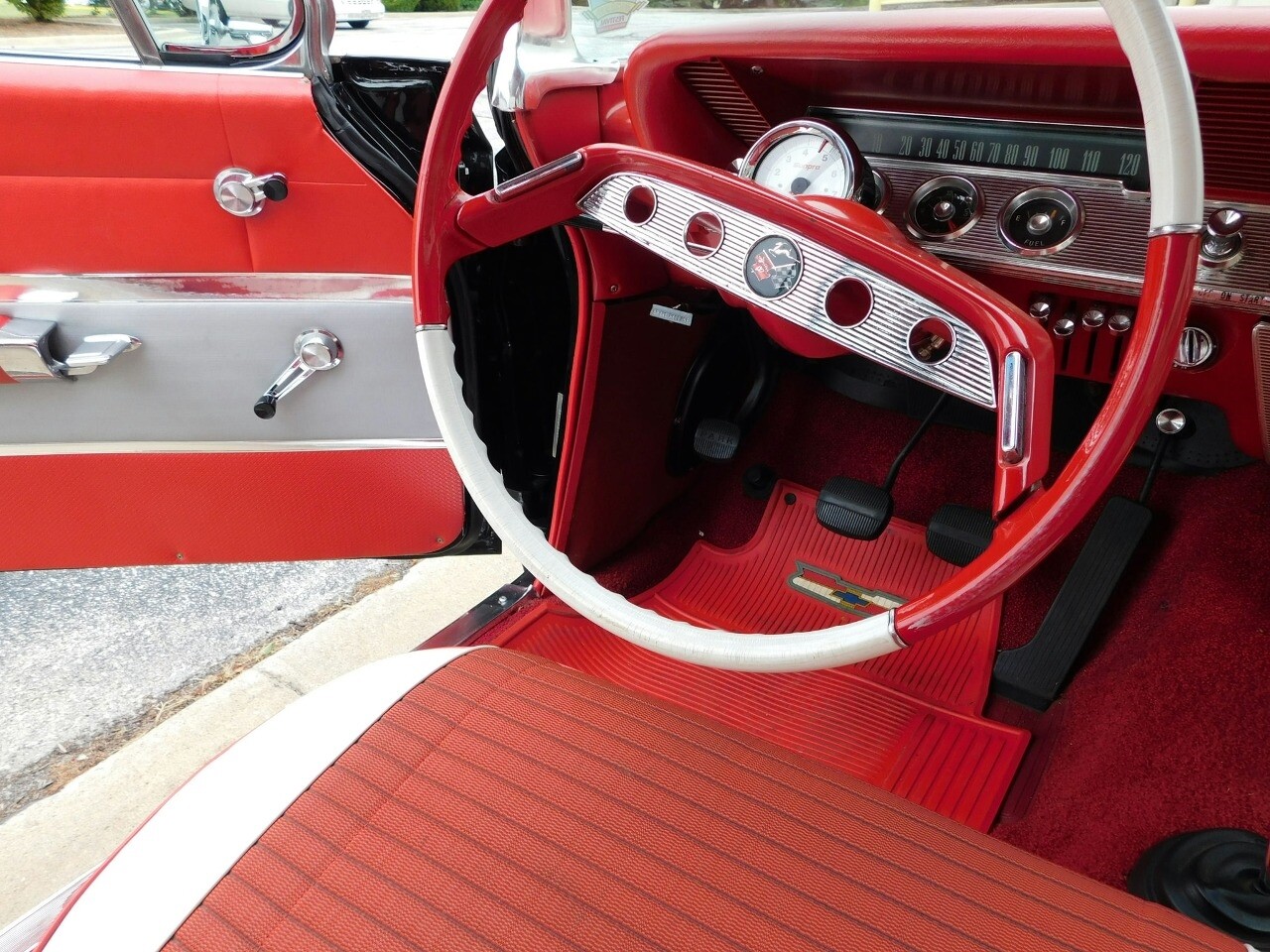 Inside, the Impala offers a captivating red and white interior, a color scheme that complements its exterior. The vibrant red seats and white accents create a visually appealing and inviting cabin, making every drive an experience in nostalgia and comfort. This interior setup not only speaks to the car's classic roots but also ensures a comfortable and enjoyable ride for both driver and passengers.