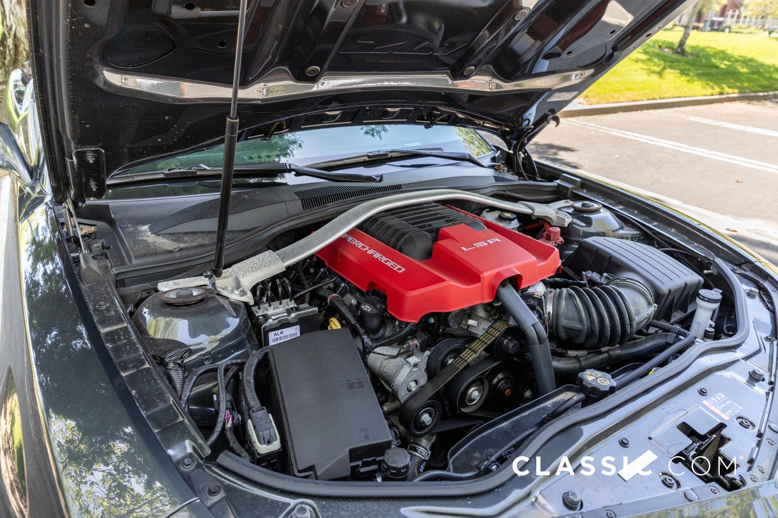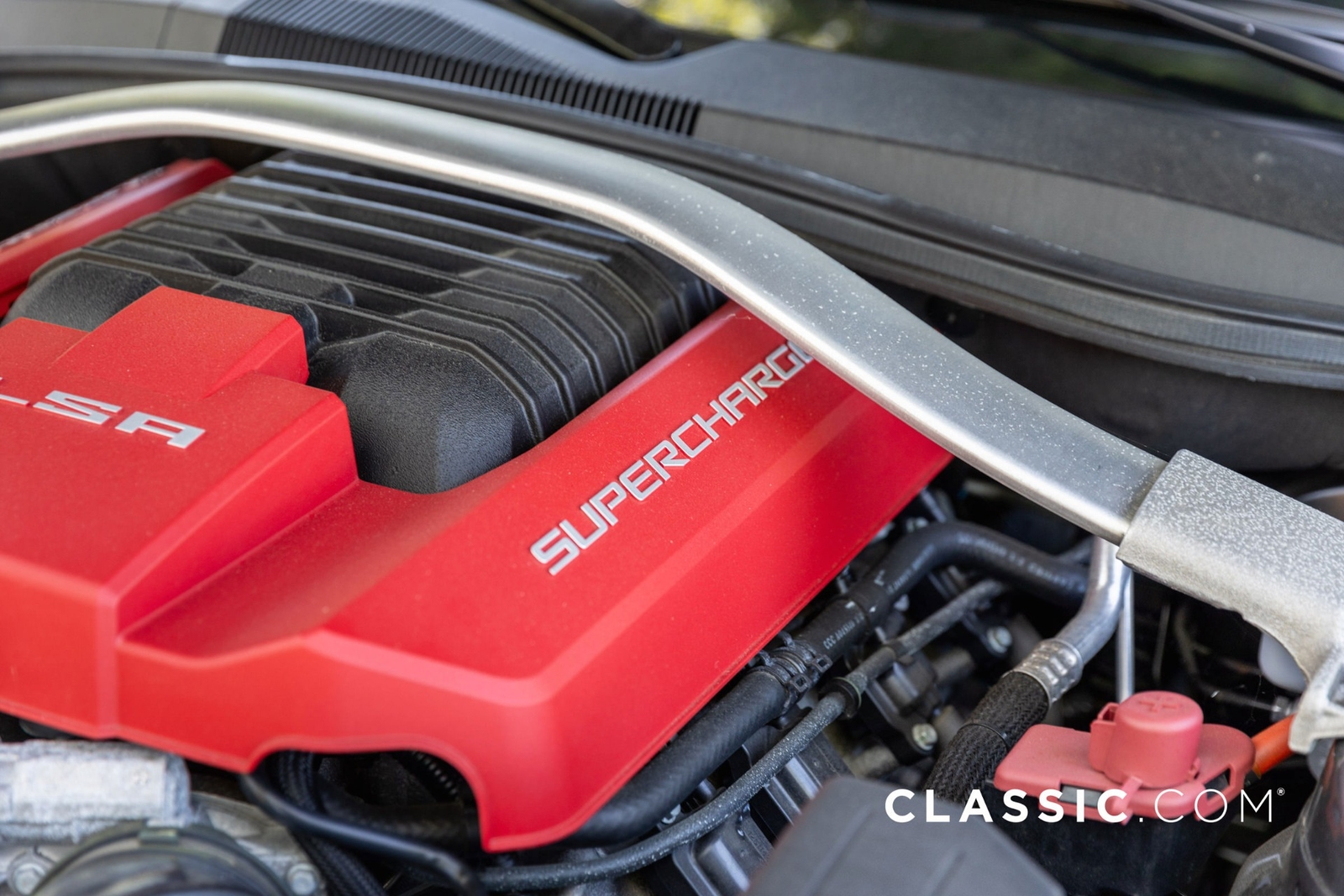 A supercharged 6.2L V8 that sends 580 hp to the rear wheels through a 6-speed manual transmission.