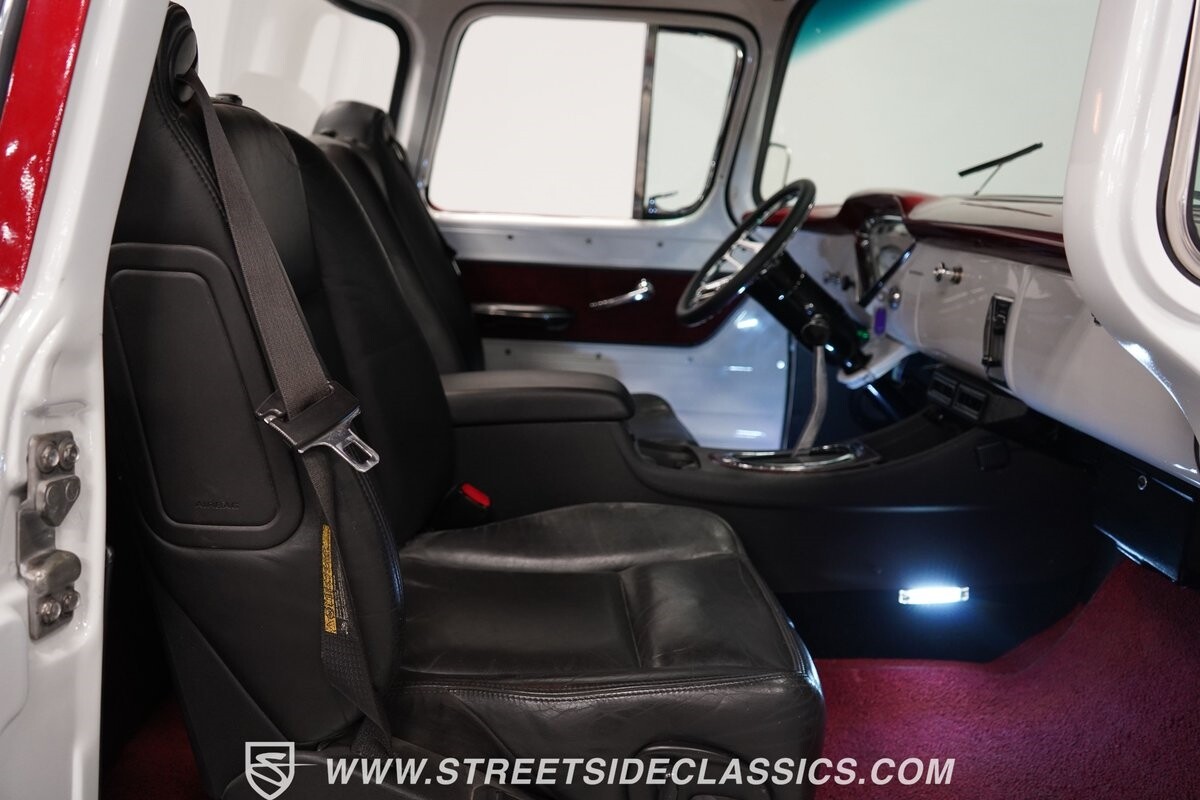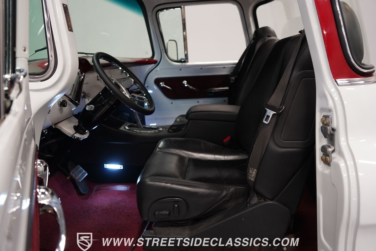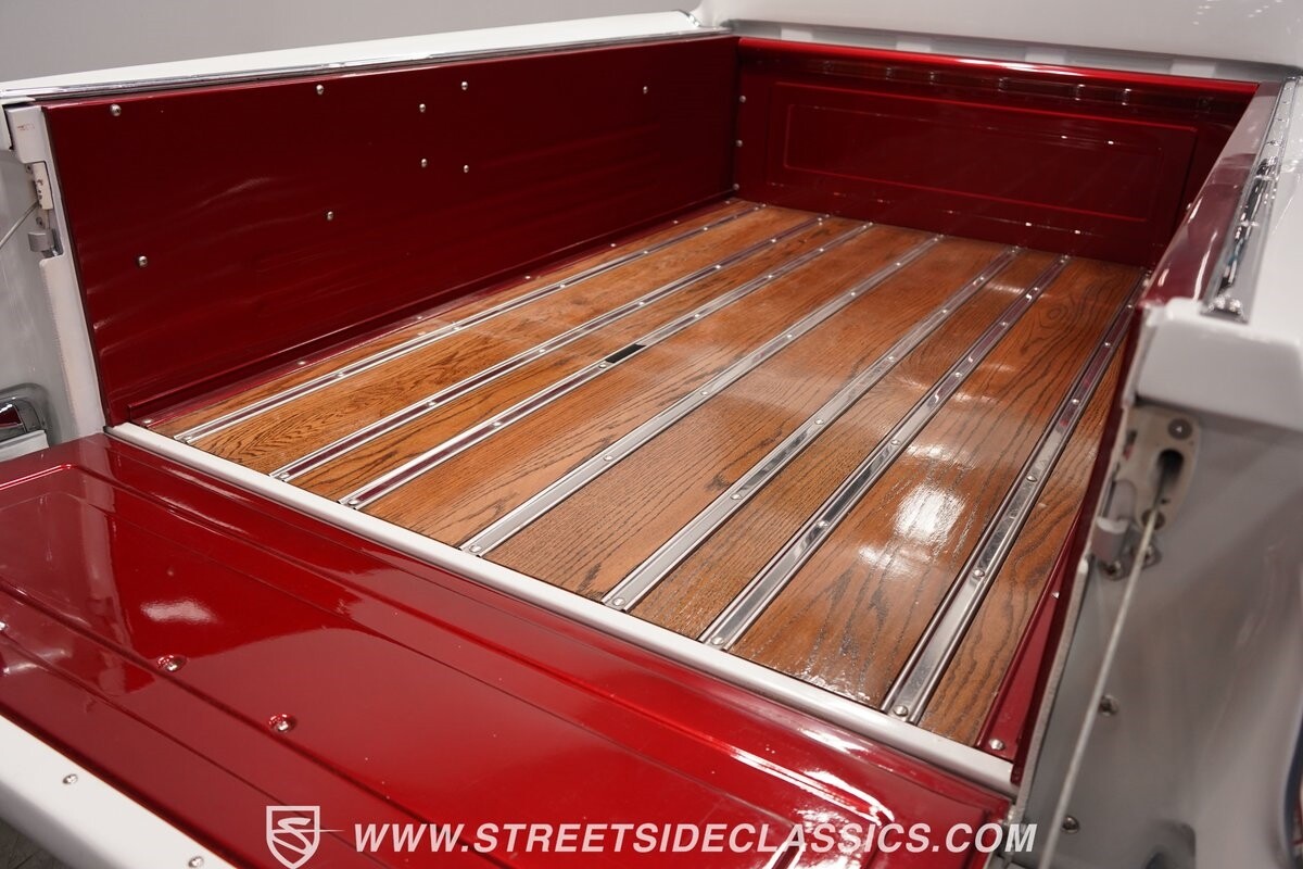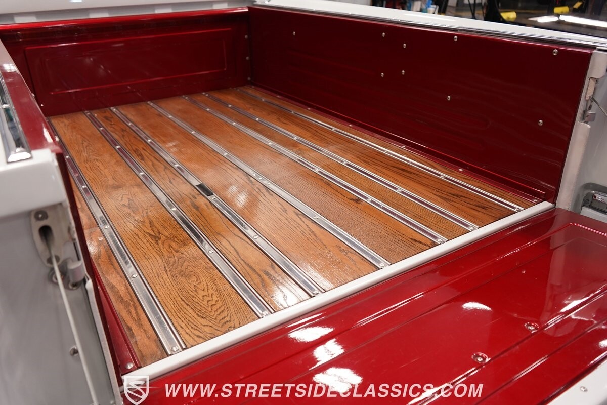 The wraparound rear glass lets in plenty more light to show off this truck's full custom interior. It's quite attractive where the white and red two-tone from the exterior continues with an intricate intertwining on the dash, doors, carpet, and headliner. And it takes to heart the idea that the Cameo was built to be a more comfortable pickup - including an armrest center console, cup holders, an AM/FM/CD stereo, and cold-blowing air conditioning. And this is certainly an upgraded driver with modern bucket seats that power adjust, a tilt steering column, and a full set of Classic Instruments readouts with tach.