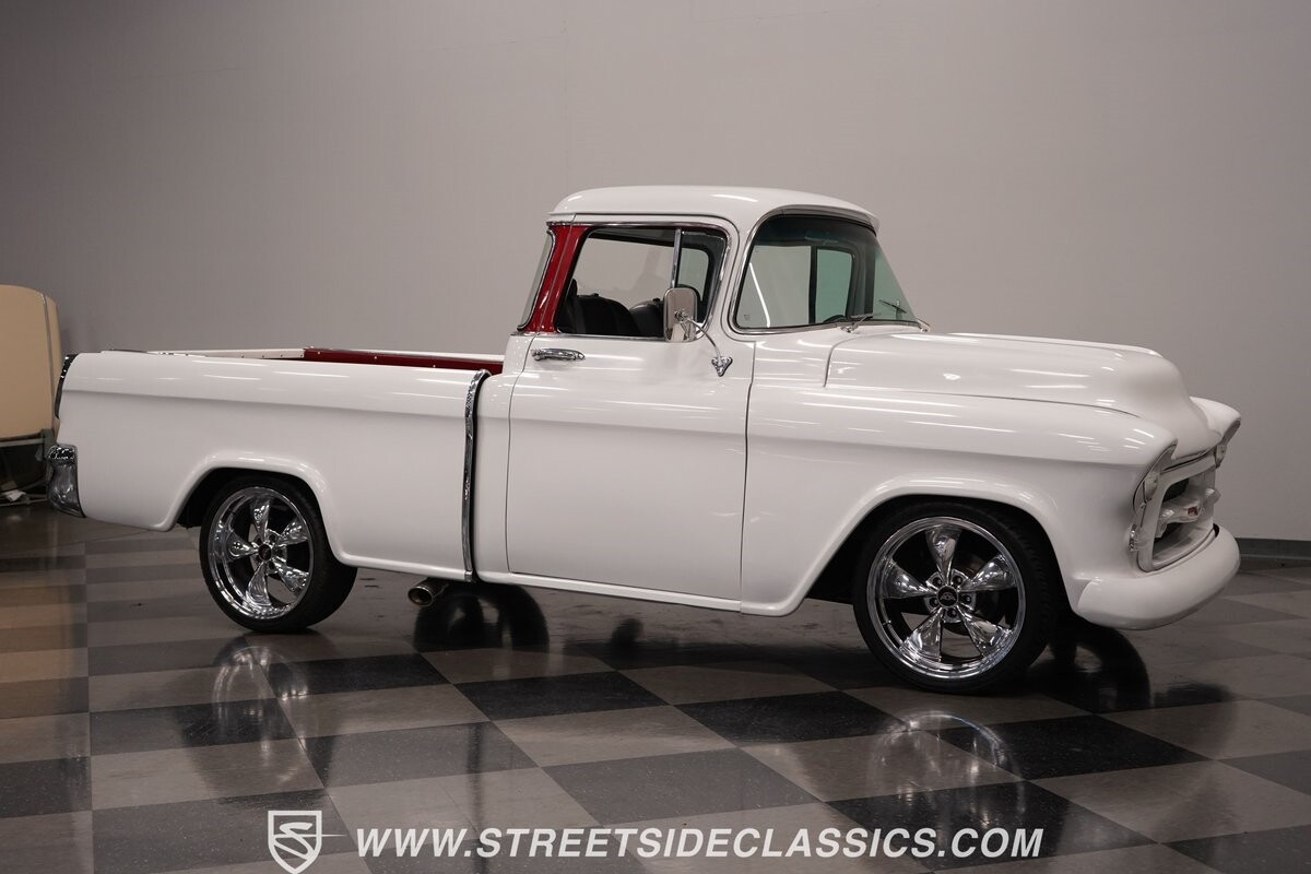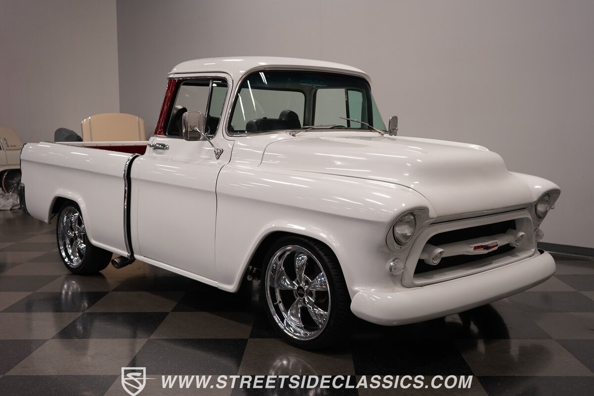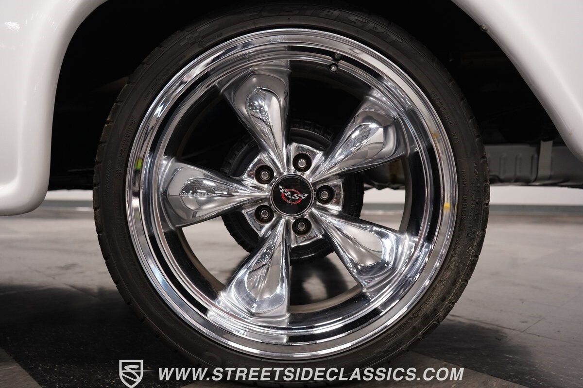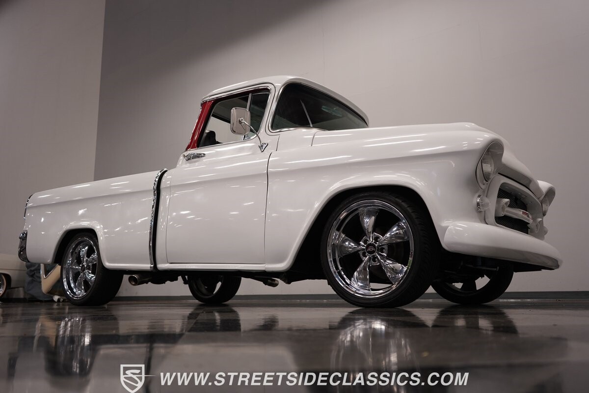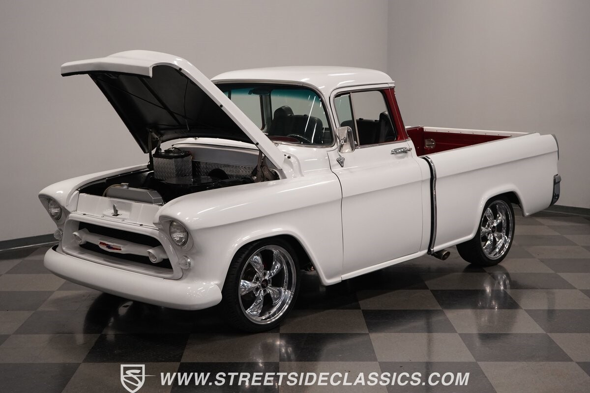 Today we all want a premium pickup, but this market was only just emerging in the 1950s. Chevrolet recognized this and launched the Cameo Carrier in 1955. The flush-fitting bed and revised tailgate were created by utilizing the fiberglass knowledge from the Corvette line. It had full sweeping trim with an integrated hint of two-tone color around the big back window, and there's a tailfin design to make this as attractive as the '55 Bel Air. We're particularly fond of the way the paint is done on this one. It's the correct white color and there's a creamy smoothness thanks to the deleted badge, a custom grille, and a color-matched front bumper. The hint of red wrapping around the rear has a nice metallic radiance, and so the matching bed walls (a signature Cameo feature) look almost like they're glowing. Beautiful real wood in the truck bed, shining 20-inch alloys, and a '57 hood are all part of the impressive touches that make this Cameo even more distinct.