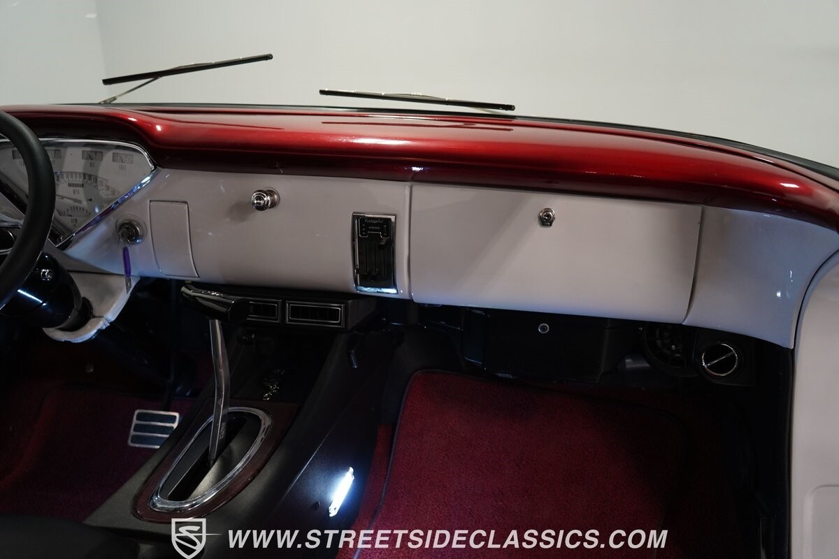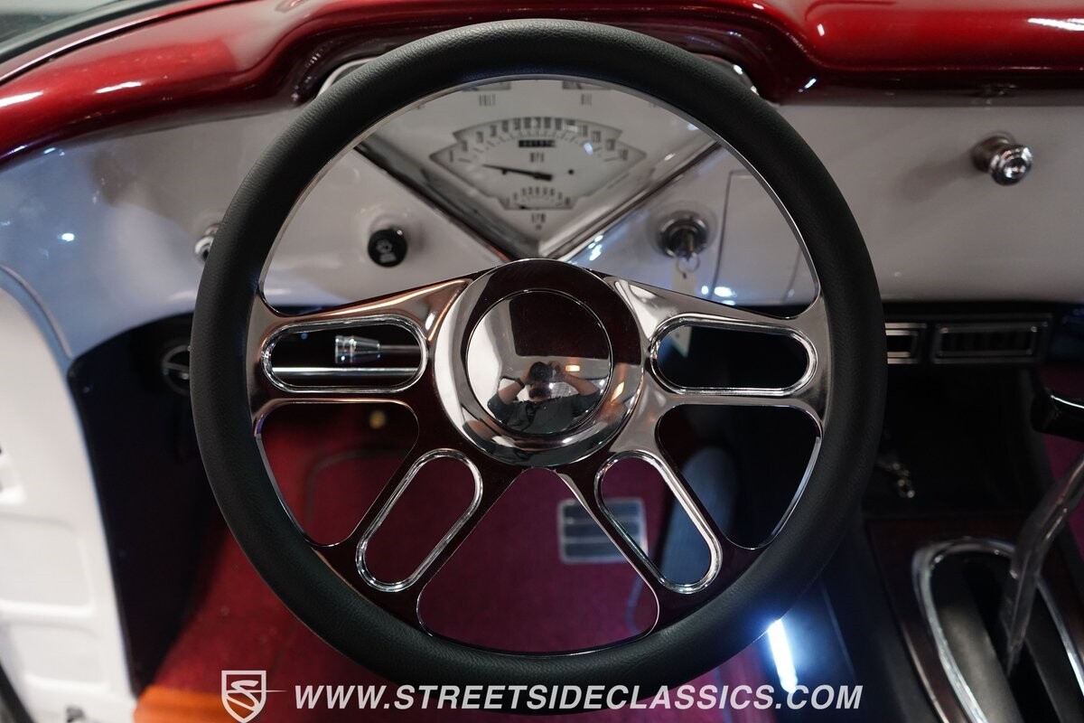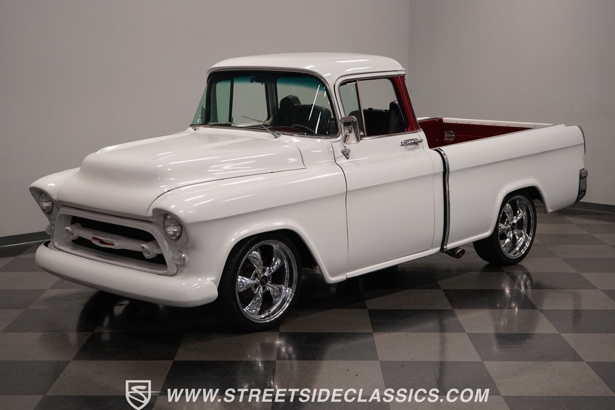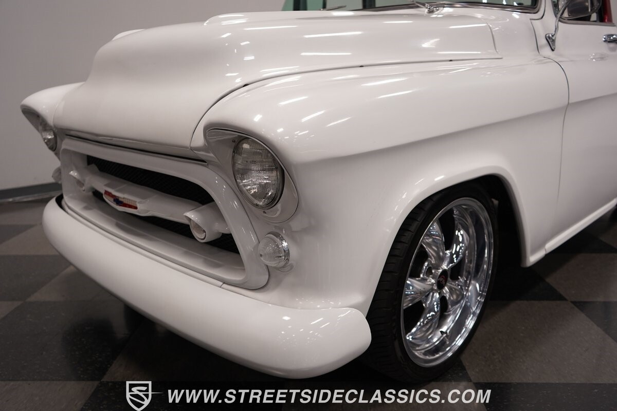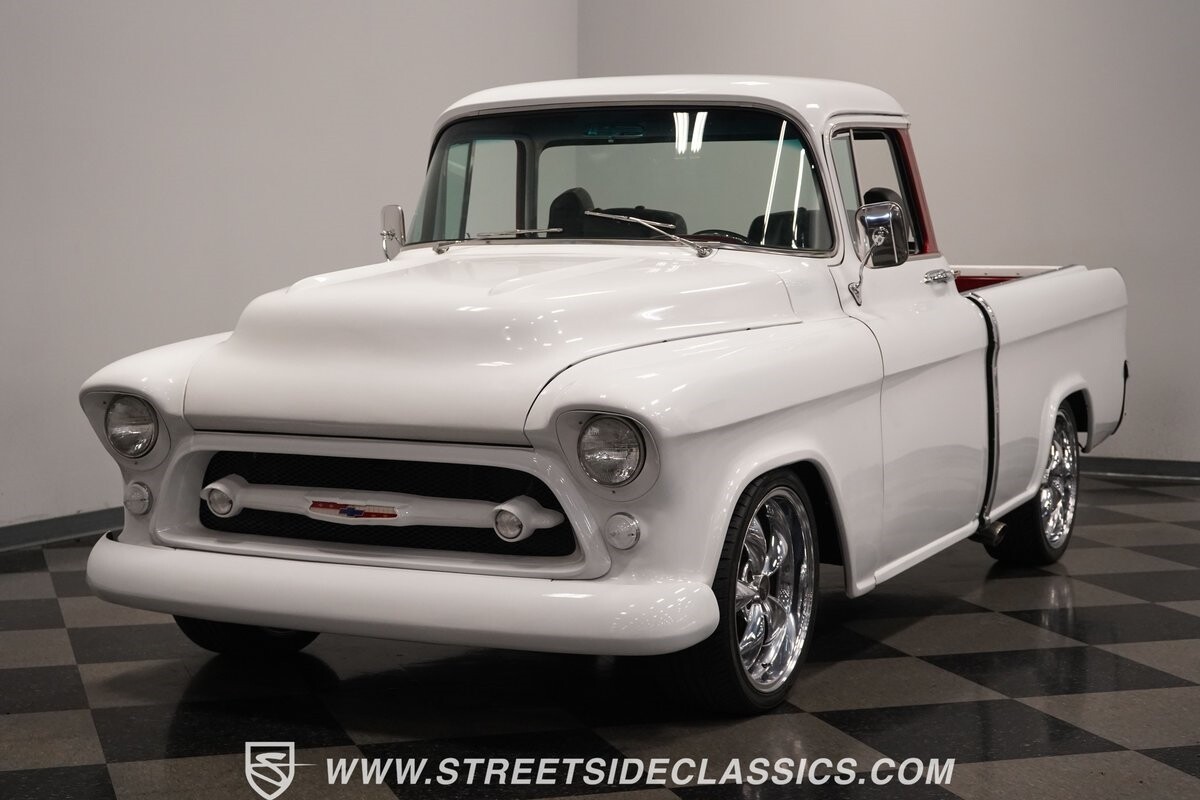 Today we all want a premium pickup, but this market was only just emerging in the 1950s. Chevrolet recognized this and launched the Cameo Carrier in 1955. The flush-fitting bed and revised tailgate were created by utilizing the fiberglass knowledge from the Corvette line. It had full sweeping trim with an integrated hint of two-tone color around the big back window, and there's a tailfin design to make this as attractive as the '55 Bel Air. We're particularly fond of the way the paint is done on this one. It's the correct white color and there's a creamy smoothness thanks to the deleted badge, a custom grille, and a color-matched front bumper. The hint of red wrapping around the rear has a nice metallic radiance, and so the matching bed walls (a signature Cameo feature) look almost like they're glowing. Beautiful real wood in the truck bed, shining 20-inch alloys, and a '57 hood are all part of the impressive touches that make this Cameo even more distinct.
