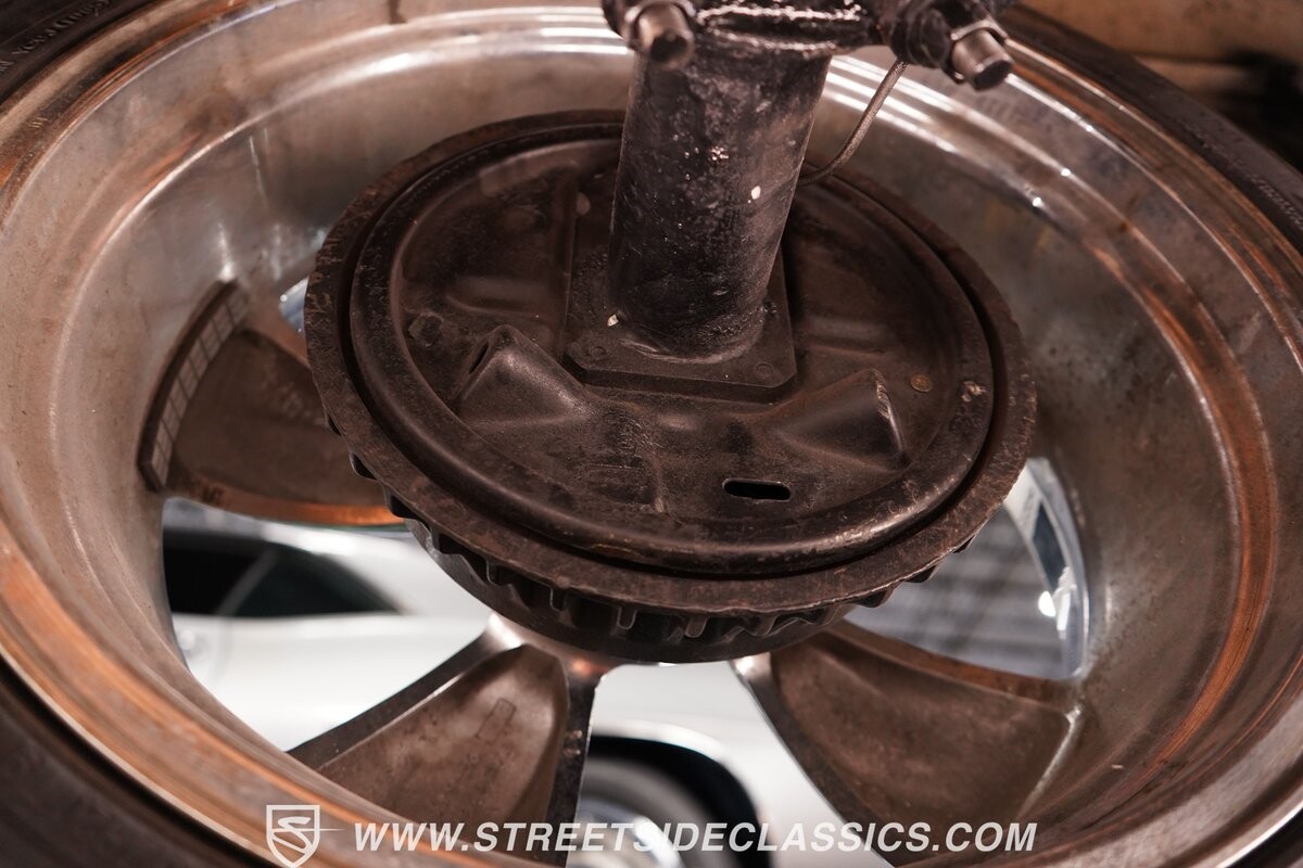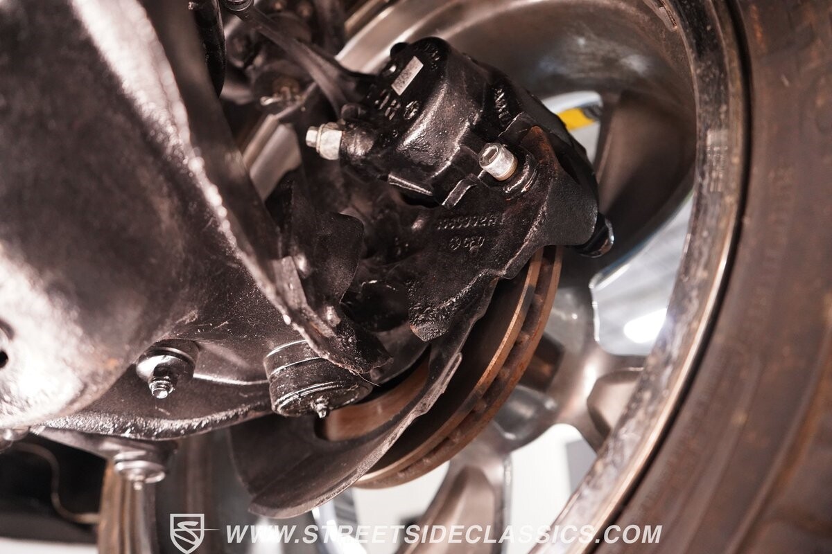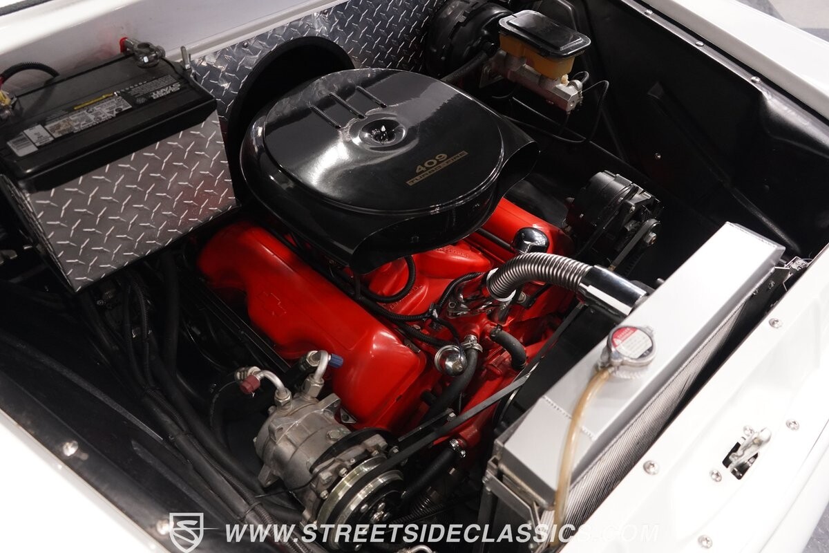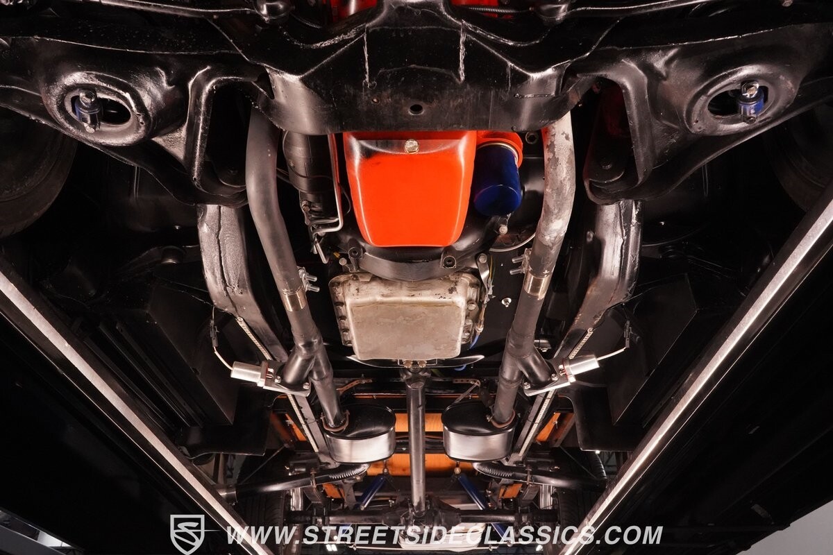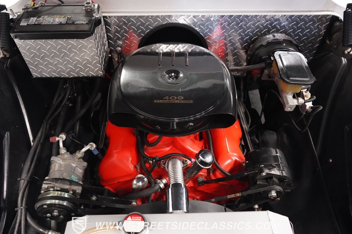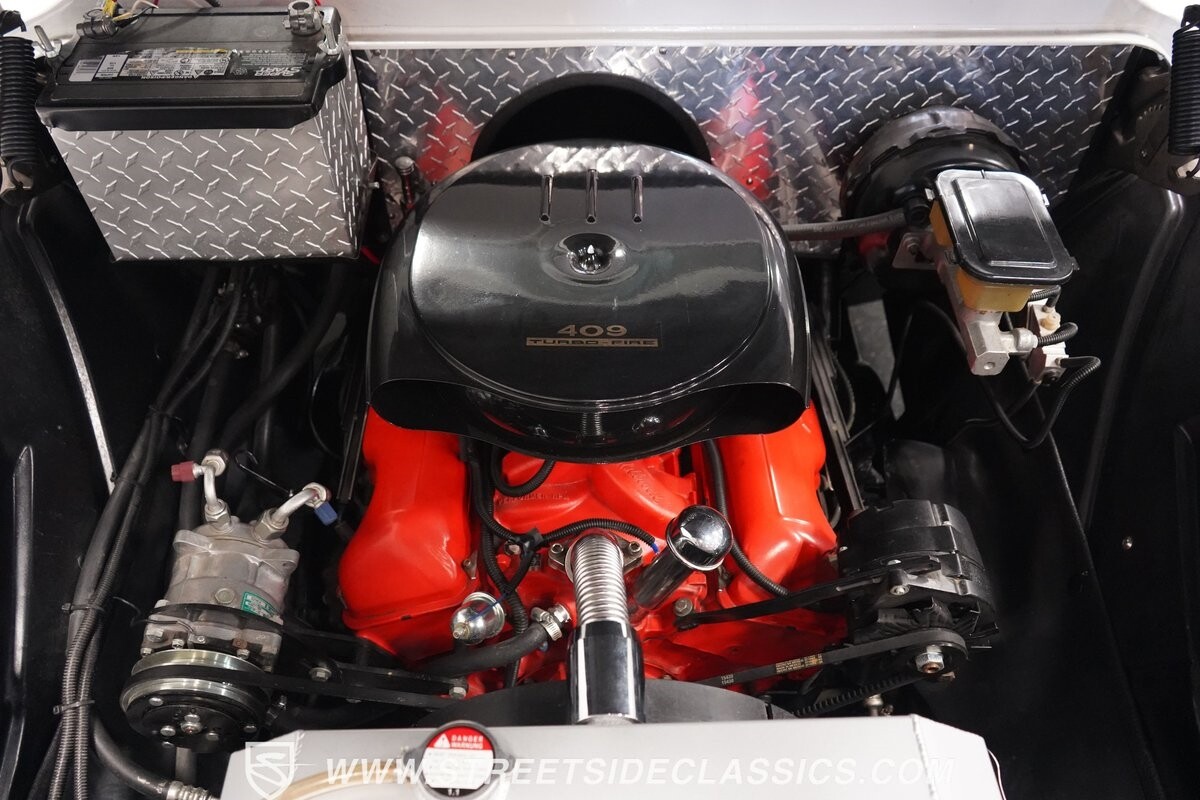 The show-ready style of this truck continues under the hood. The dark inner walls of the engine bay show off cool old-school details like the hot rod air grabber and the unique valve covers that signal this was the first of the Chevy big blocks. This 348 cubic-inch V8 includes upgrades like an Edelbrock four-barrel carburetor, an Edelbrock intake, and an updated aluminum radiator. It's a strong powerhouse that makes a sweet tune out of the side-exit dual exhaust. And when you really want some extra rumble, there are electric cutouts ahead of the mufflers. As you look at the full undercarriage photos, you see more of the clean style that gives you added confidence on the road. And with power steering, power brakes, front discs, and modern sport tires, this truck was made to be driven. You even have an upgraded four-speed automatic transmission with overdrive.