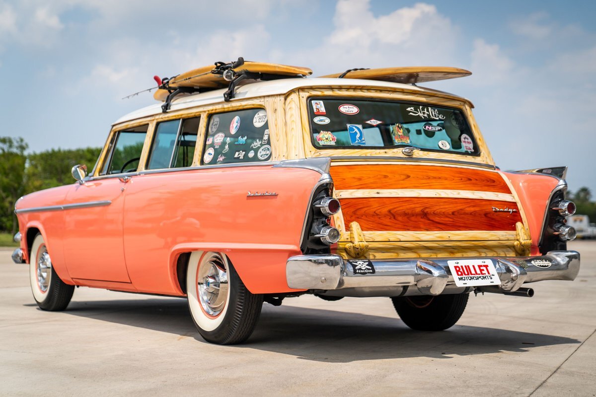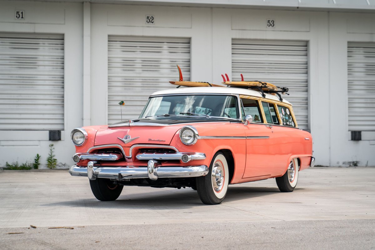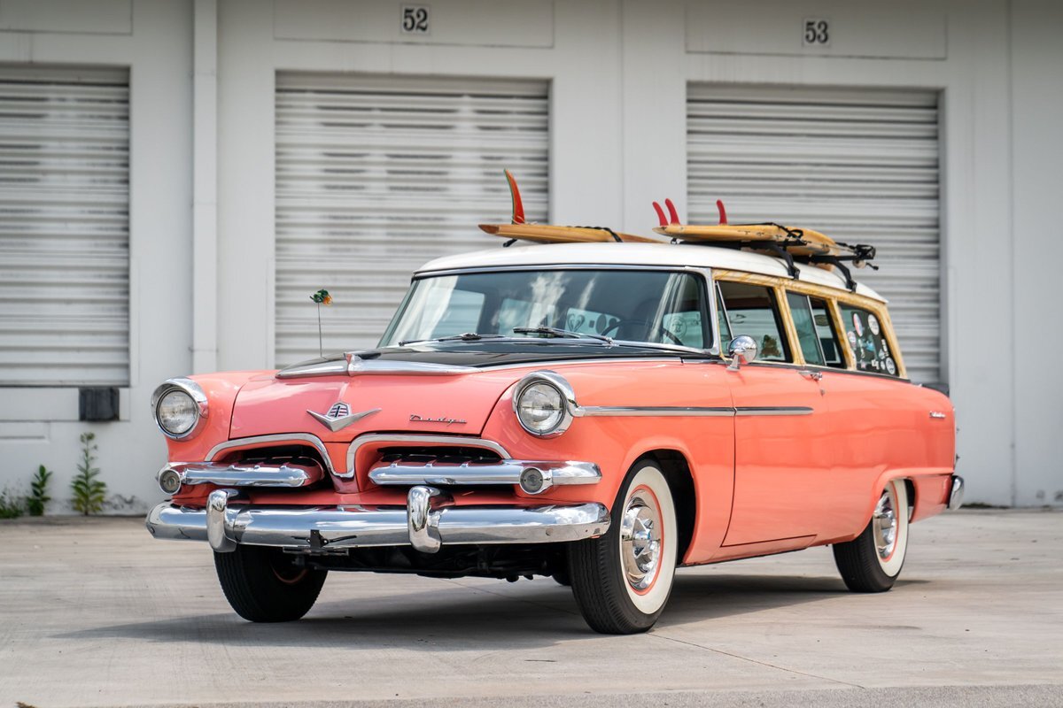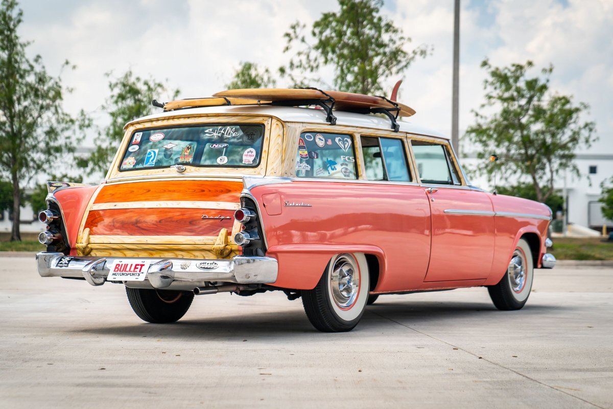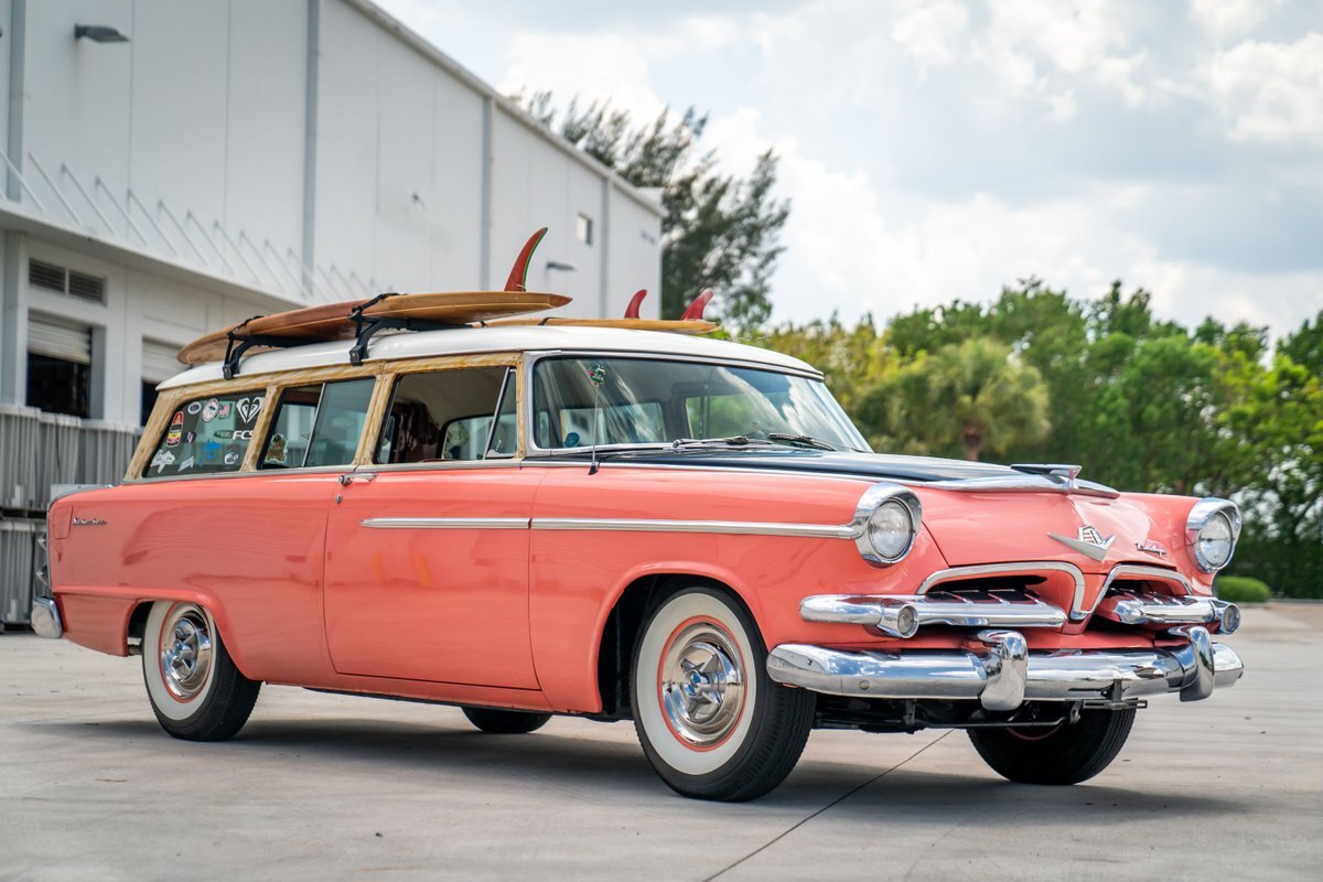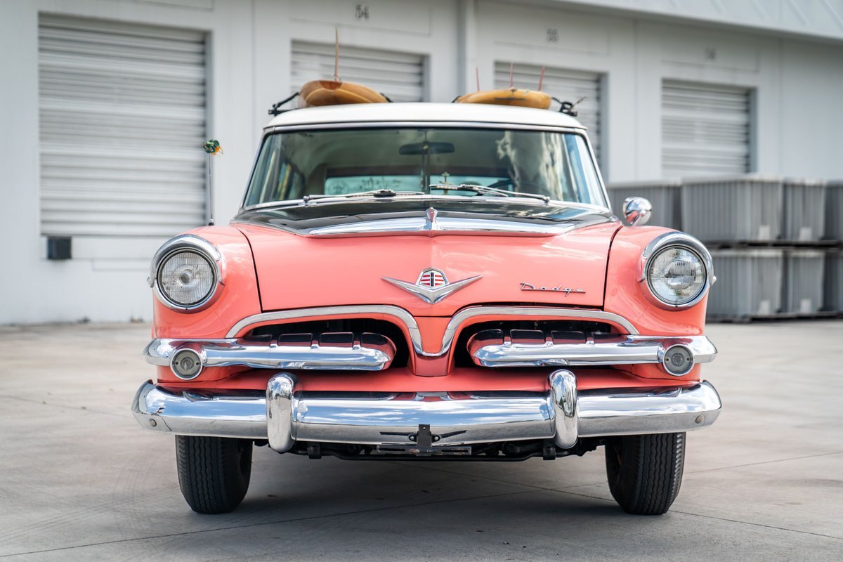 This 1955 Dodge Coronet Suburban is a two-door station wagon that was purchased new from John Drew Motors of Sacramento, California, in August 1955. Powered by a 230ci inline-six paired with a two-speed automatic transmission, the vehicle has been refinished in pink with a white roof plus woodgrain-style and black painted accents. Presale service performed and described below. This six-passenger Dodge wagon is now offered with 1955 purchase paperwork, manufacturer's literature, expired registration cards, recent service records, removed fender skirts, decorative wooden surfboards, beach chairs, a beach umbrella, vintage suitcases, awards, and a clean Virginia title.