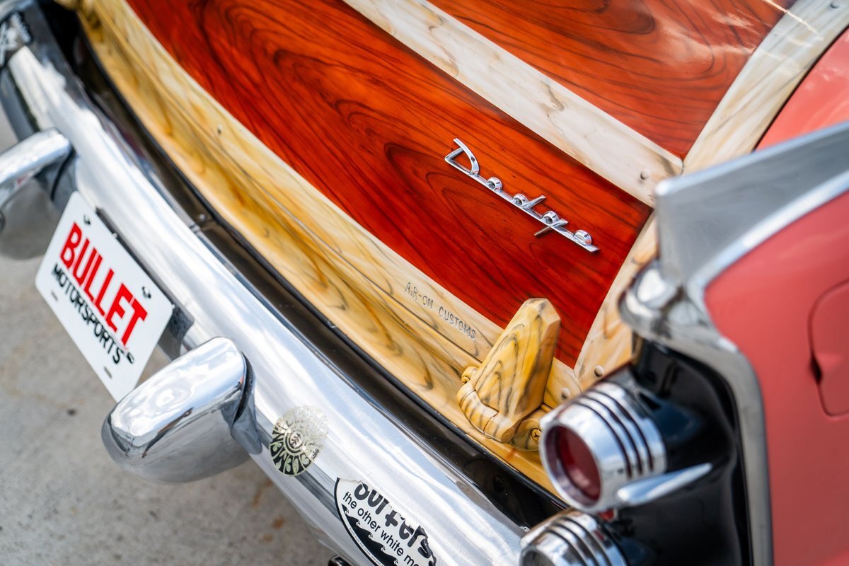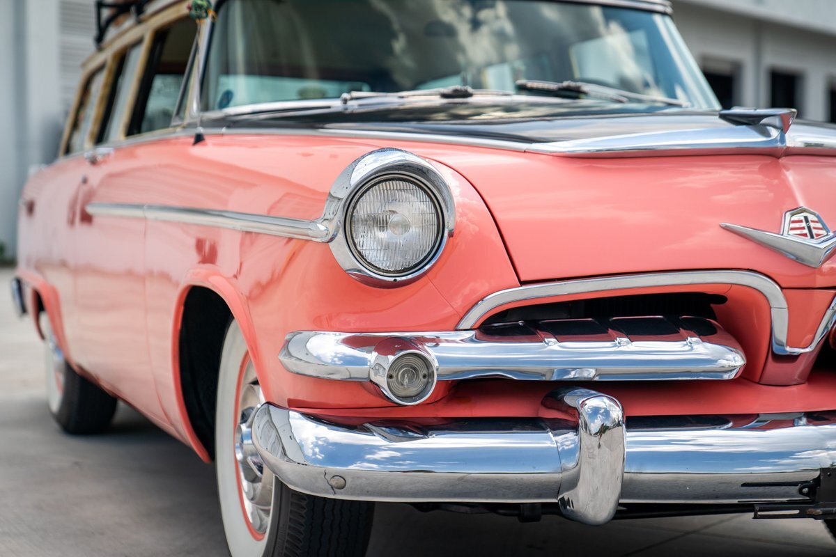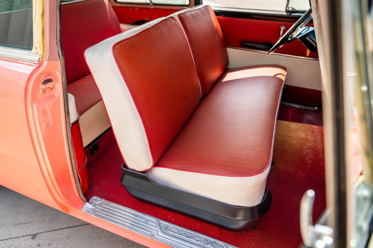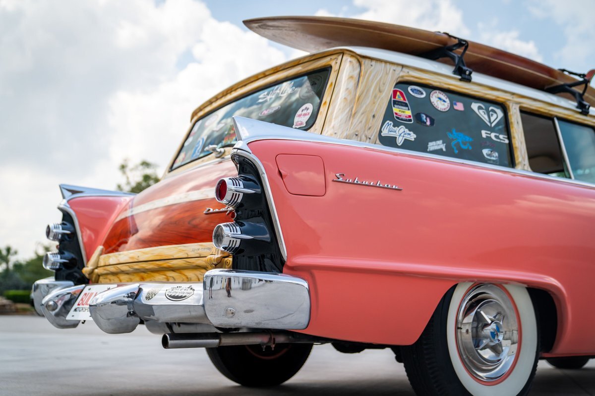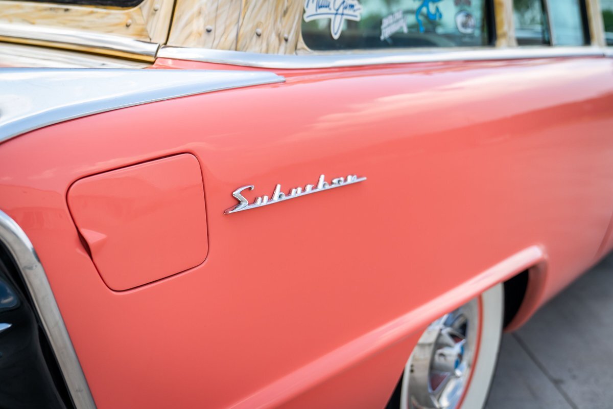 This 1955 Dodge Coronet Suburban is a two-door station wagon that was purchased new from John Drew Motors of Sacramento, California, in August 1955. Powered by a 230ci inline-six paired with a two-speed automatic transmission, the vehicle has been refinished in pink with a white roof plus woodgrain-style and black painted accents. Presale service performed and described below. This six-passenger Dodge wagon is now offered with 1955 purchase paperwork, manufacturer's literature, expired registration cards, recent service records, removed fender skirts, decorative wooden surfboards, beach chairs, a beach umbrella, vintage suitcases, awards, and a clean Virginia title.