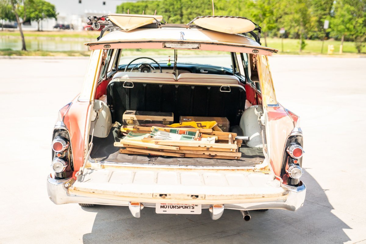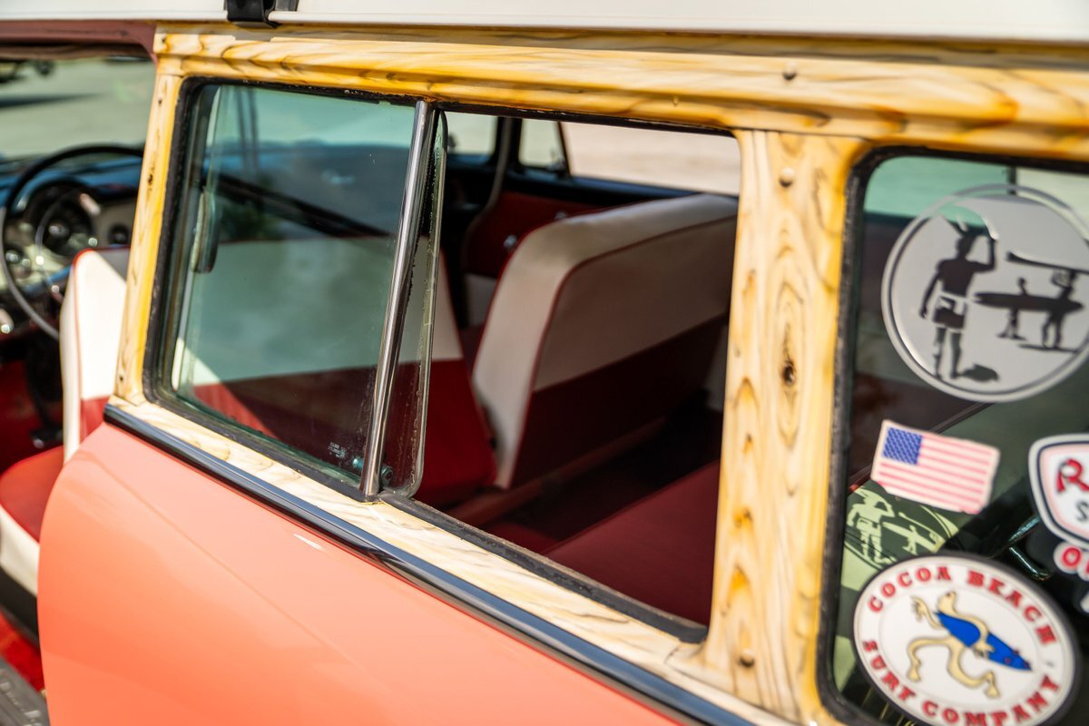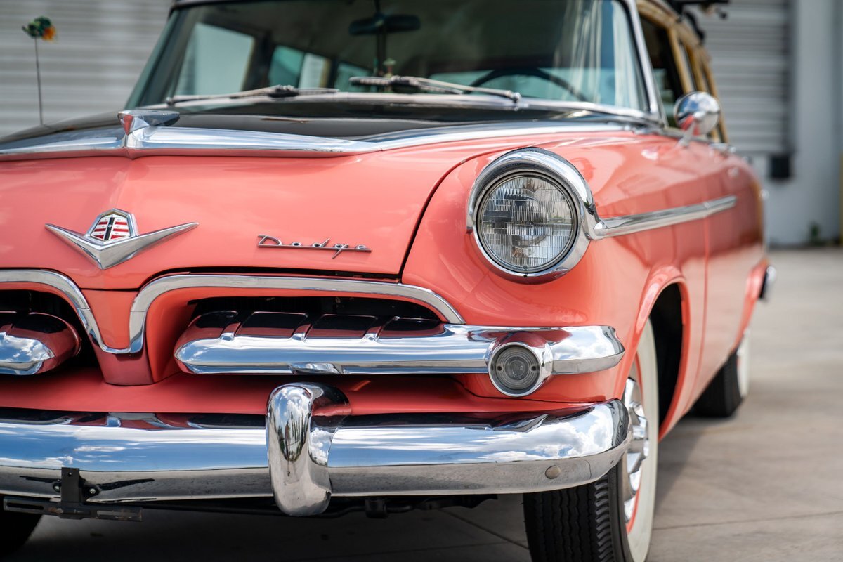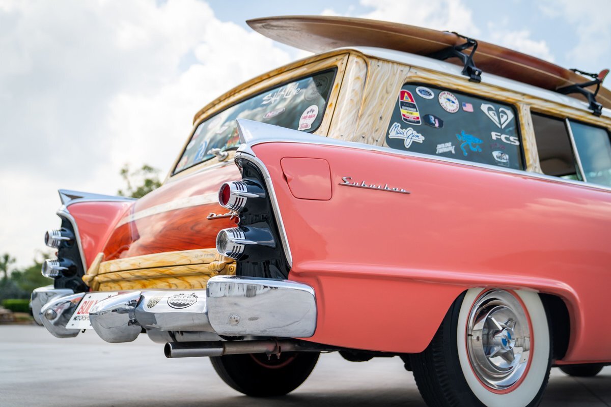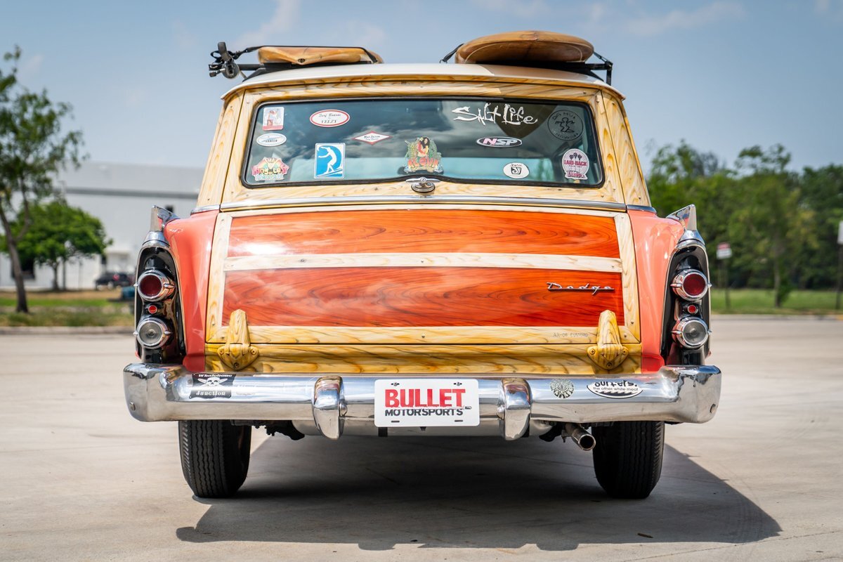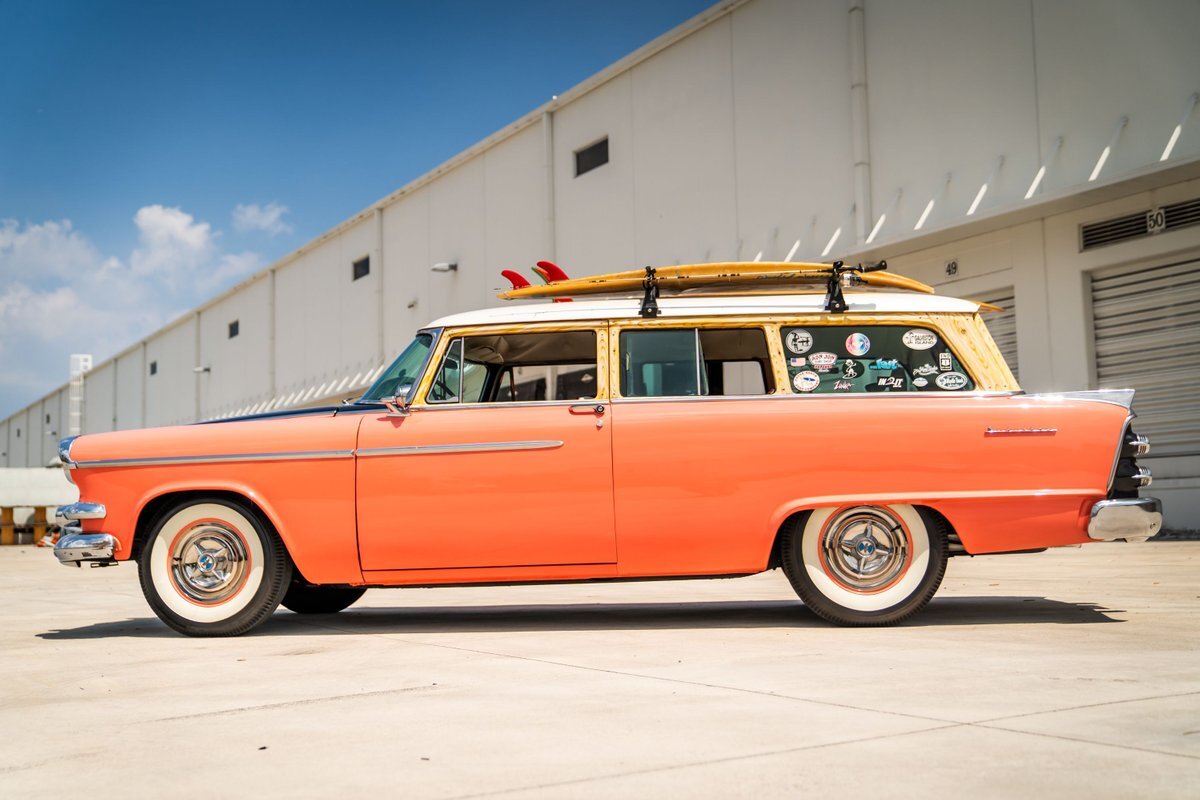 This 1955 Dodge Coronet Suburban is a two-door station wagon that was purchased new from John Drew Motors of Sacramento, California, in August 1955. Powered by a 230ci inline-six paired with a two-speed automatic transmission, the vehicle has been refinished in pink with a white roof plus woodgrain-style and black painted accents. Presale service performed and described below. This six-passenger Dodge wagon is now offered with 1955 purchase paperwork, manufacturer's literature, expired registration cards, recent service records, removed fender skirts, decorative wooden surfboards, beach chairs, a beach umbrella, vintage suitcases, awards, and a clean Virginia title.
