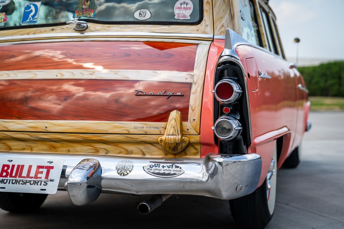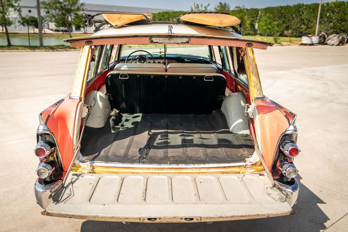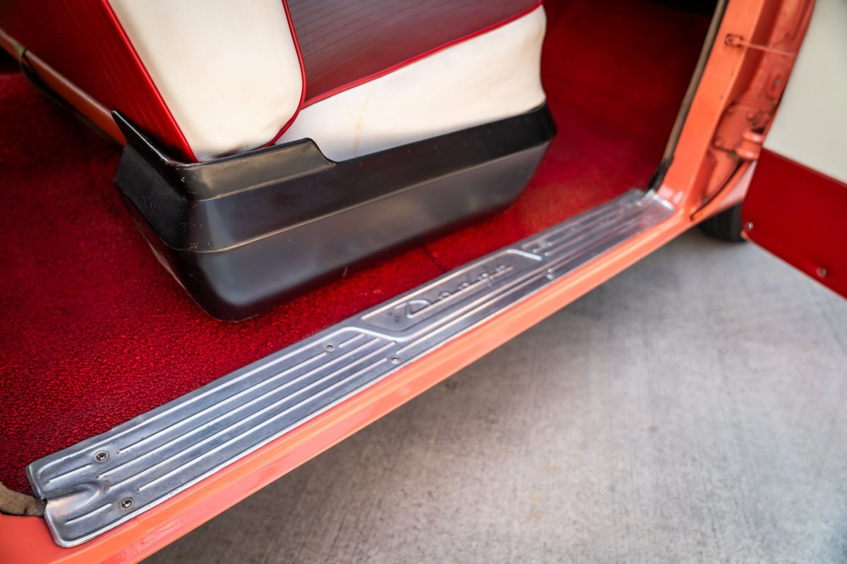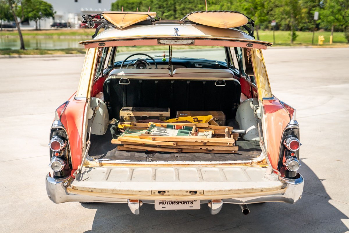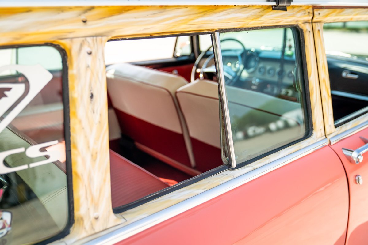 This 1955 Dodge Coronet Suburban is a two-door station wagon that was purchased new from John Drew Motors of Sacramento, California, in August 1955. Powered by a 230ci inline-six paired with a two-speed automatic transmission, the vehicle has been refinished in pink with a white roof plus woodgrain-style and black painted accents. Presale service performed and described below. This six-passenger Dodge wagon is now offered with 1955 purchase paperwork, manufacturer's literature, expired registration cards, recent service records, removed fender skirts, decorative wooden surfboards, beach chairs, a beach umbrella, vintage suitcases, awards, and a clean Virginia title.
