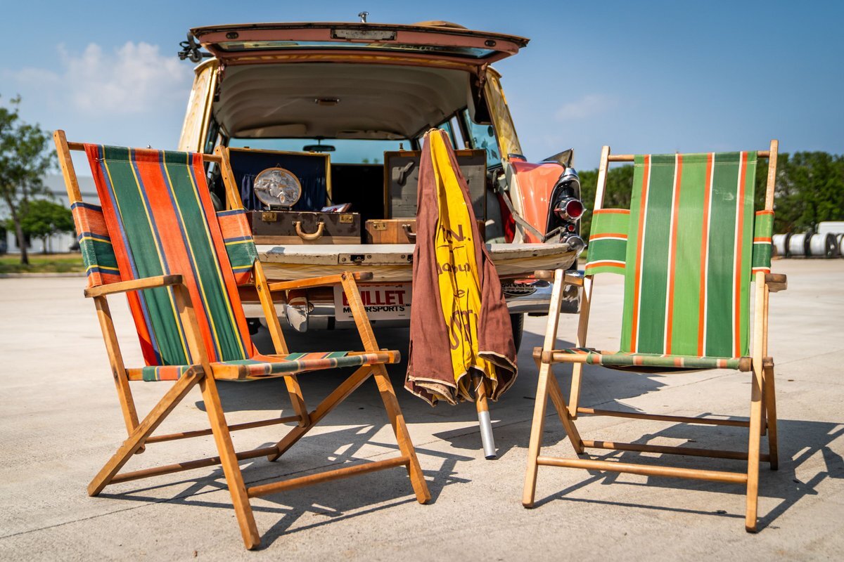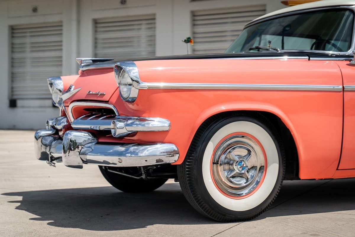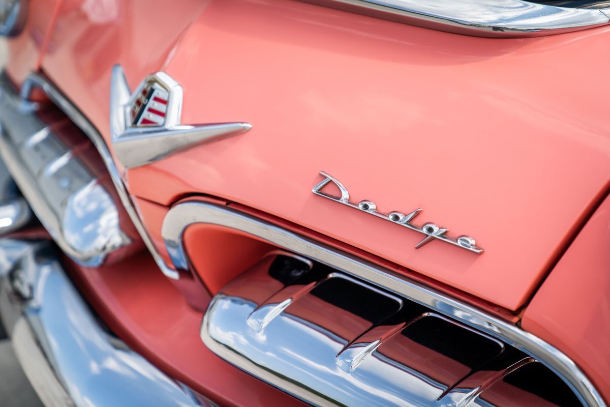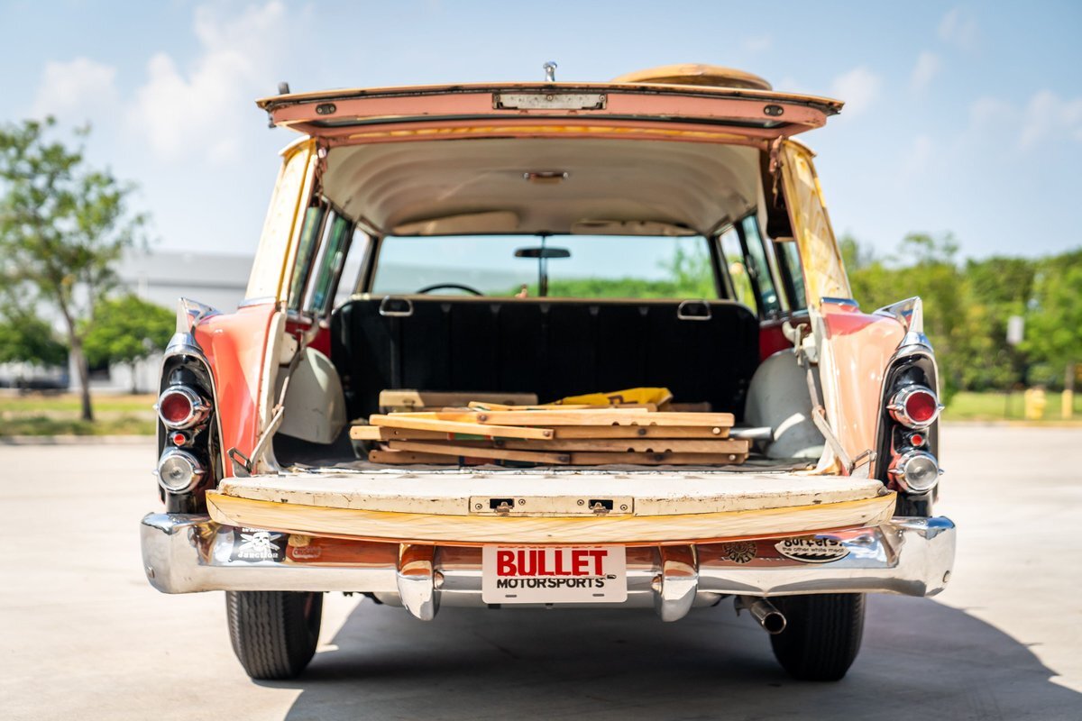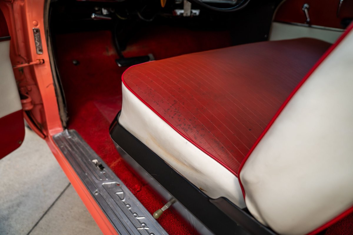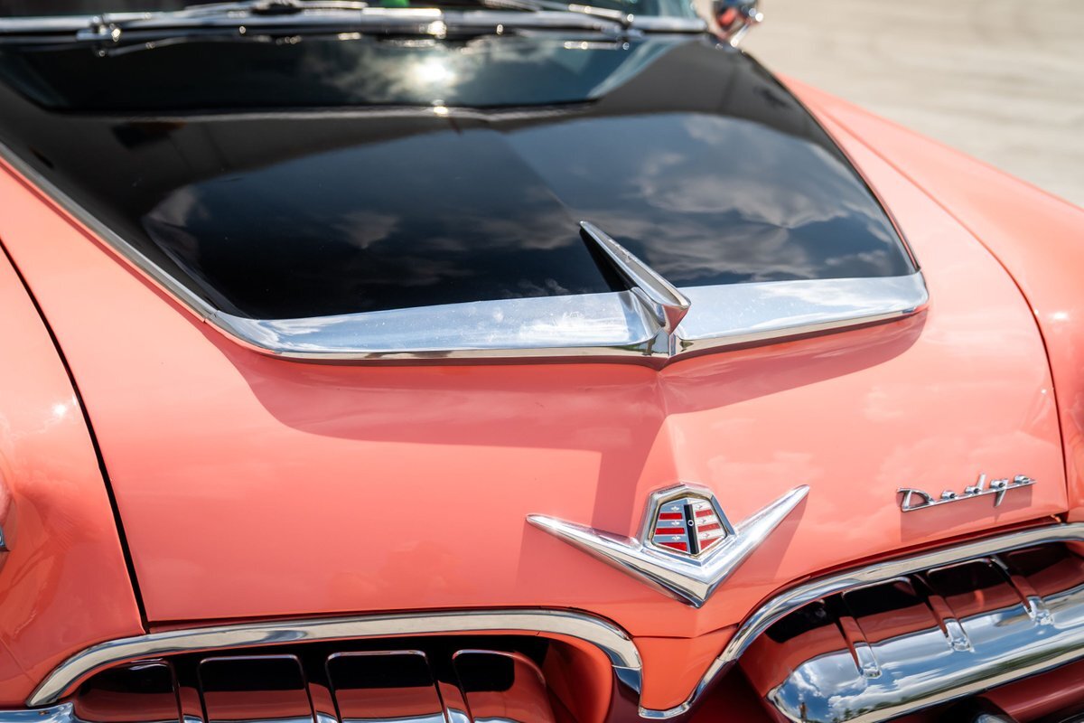 This 1955 Dodge Coronet Suburban is a two-door station wagon that was purchased new from John Drew Motors of Sacramento, California, in August 1955. Powered by a 230ci inline-six paired with a two-speed automatic transmission, the vehicle has been refinished in pink with a white roof plus woodgrain-style and black painted accents. Presale service performed and described below. This six-passenger Dodge wagon is now offered with 1955 purchase paperwork, manufacturer's literature, expired registration cards, recent service records, removed fender skirts, decorative wooden surfboards, beach chairs, a beach umbrella, vintage suitcases, awards, and a clean Virginia title.