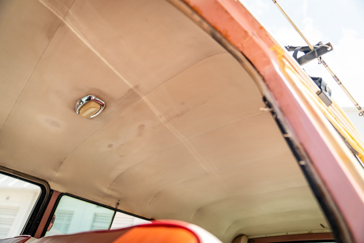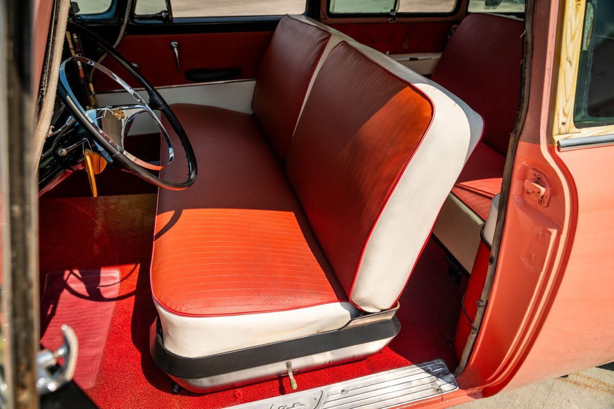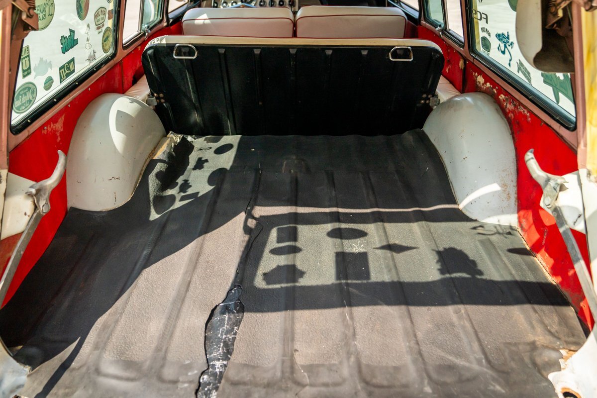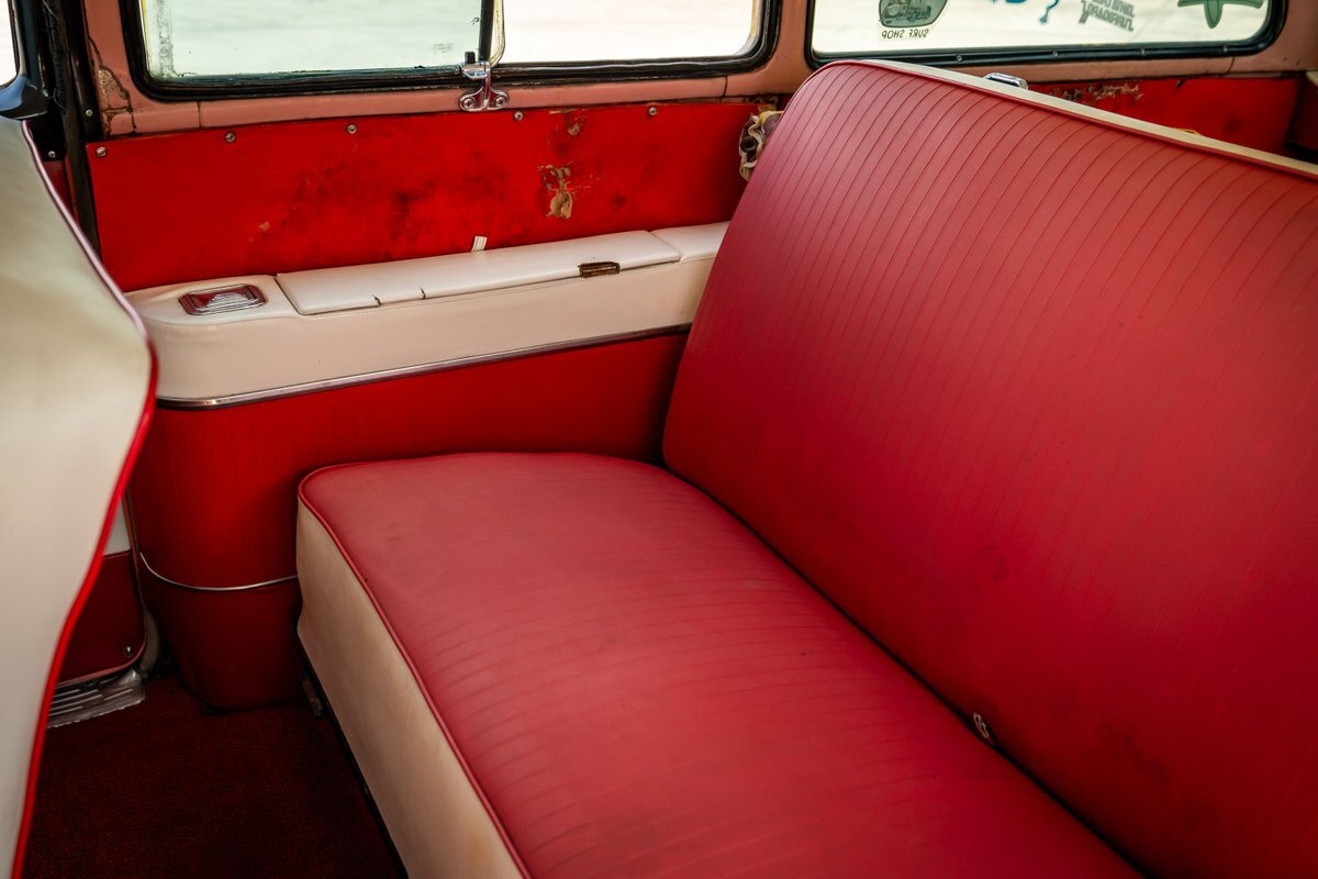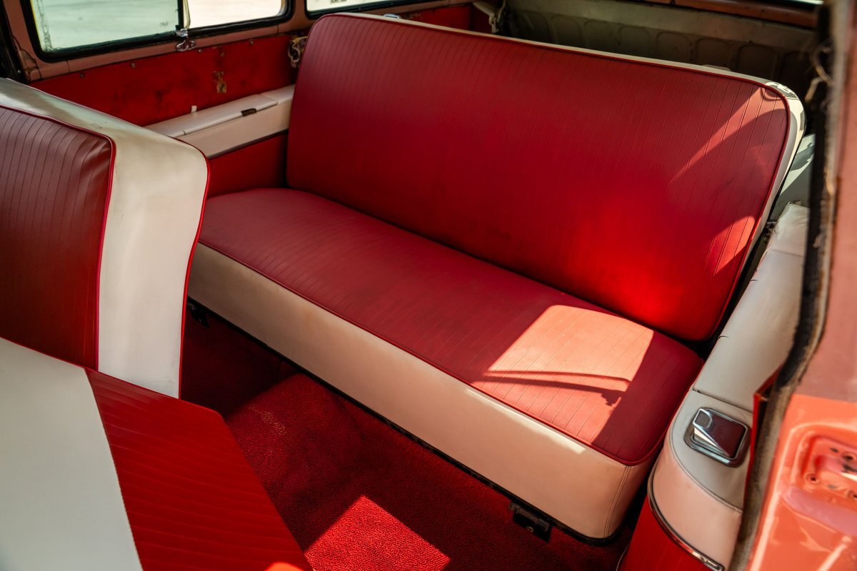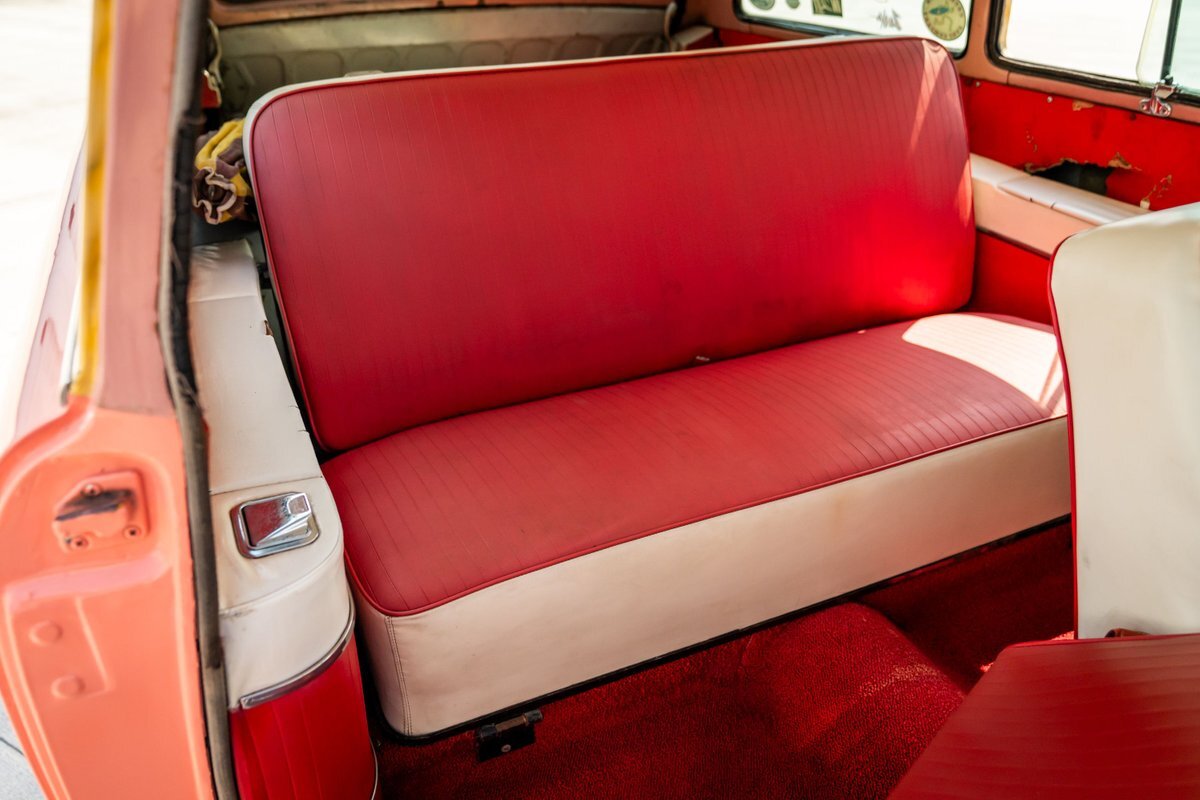 Trimmed in red vinyl with white side sections, the two rows of seating are said to have been reupholstered under prior ownership. Appointments include tri-tone door panels, red carpeting, a dashboard-mounted shift lever, a heater, bright doorsill guards, a dome light, and a locking glovebox. The turn-signal arm was replaced in May 2024. Wear and discoloration is evident on components such as the driver seat, the headliner, and the side panels, as shown in the photo and video galleries below. The steering wheel features a chrome horn ring and sits ahead of a 120-mph speedometer and secondary gauges. The five-digit odometer shows 11k miles; true mileage is unknown. The fuel gauge is inoperable.
