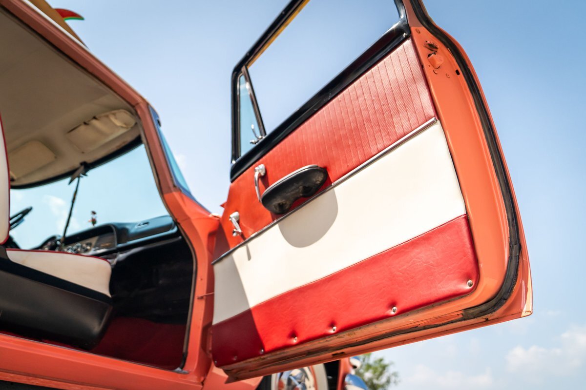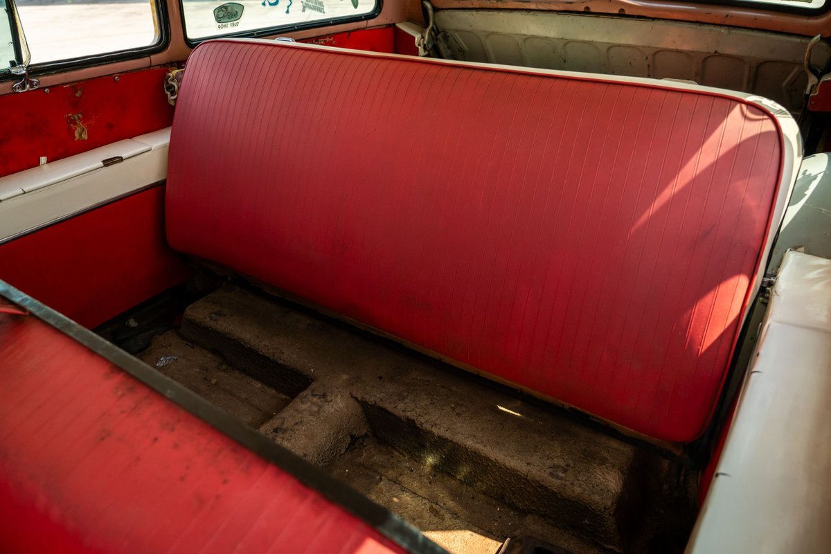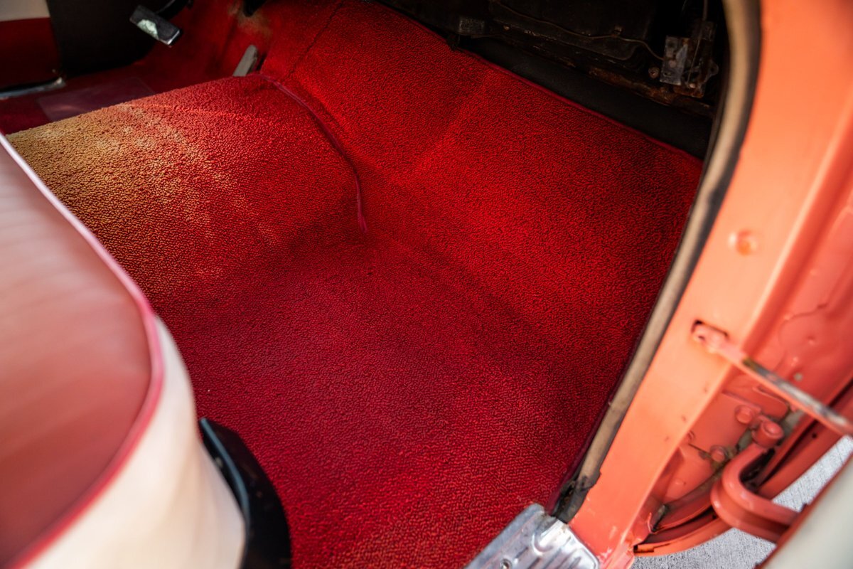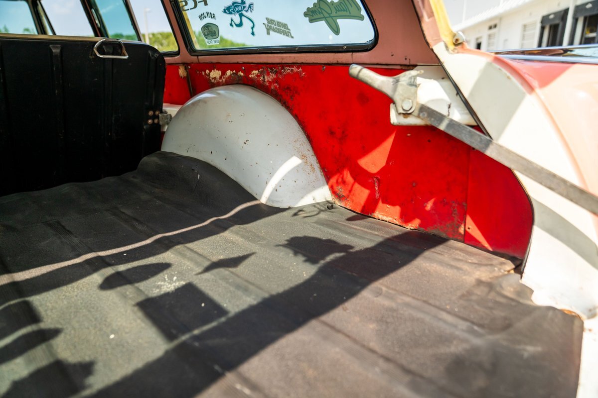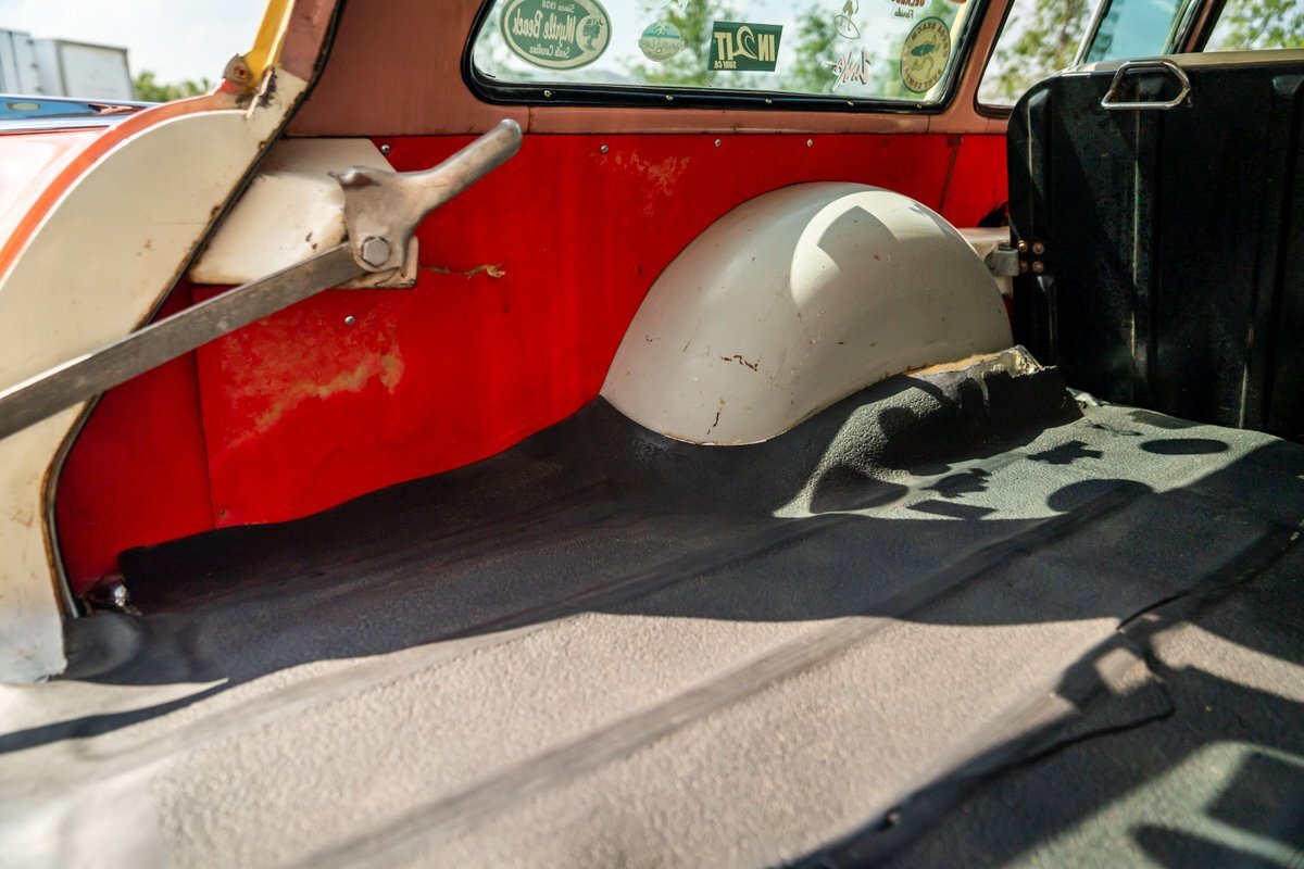 Trimmed in red vinyl with white side sections, the two rows of seating are said to have been reupholstered under prior ownership. Appointments include tri-tone door panels, red carpeting, a dashboard-mounted shift lever, a heater, bright doorsill guards, a dome light, and a locking glovebox. The turn-signal arm was replaced in May 2024. Wear and discoloration is evident on components such as the driver seat, the headliner, and the side panels, as shown in the photo and video galleries below. The steering wheel features a chrome horn ring and sits ahead of a 120-mph speedometer and secondary gauges. The five-digit odometer shows 11k miles; true mileage is unknown. The fuel gauge is inoperable.