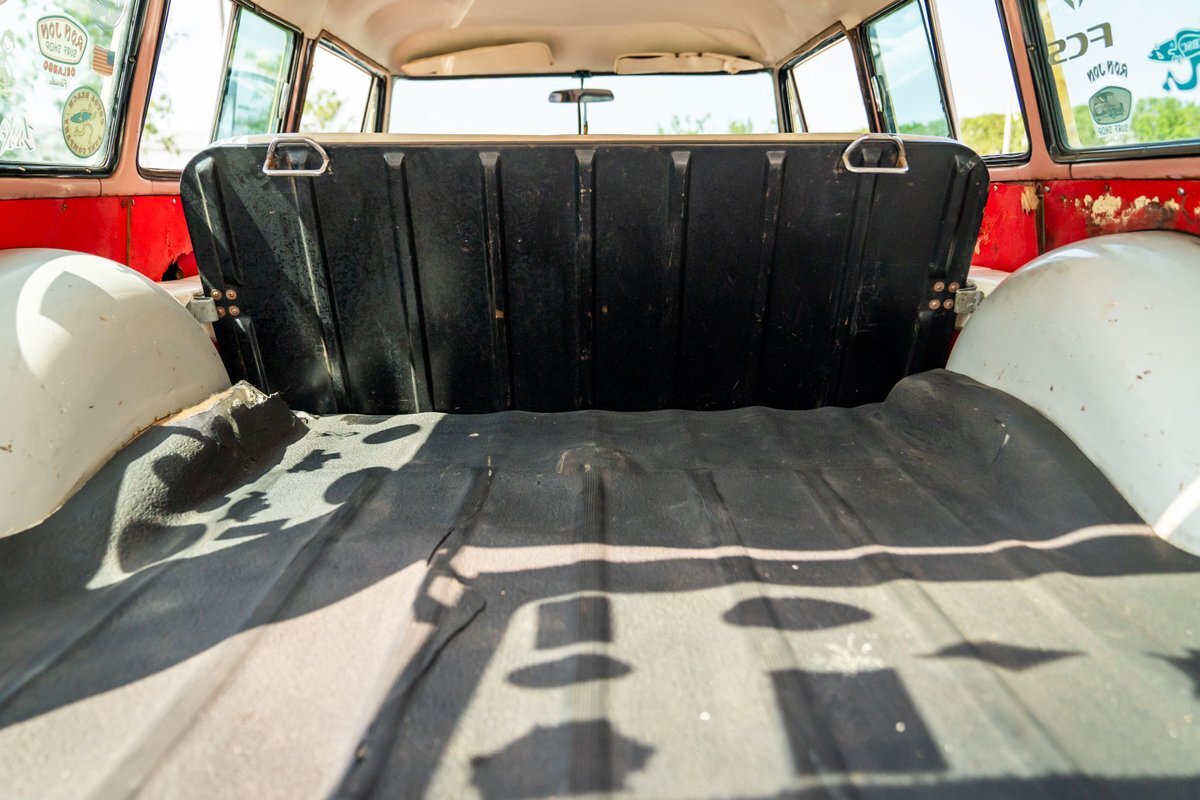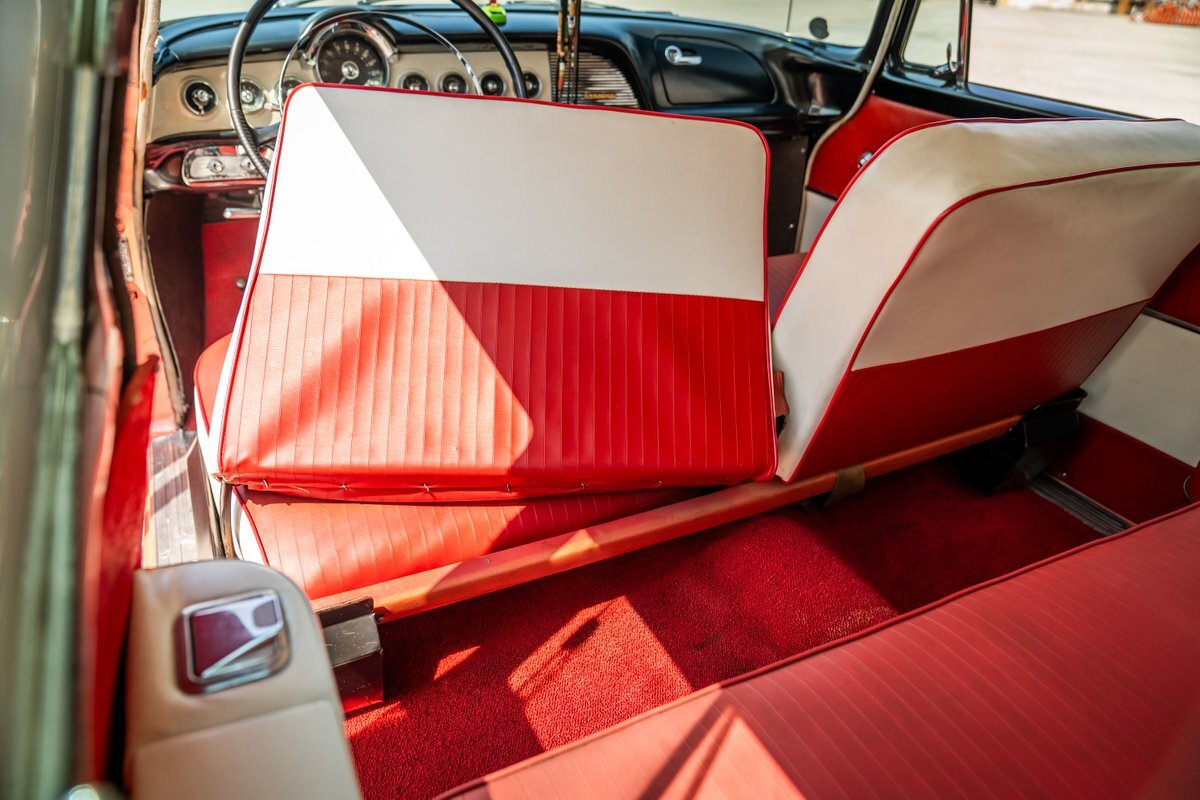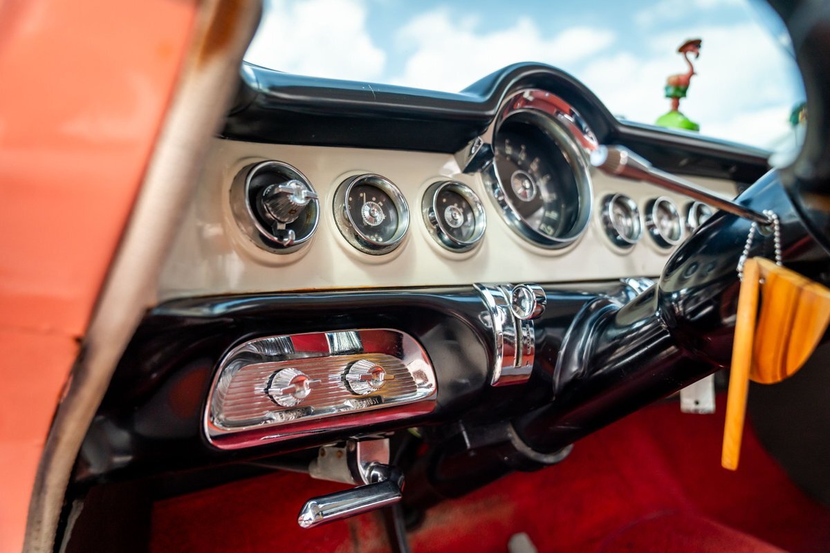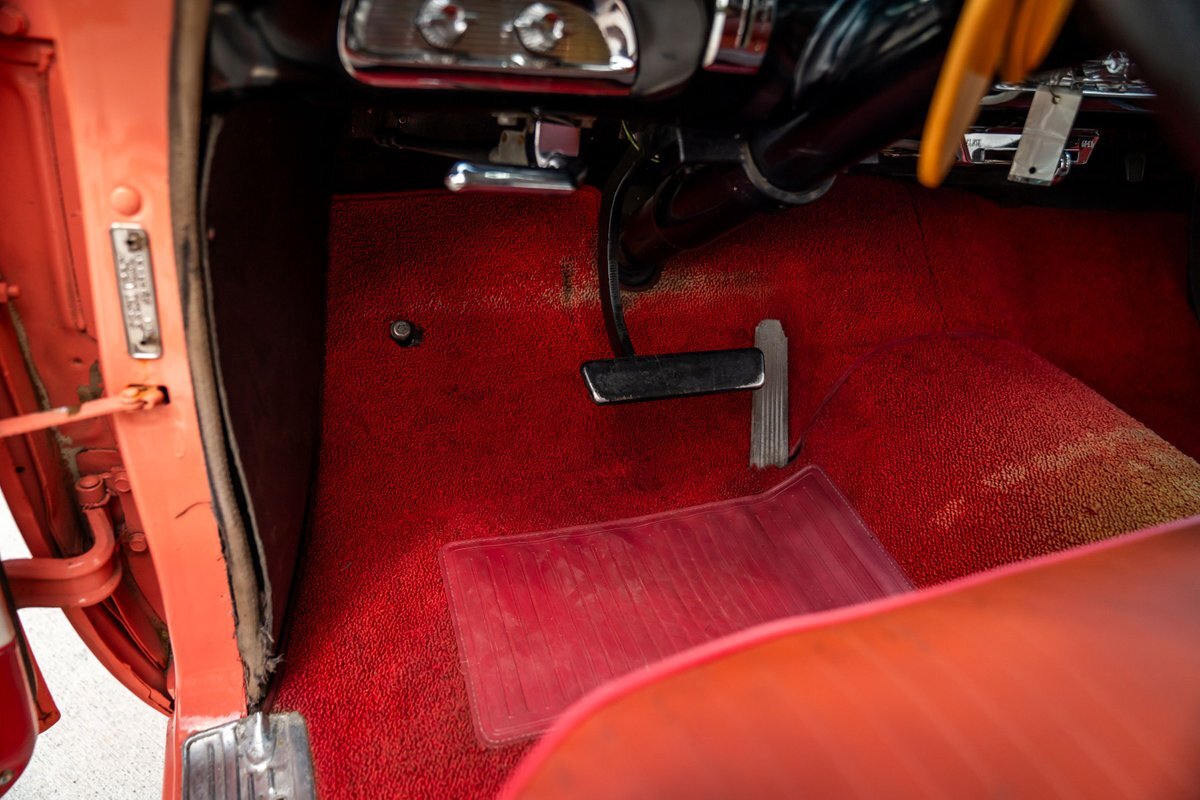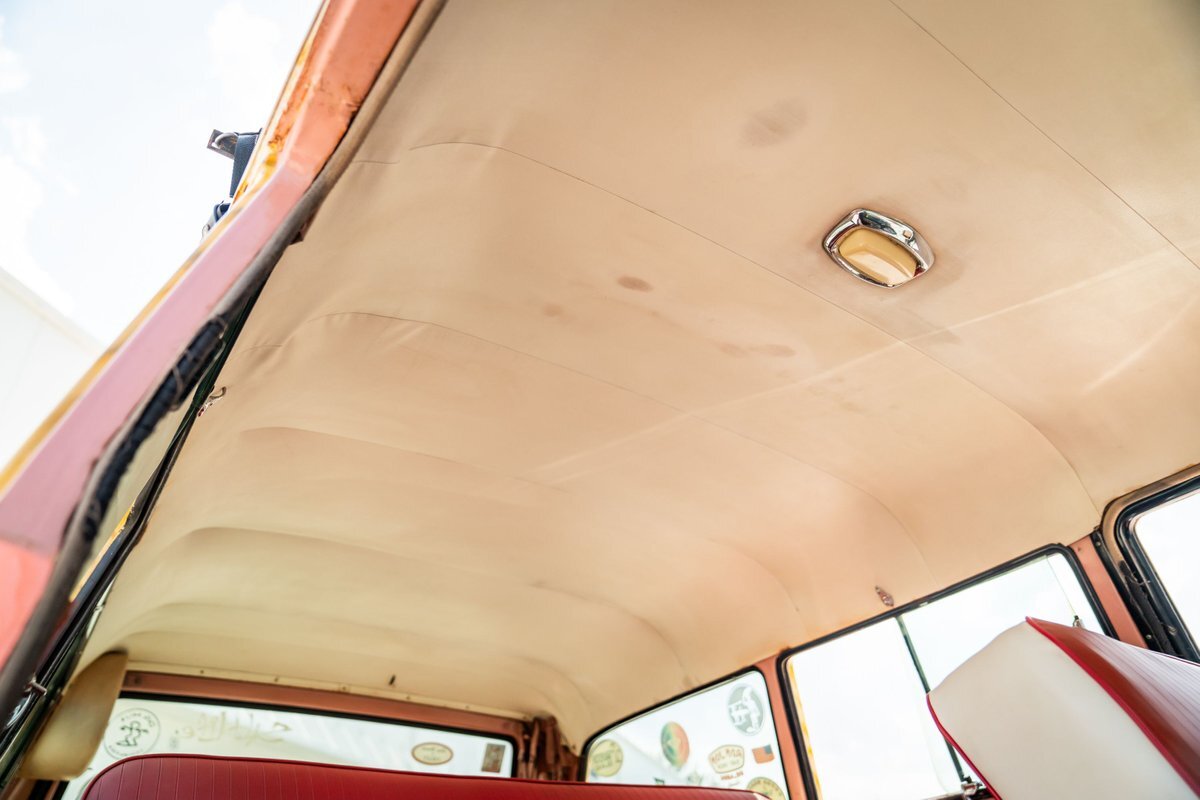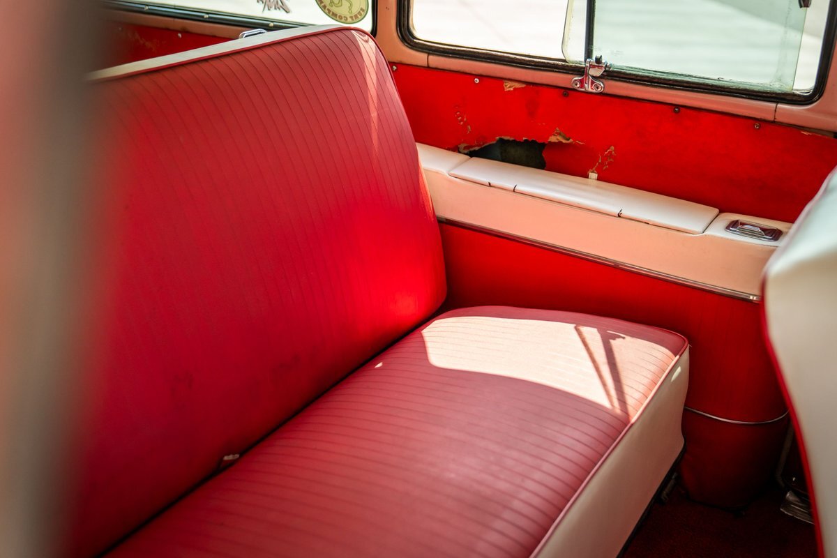 Trimmed in red vinyl with white side sections, the two rows of seating are said to have been reupholstered under prior ownership. Appointments include tri-tone door panels, red carpeting, a dashboard-mounted shift lever, a heater, bright doorsill guards, a dome light, and a locking glovebox. The turn-signal arm was replaced in May 2024. Wear and discoloration is evident on components such as the driver seat, the headliner, and the side panels, as shown in the photo and video galleries below. The steering wheel features a chrome horn ring and sits ahead of a 120-mph speedometer and secondary gauges. The five-digit odometer shows 11k miles; true mileage is unknown. The fuel gauge is inoperable.
