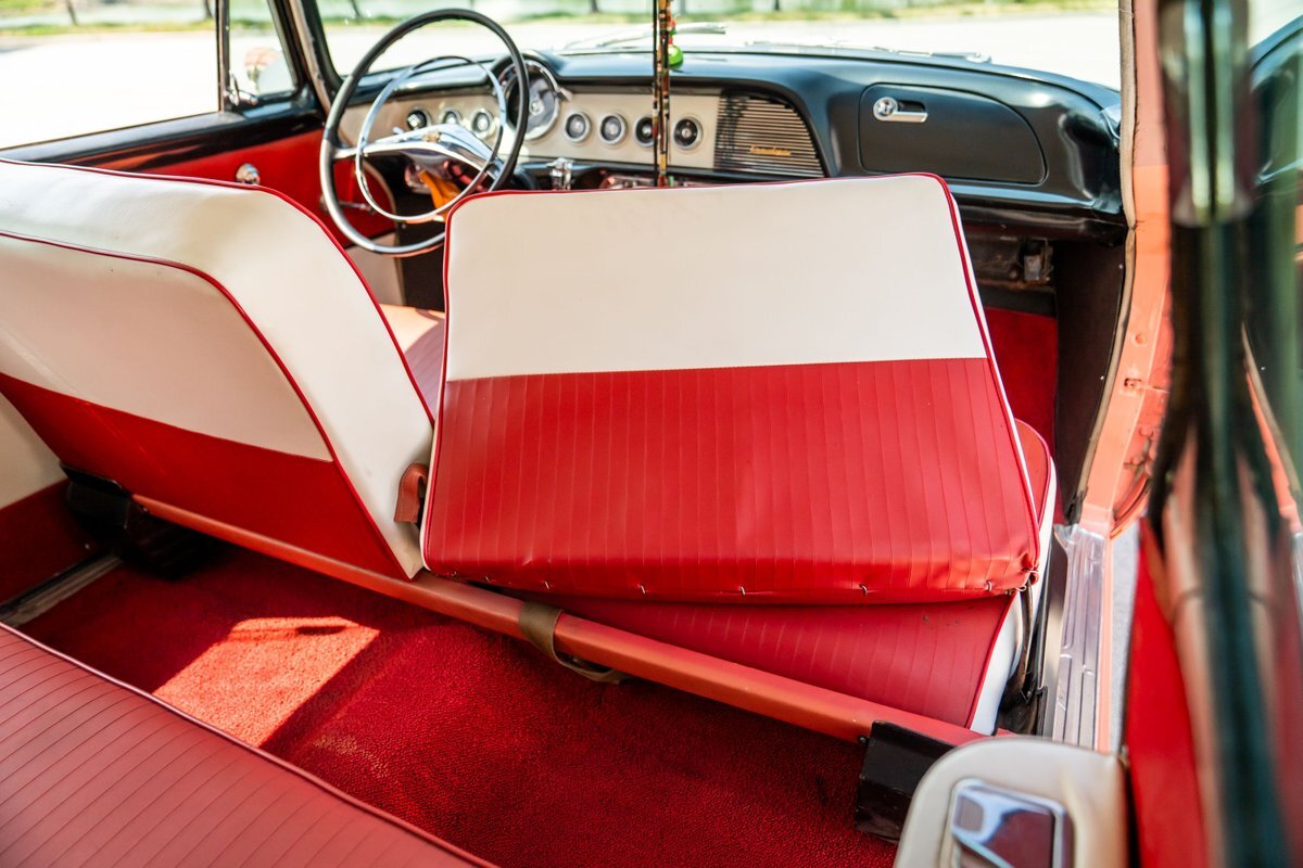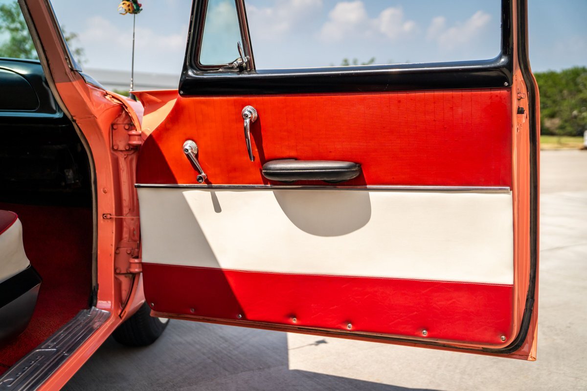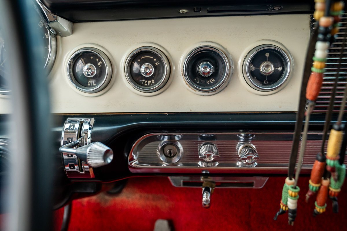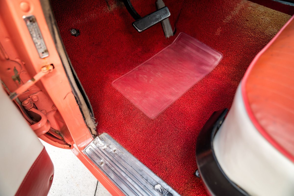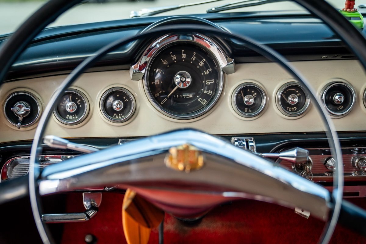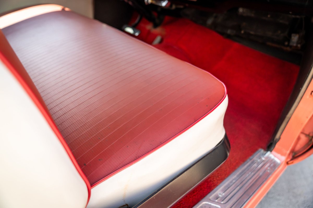 Trimmed in red vinyl with white side sections, the two rows of seating are said to have been reupholstered under prior ownership. Appointments include tri-tone door panels, red carpeting, a dashboard-mounted shift lever, a heater, bright doorsill guards, a dome light, and a locking glovebox. The turn-signal arm was replaced in May 2024. Wear and discoloration is evident on components such as the driver seat, the headliner, and the side panels, as shown in the photo and video galleries below. The steering wheel features a chrome horn ring and sits ahead of a 120-mph speedometer and secondary gauges. The five-digit odometer shows 11k miles; true mileage is unknown. The fuel gauge is inoperable.