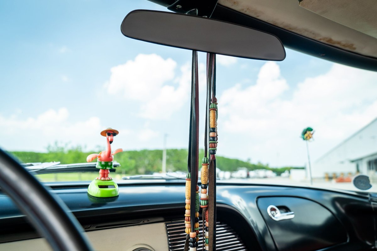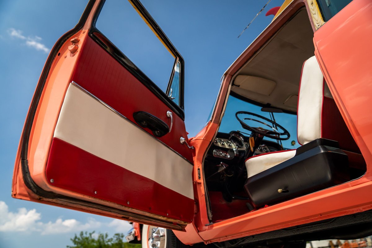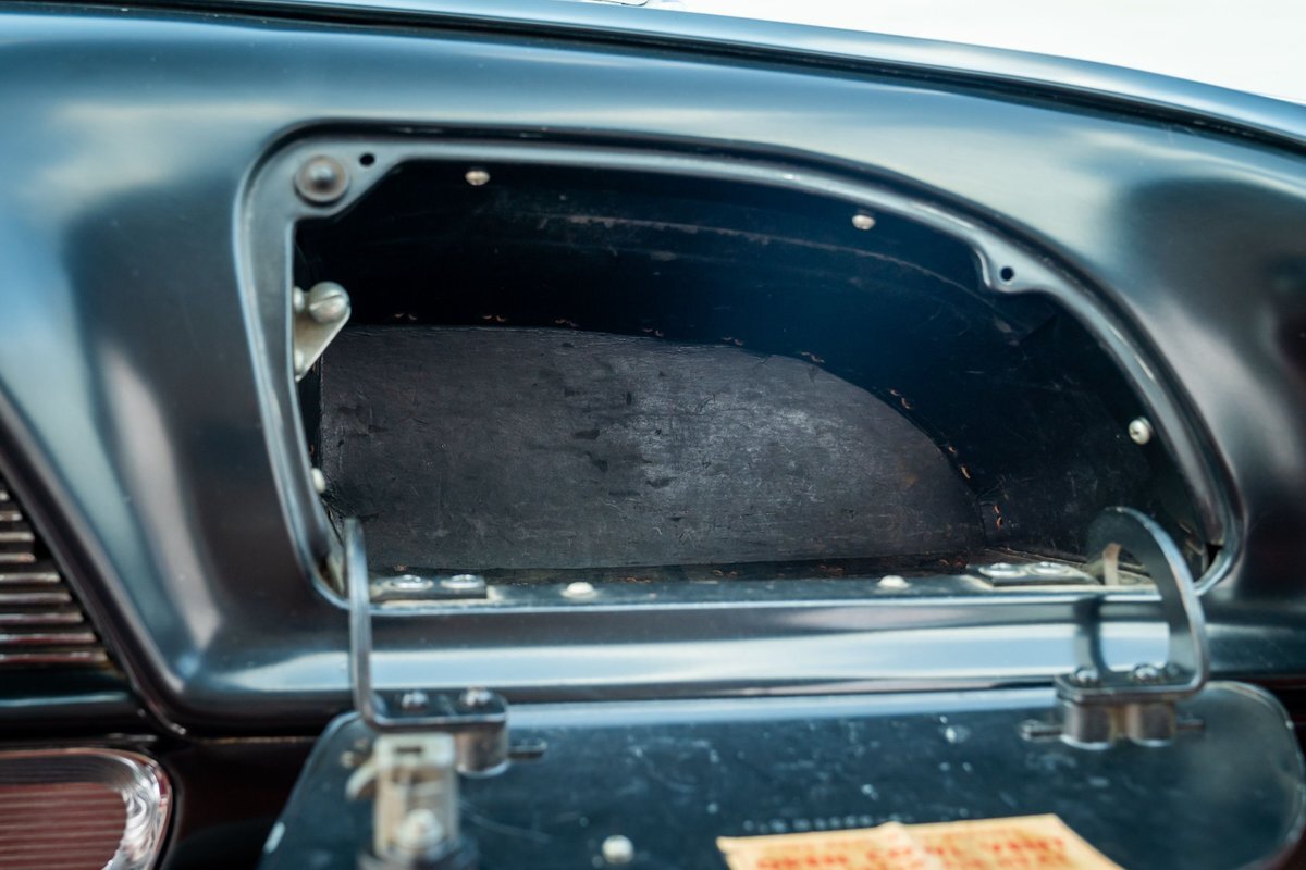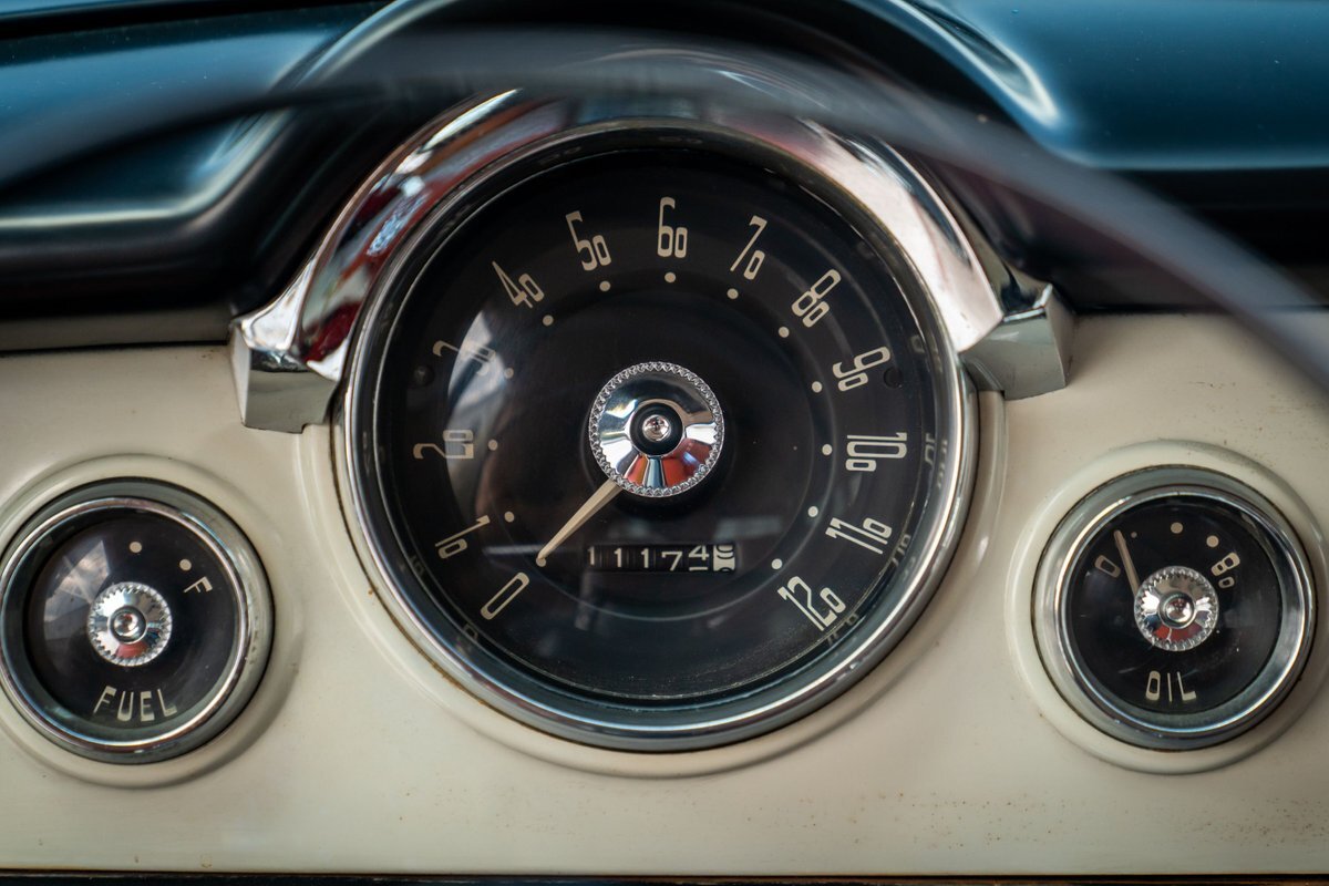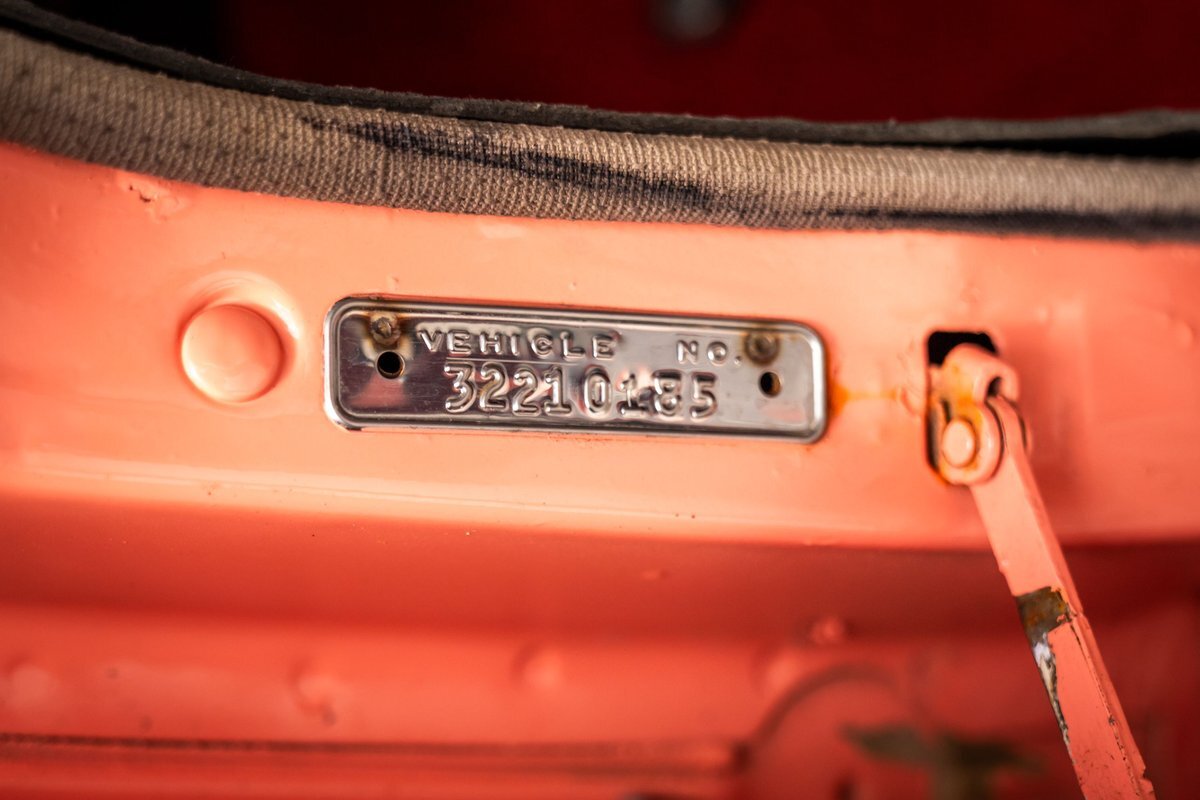 Trimmed in red vinyl with white side sections, the two rows of seating are said to have been reupholstered under prior ownership. Appointments include tri-tone door panels, red carpeting, a dashboard-mounted shift lever, a heater, bright doorsill guards, a dome light, and a locking glovebox. The turn-signal arm was replaced in May 2024. Wear and discoloration is evident on components such as the driver seat, the headliner, and the side panels, as shown in the photo and video galleries below. The steering wheel features a chrome horn ring and sits ahead of a 120-mph speedometer and secondary gauges. The five-digit odometer shows 11k miles; true mileage is unknown. The fuel gauge is inoperable.