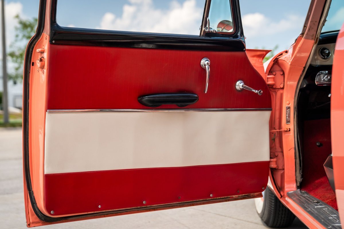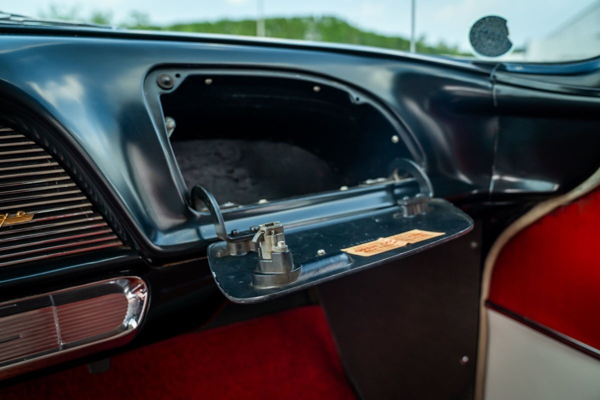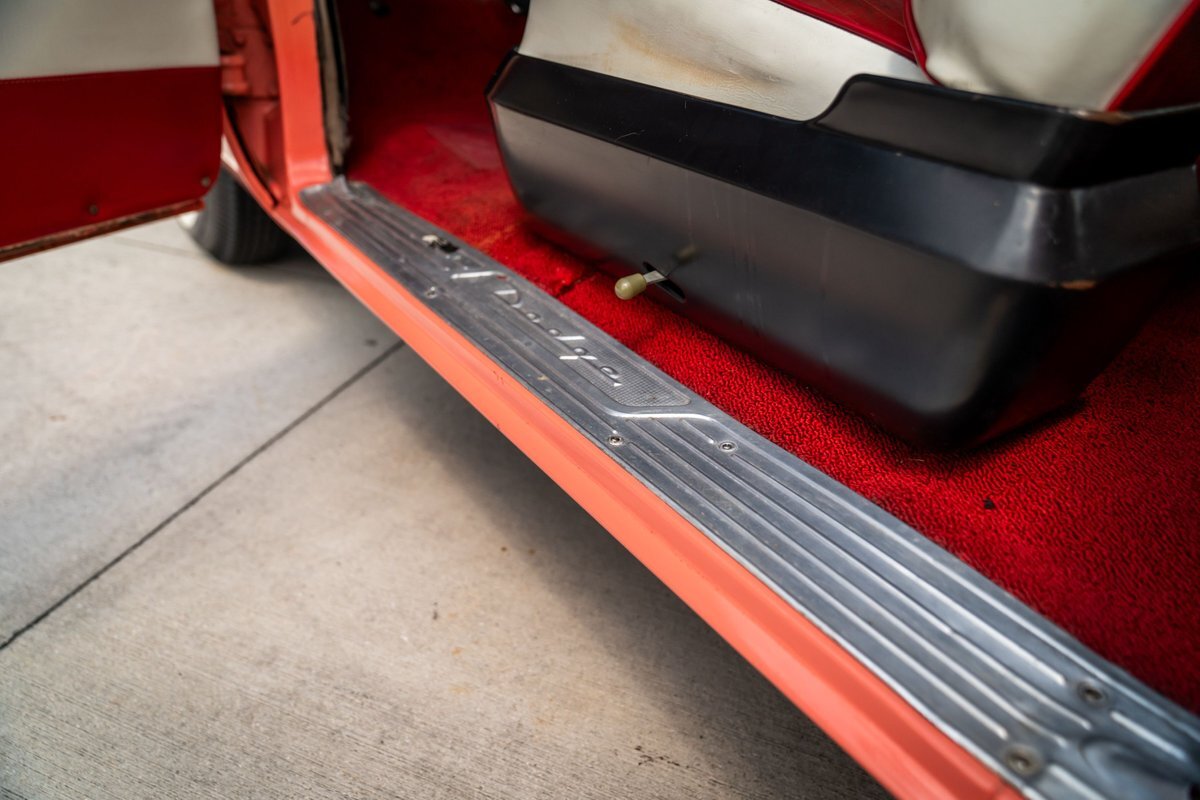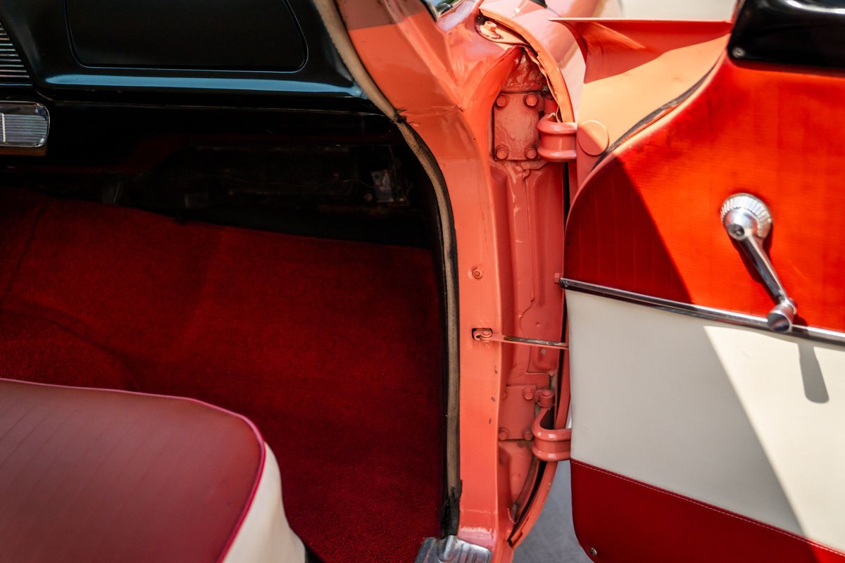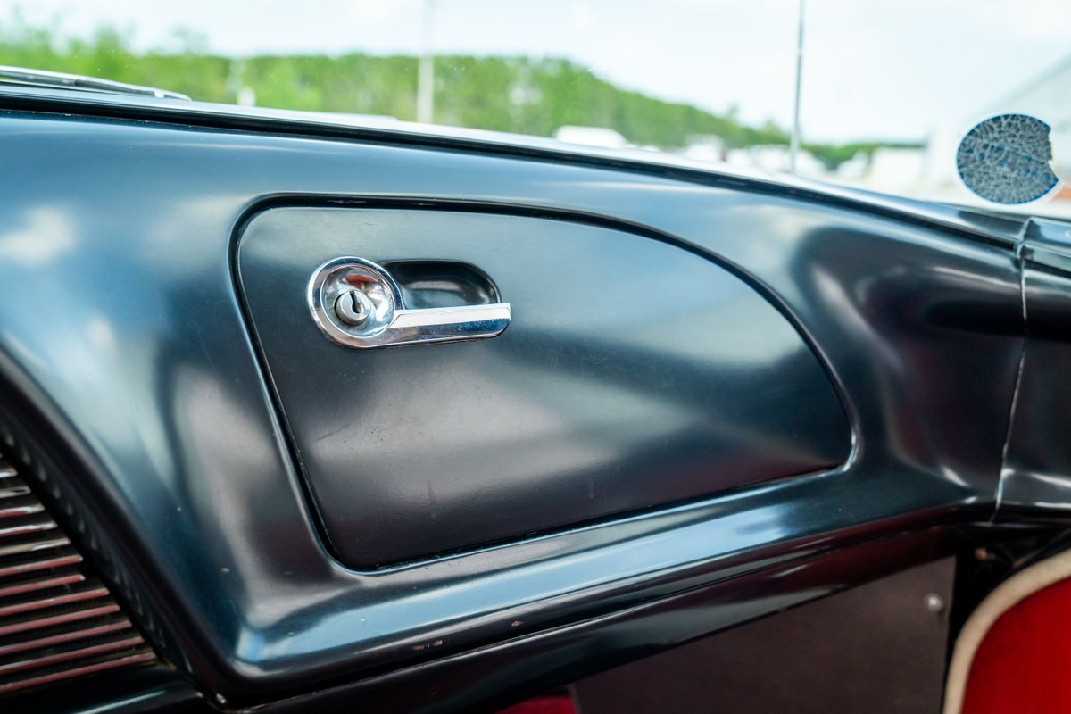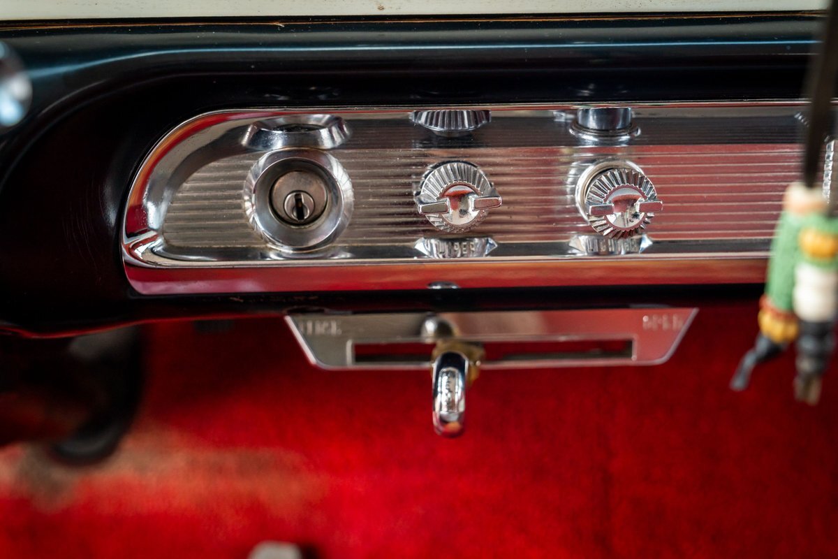 Trimmed in red vinyl with white side sections, the two rows of seating are said to have been reupholstered under prior ownership. Appointments include tri-tone door panels, red carpeting, a dashboard-mounted shift lever, a heater, bright doorsill guards, a dome light, and a locking glovebox. The turn-signal arm was replaced in May 2024. Wear and discoloration is evident on components such as the driver seat, the headliner, and the side panels, as shown in the photo and video galleries below. The steering wheel features a chrome horn ring and sits ahead of a 120-mph speedometer and secondary gauges. The five-digit odometer shows 11k miles; true mileage is unknown. The fuel gauge is inoperable.