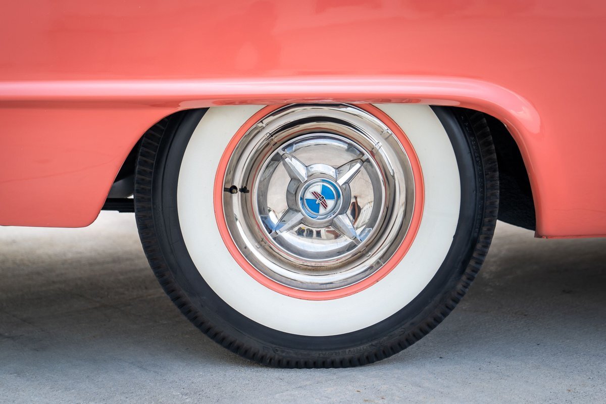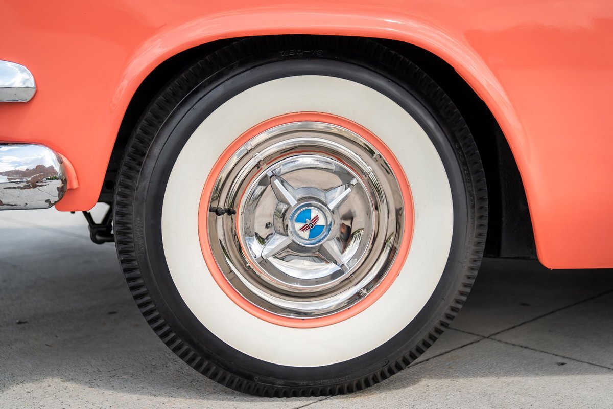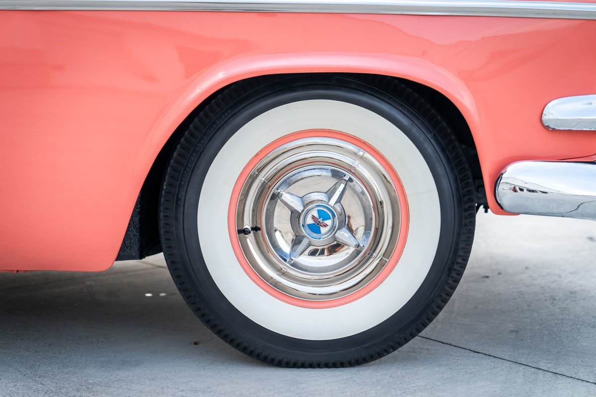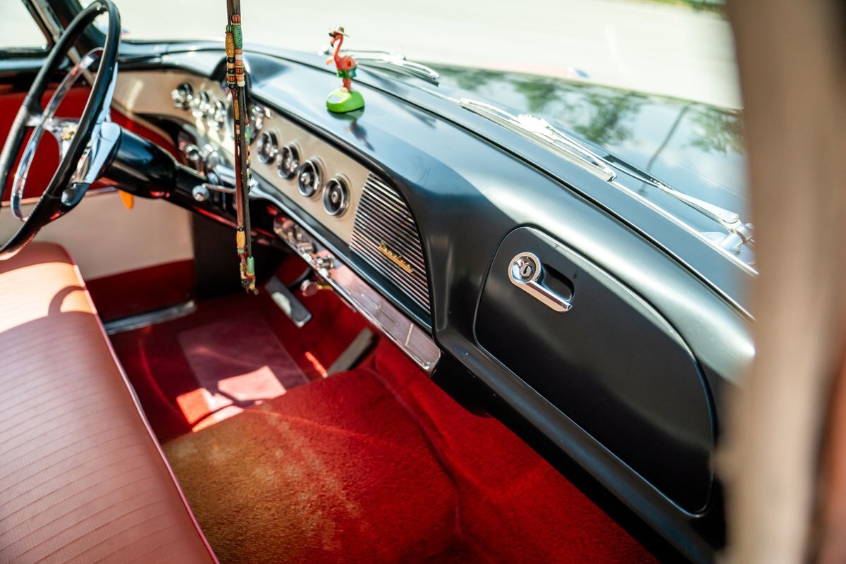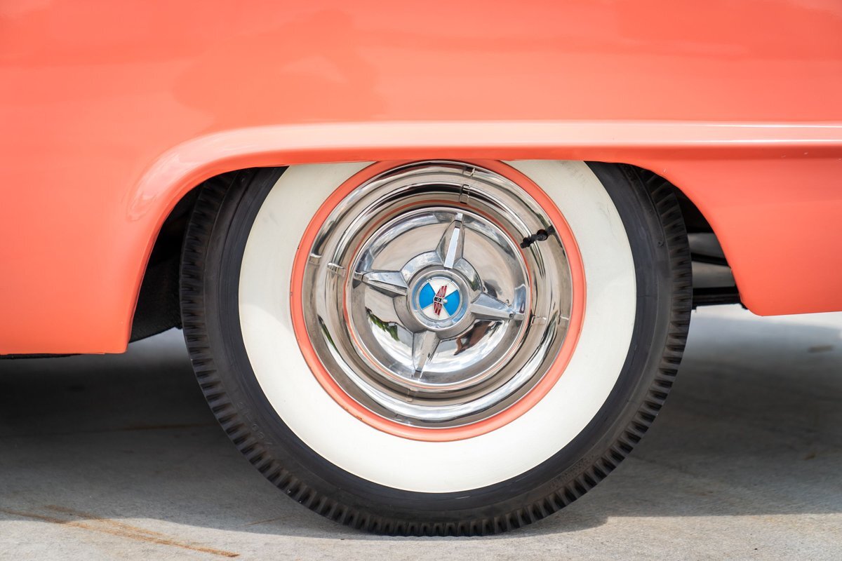 The "Get-Away Six" D56 230ci inline-six produced a factory-rated 123 horsepower at 3,600 rpm. The carburetor was rebuilt in May 2024, the oil was changed, and the spark plugs, points, condenser, distributor cap, and rotor were replaced. A replacement fuel tank was modified to fit in this car, and the fuel filter was replaced; a $3,772 receipt for work performed by Keith's Rods & Customs of Fort Lauderdale, Florida, in May 2024 is viewable in the gallery. Body-color 15" steel wheels wear styled covers and are wrapped in Universal whitewall tires. Braking is handled by unassisted four-wheel drums. The wheel cylinders, hoses, and shoes were replaced in May 2024, as were the brake-light switch and the front grease seals.