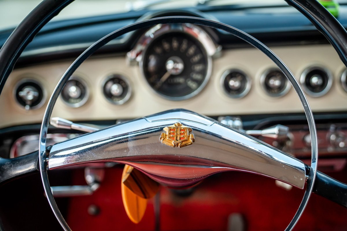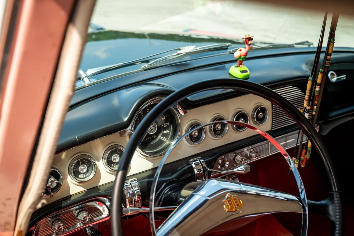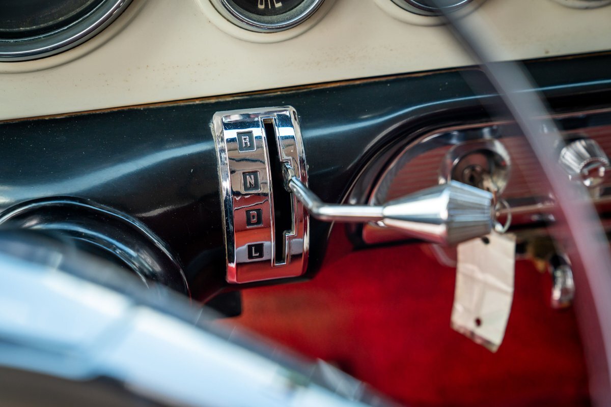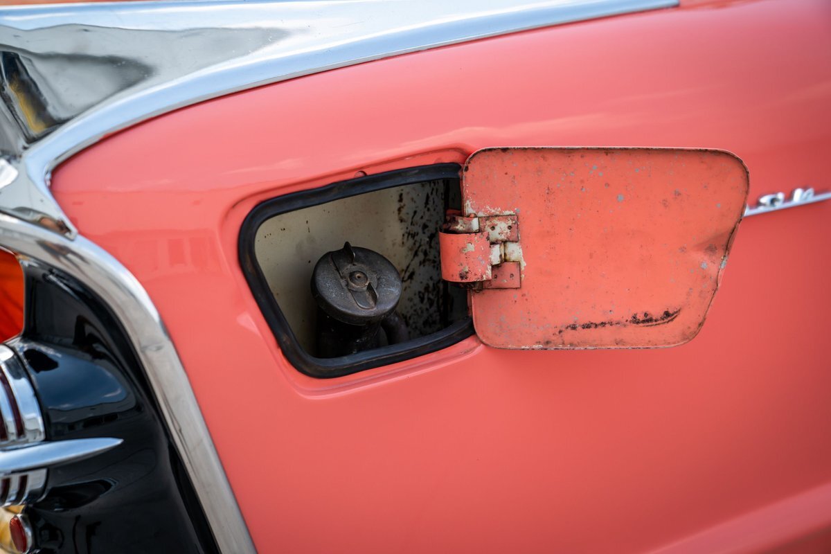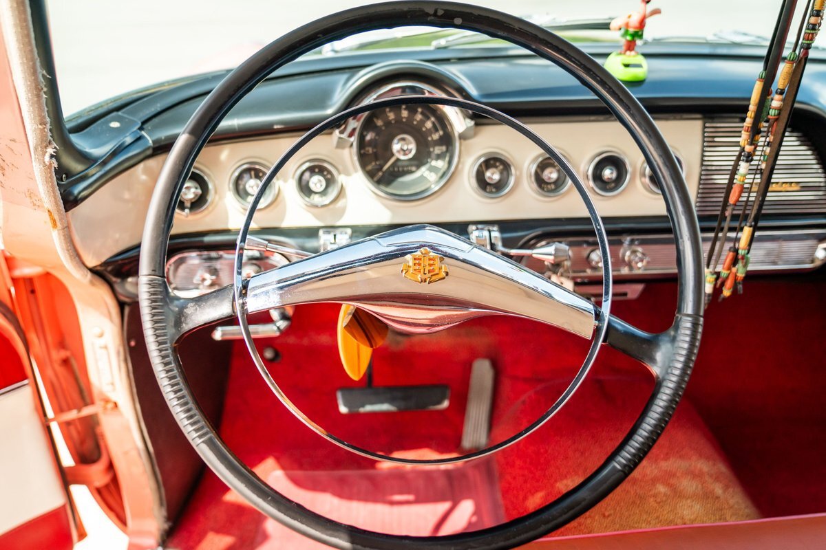 The "Get-Away Six" D56 230ci inline-six produced a factory-rated 123 horsepower at 3,600 rpm. The carburetor was rebuilt in May 2024, the oil was changed, and the spark plugs, points, condenser, distributor cap, and rotor were replaced. A replacement fuel tank was modified to fit in this car, and the fuel filter was replaced; a $3,772 receipt for work performed by Keith's Rods & Customs of Fort Lauderdale, Florida, in May 2024 is viewable in the gallery. Body-color 15" steel wheels wear styled covers and are wrapped in Universal whitewall tires. Braking is handled by unassisted four-wheel drums. The wheel cylinders, hoses, and shoes were replaced in May 2024, as were the brake-light switch and the front grease seals.