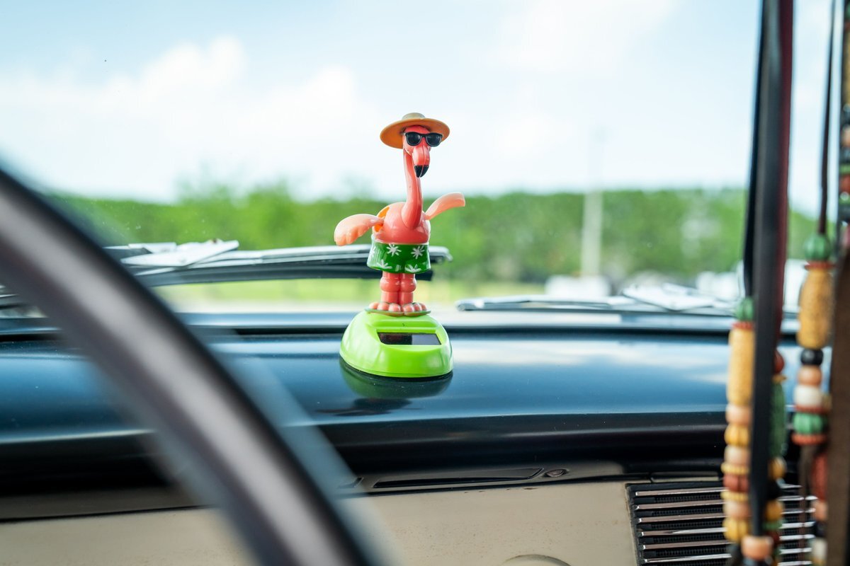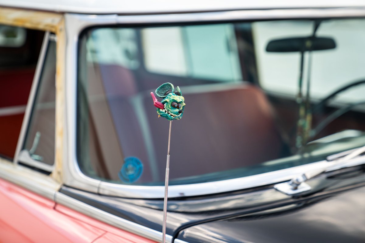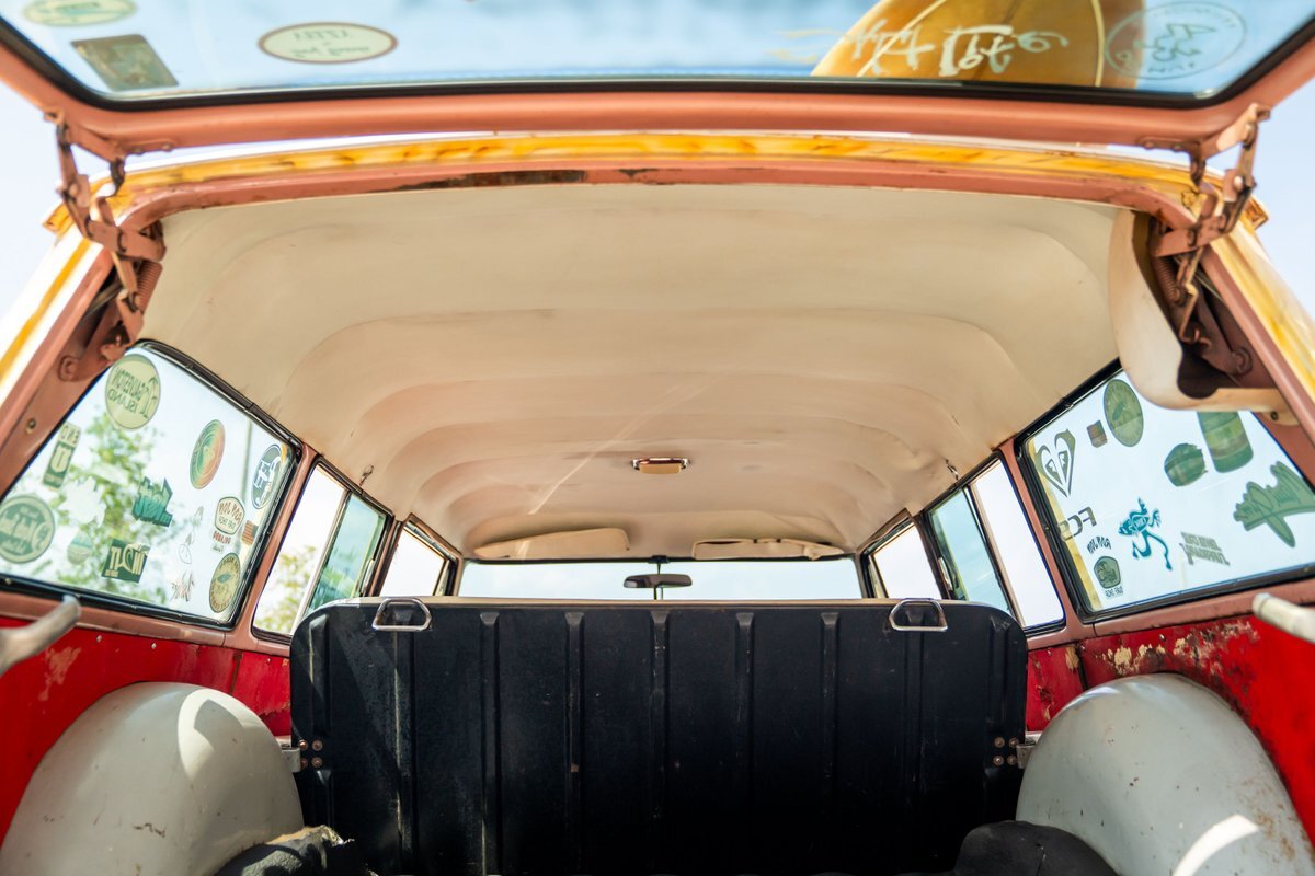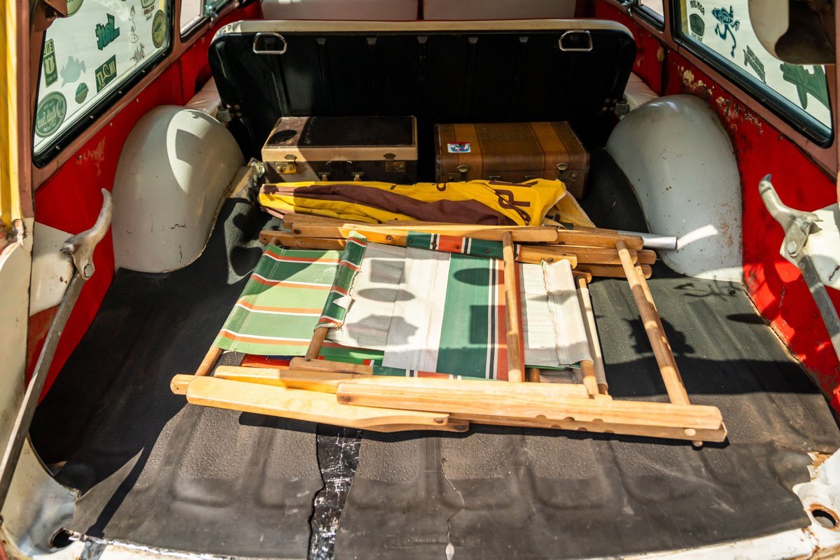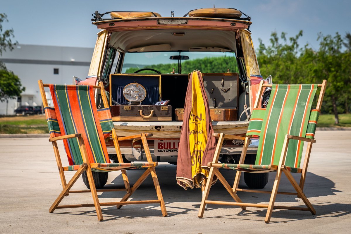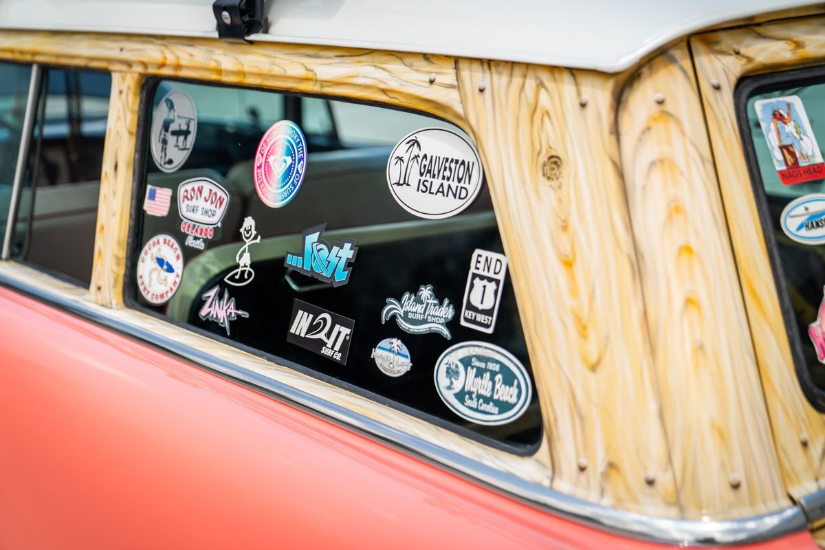 The car has been refinished in pink with a white roof panel and black accents on the hood and around the taillights. Woodgrain-style airbrushed paint has been applied around the window openings and on the tailgate by Air-On Customs. A removable black roof rack supports decorative wooden surfboards and a fishing pole that are included in the sale. Travel-focused stickers are found on the back windows. The driver-side headlamp was replaced in preparation for the sale.
