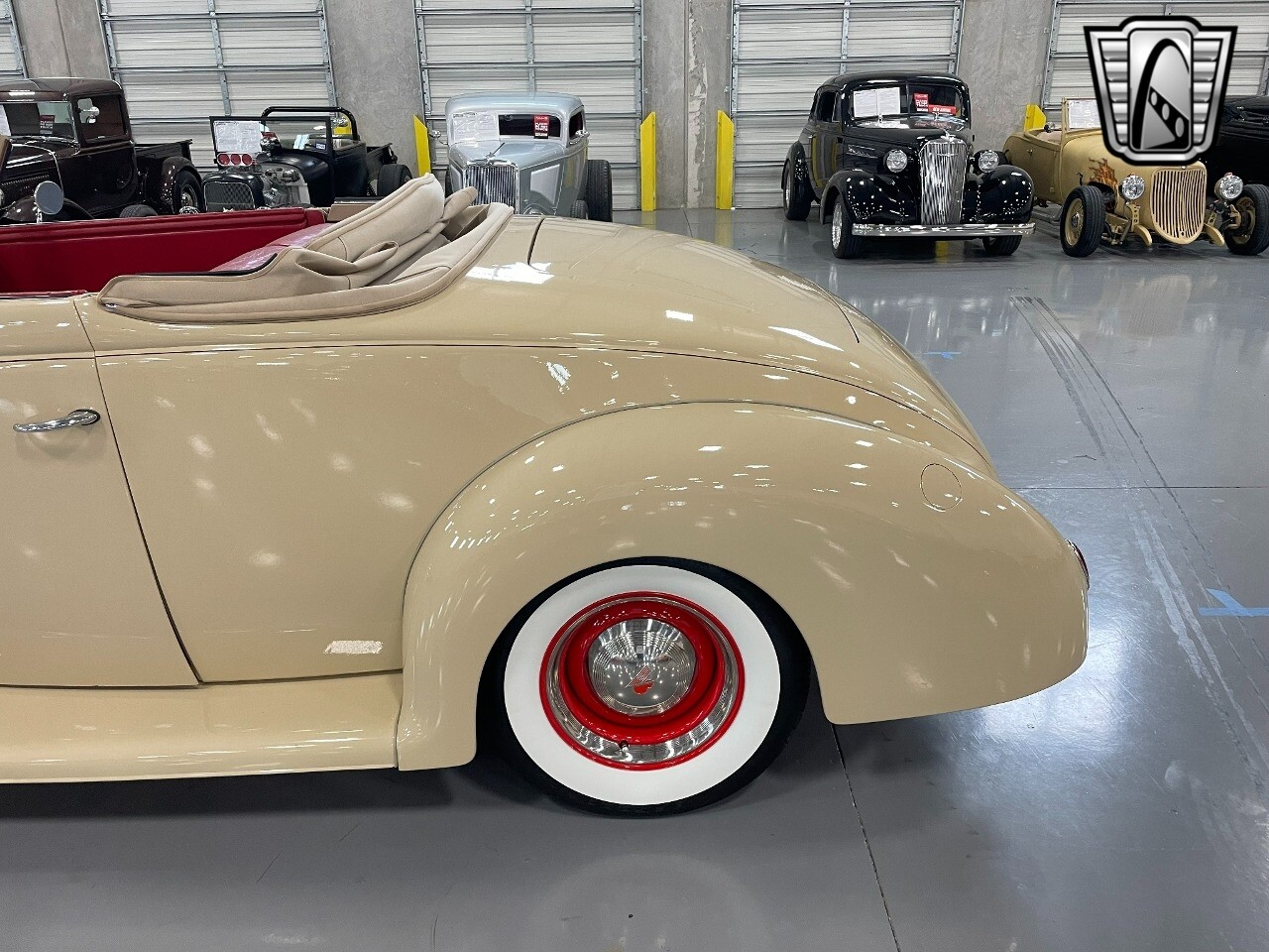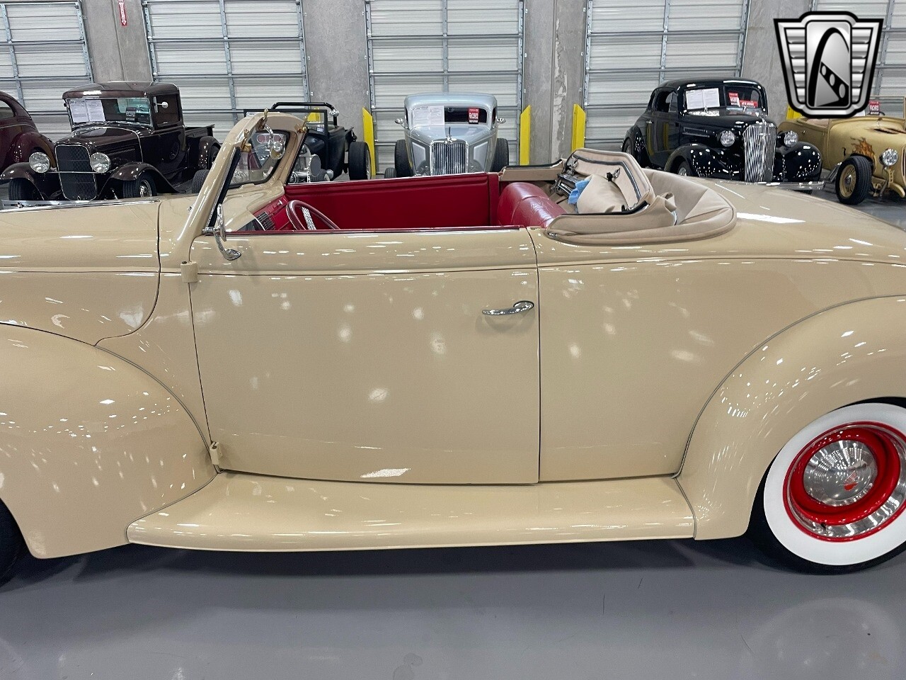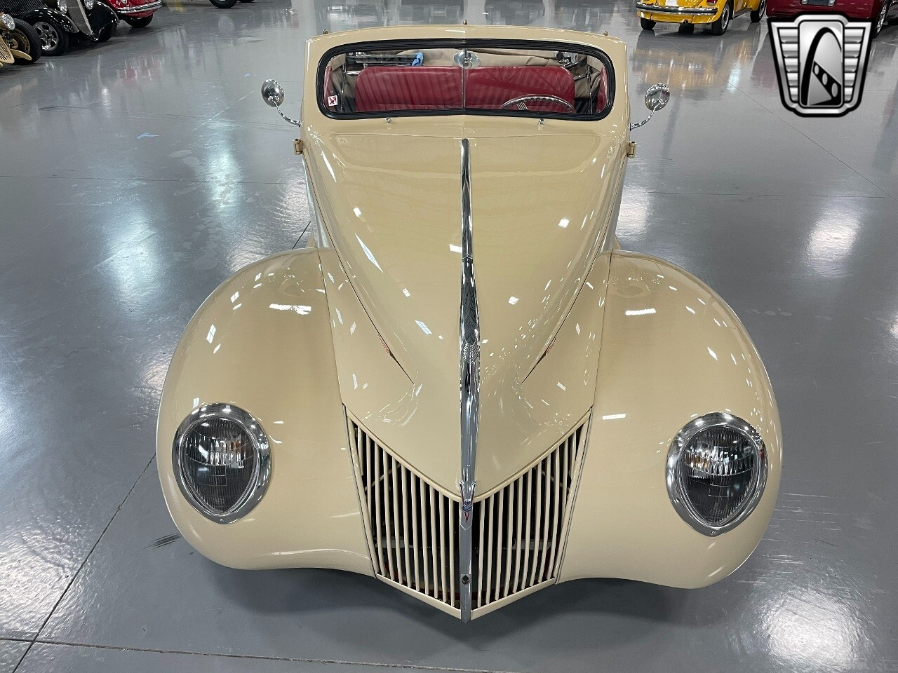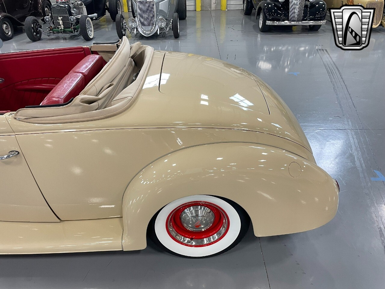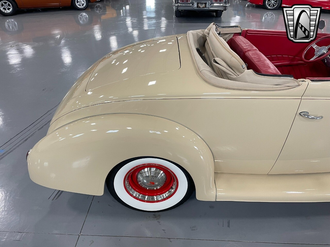 Gateway Classic Cars of San Antonio/Austin is proud to present this 1939 Ford Standard. The beige convertible top matches nicely with the Cream Beige paint makes this one of the few convertibles that looks terrific with the top in place. The bright red inside looks great against the red wheels and red accents to make this look like quite a thoughtful package inside and out. Under the hood, you'll find a fuel-injected 350 cubic-inch V8. It has all the right features you want, like upgraded pulleys, a serpentine belt, and an aluminum radiator with electric fan, shorty headers add power and rumble as they exhale into the dual exhaust. The Pete & Jakes chassis, a TCI tubular A-arm front suspension, ladder bar rear, adjustable coilovers, a Currie 9-inch rear, and Wilwood four-wheel power disc brakes help control the added power from the V8. Add in power steering and the four-speed automatic transmission with overdrive, and you've got a stellar rod that you can easily drive anywhere. There's also a Lokar floor shifter, upgraded readouts, and the banjo-style sports steering wheel is mounted on a tilt column. There are even the right luxuries for all-day driving, like power windows, an AM/FM/CD stereo, and modern R134a air conditioning. A shining and fuel-injected small block, a leather-lined A/C interior, four-wheel disc brakes, an overdrive transmission, and a sleek yet classic style on the outside makes for a thoughtful build that takes years to get right if you started from scratch..