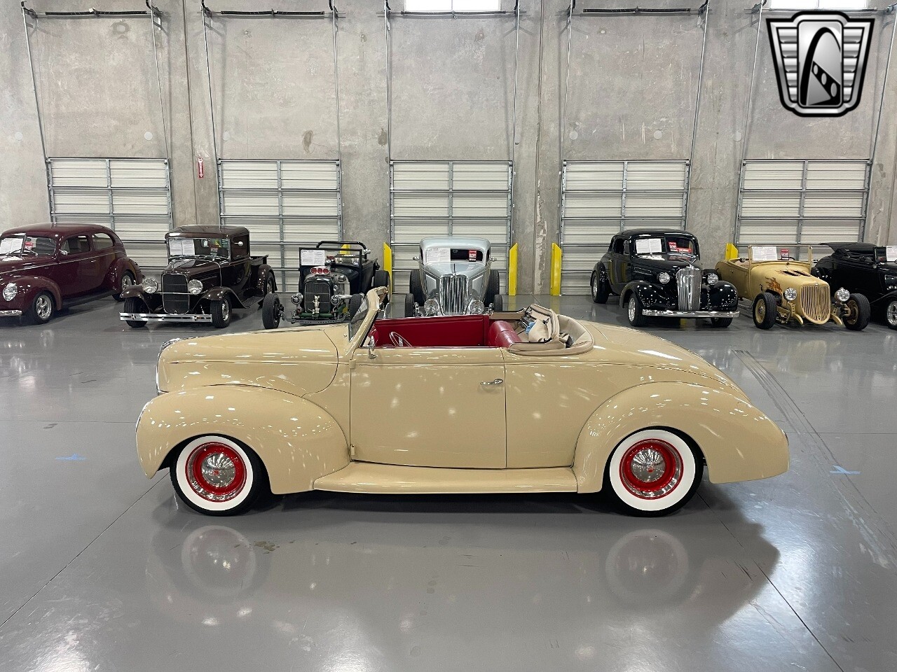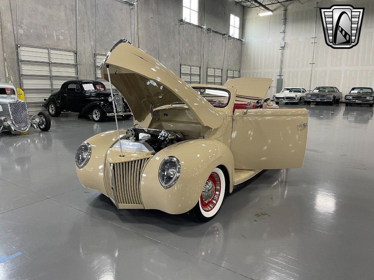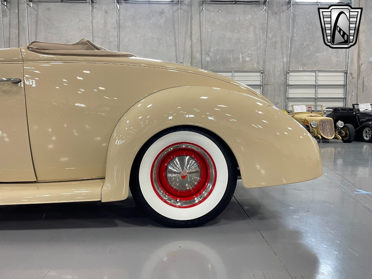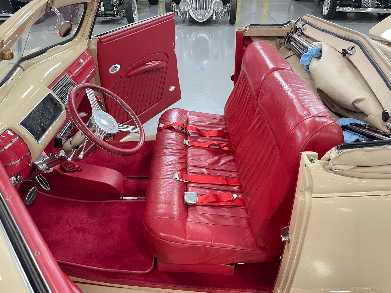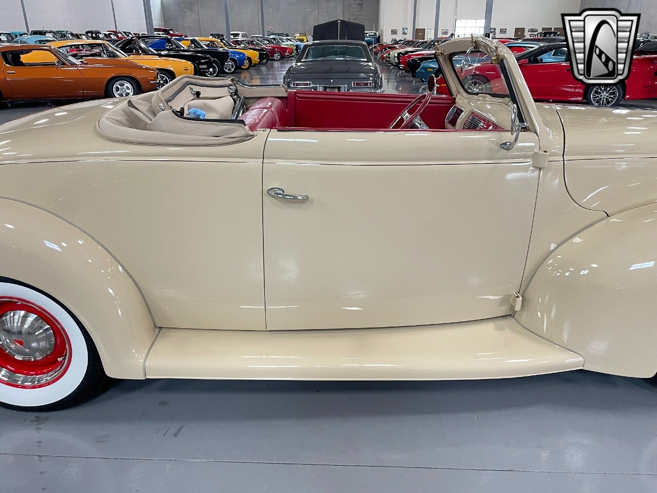 Gateway Classic Cars of San Antonio/Austin is proud to present this 1939 Ford Standard. The beige convertible top matches nicely with the Cream Beige paint makes this one of the few convertibles that looks terrific with the top in place. The bright red inside looks great against the red wheels and red accents to make this look like quite a thoughtful package inside and out. Under the hood, you'll find a fuel-injected 350 cubic-inch V8. It has all the right features you want, like upgraded pulleys, a serpentine belt, and an aluminum radiator with electric fan, shorty headers add power and rumble as they exhale into the dual exhaust. The Pete & Jakes chassis, a TCI tubular A-arm front suspension, ladder bar rear, adjustable coilovers, a Currie 9-inch rear, and Wilwood four-wheel power disc brakes help control the added power from the V8. Add in power steering and the four-speed automatic transmission with overdrive, and you've got a stellar rod that you can easily drive anywhere. There's also a Lokar floor shifter, upgraded readouts, and the banjo-style sports steering wheel is mounted on a tilt column. There are even the right luxuries for all-day driving, like power windows, an AM/FM/CD stereo, and modern R134a air conditioning. A shining and fuel-injected small block, a leather-lined A/C interior, four-wheel disc brakes, an overdrive transmission, and a sleek yet classic style on the outside makes for a thoughtful build that takes years to get right if you started from scratch..