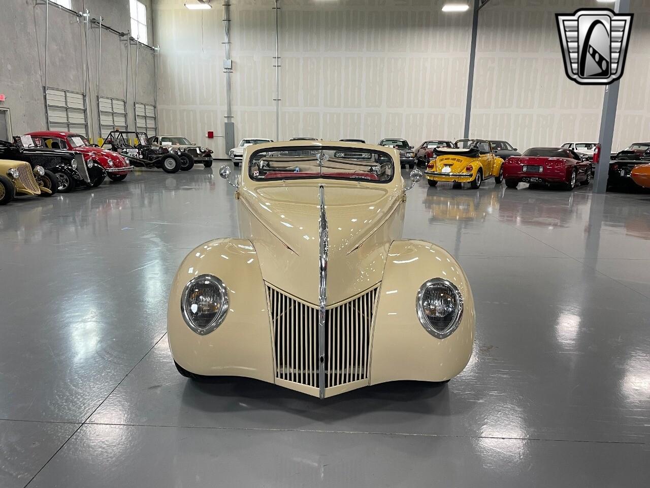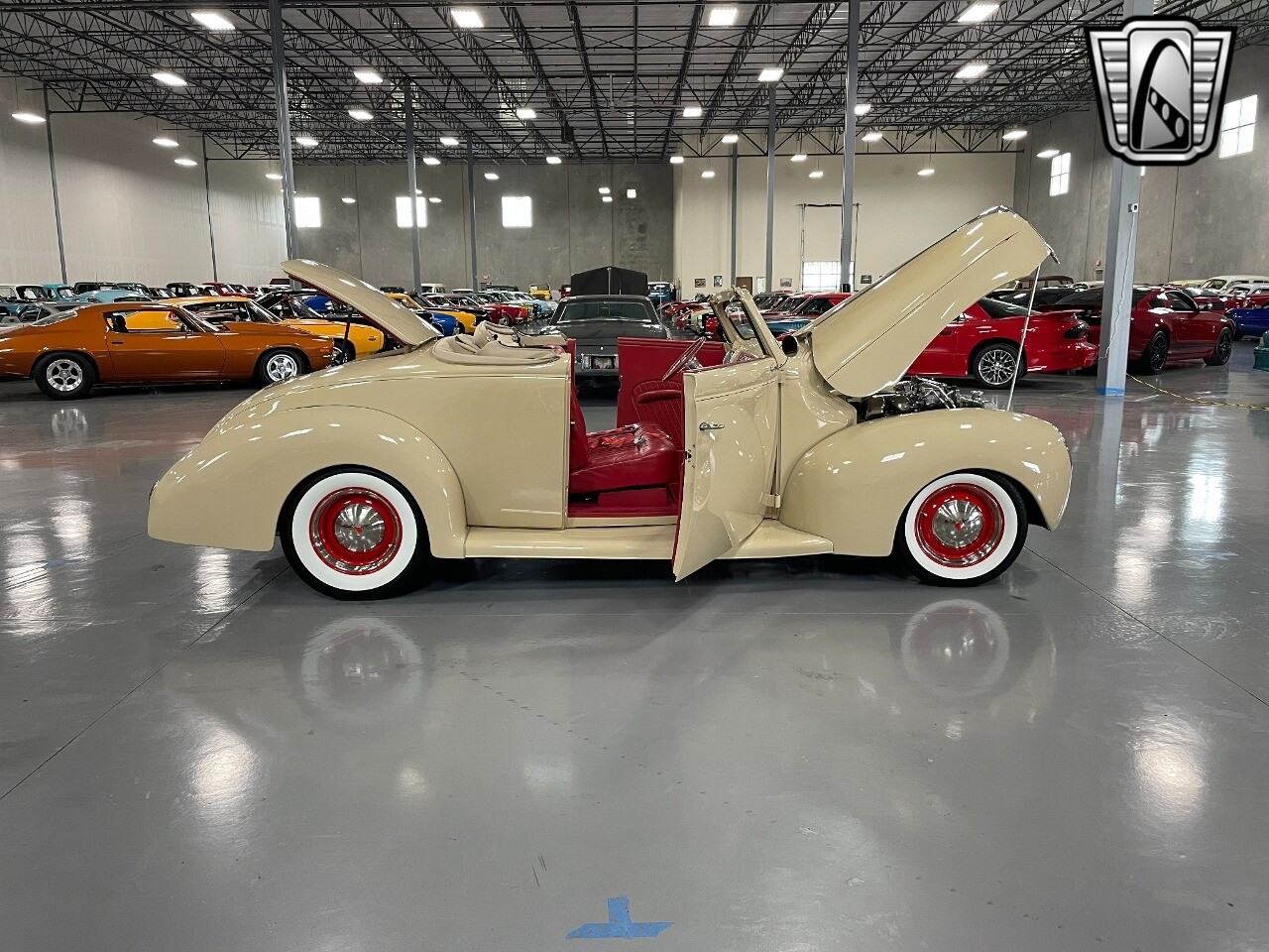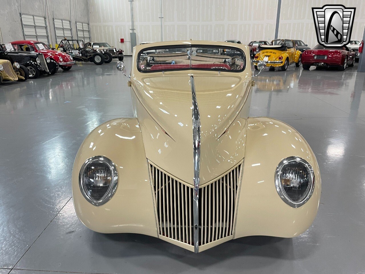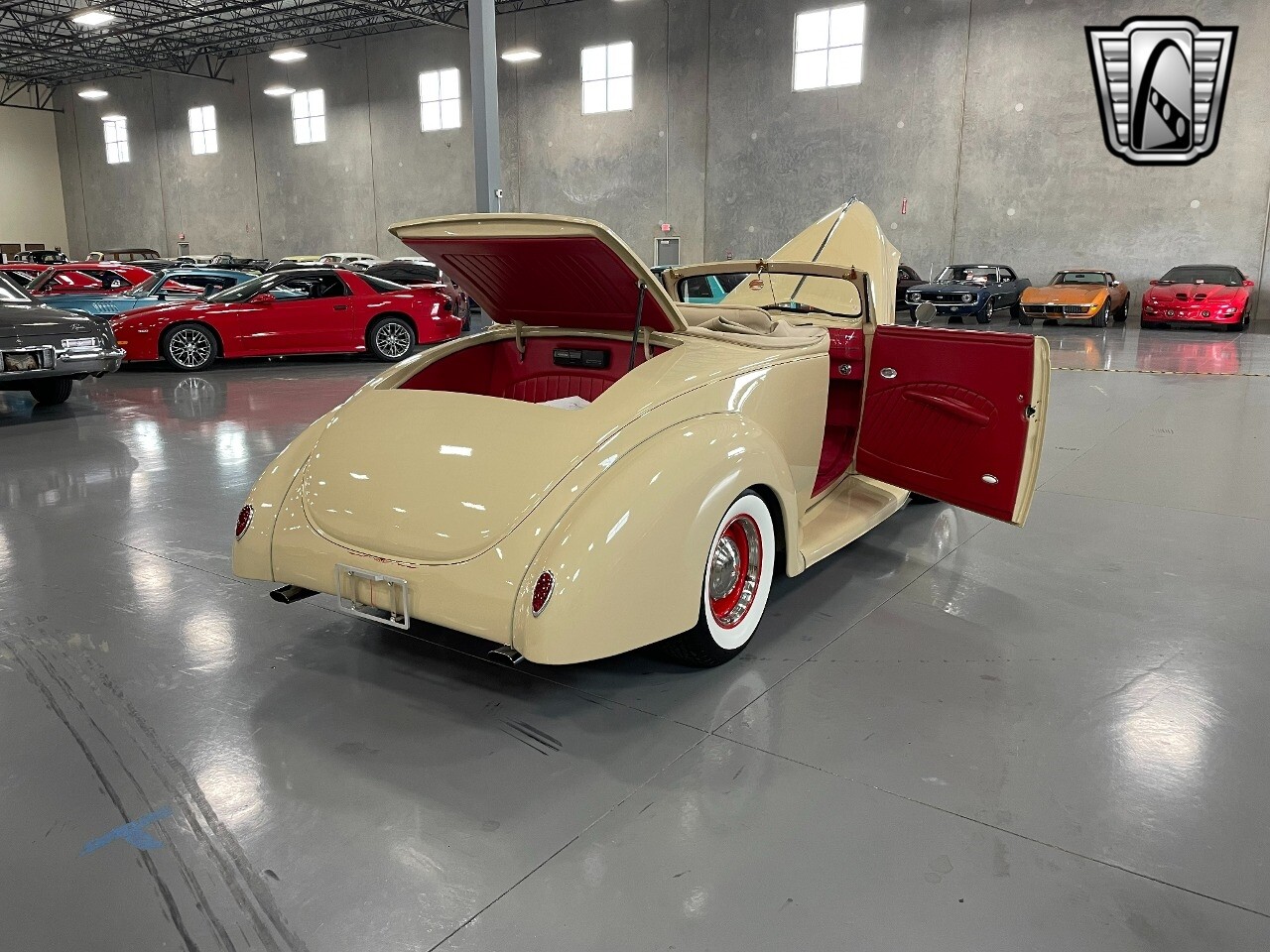 Gateway Classic Cars of San Antonio/Austin is proud to present this 1939 Ford Standard. The beige convertible top matches nicely with the Cream Beige paint makes this one of the few convertibles that looks terrific with the top in place. The bright red inside looks great against the red wheels and red accents to make this look like quite a thoughtful package inside and out. Under the hood, you'll find a fuel-injected 350 cubic-inch V8. It has all the right features you want, like upgraded pulleys, a serpentine belt, and an aluminum radiator with electric fan, shorty headers add power and rumble as they exhale into the dual exhaust. The Pete & Jakes chassis, a TCI tubular A-arm front suspension, ladder bar rear, adjustable coilovers, a Currie 9-inch rear, and Wilwood four-wheel power disc brakes help control the added power from the V8. Add in power steering and the four-speed automatic transmission with overdrive, and you've got a stellar rod that you can easily drive anywhere. There's also a Lokar floor shifter, upgraded readouts, and the banjo-style sports steering wheel is mounted on a tilt column. There are even the right luxuries for all-day driving, like power windows, an AM/FM/CD stereo, and modern R134a air conditioning. A shining and fuel-injected small block, a leather-lined A/C interior, four-wheel disc brakes, an overdrive transmission, and a sleek yet classic style on the outside makes for a thoughtful build that takes years to get right if you started from scratch..