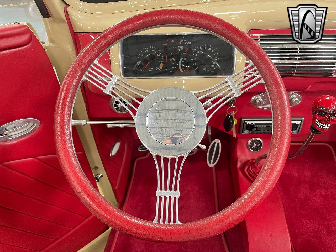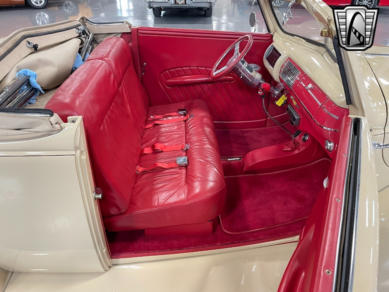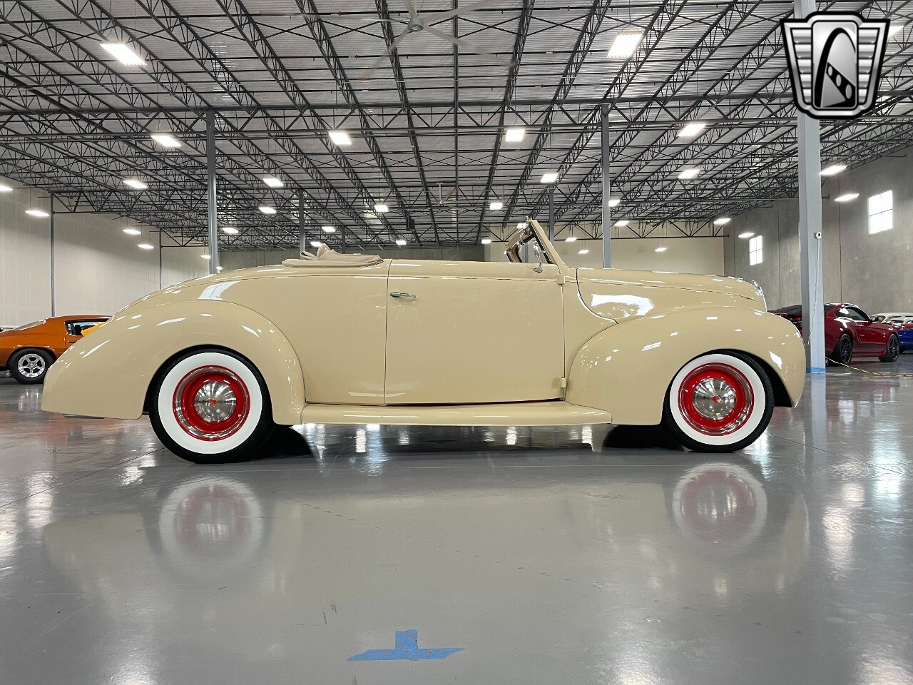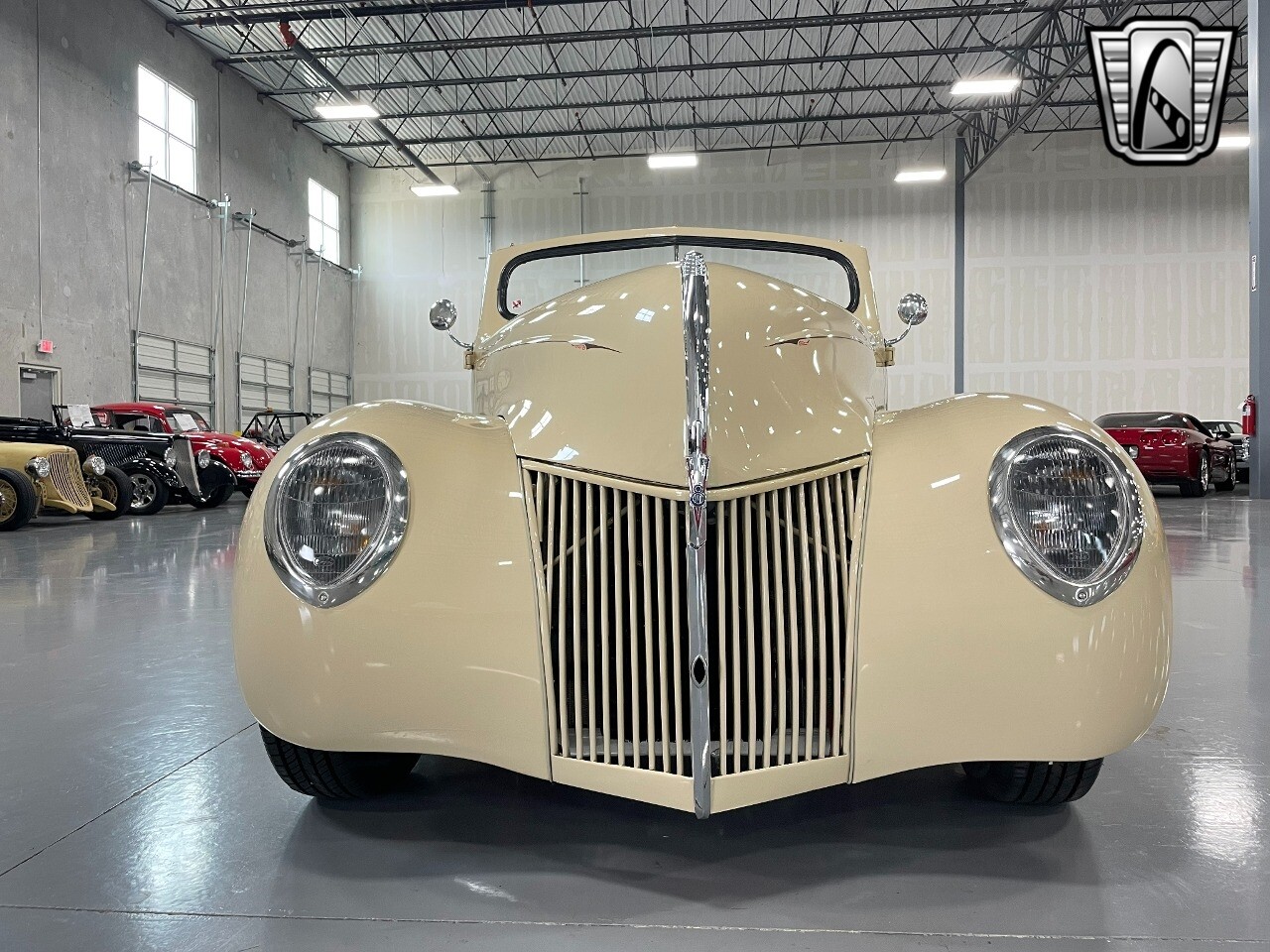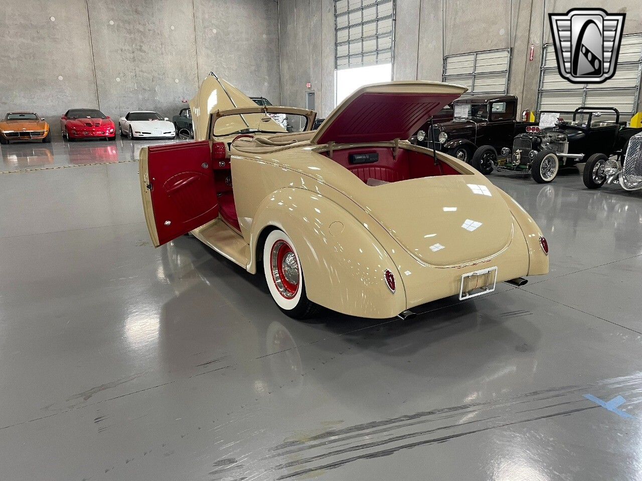 Gateway Classic Cars of San Antonio/Austin is proud to present this 1939 Ford Standard. The beige convertible top matches nicely with the Cream Beige paint makes this one of the few convertibles that looks terrific with the top in place. The bright red inside looks great against the red wheels and red accents to make this look like quite a thoughtful package inside and out. Under the hood, you'll find a fuel-injected 350 cubic-inch V8. It has all the right features you want, like upgraded pulleys, a serpentine belt, and an aluminum radiator with electric fan, shorty headers add power and rumble as they exhale into the dual exhaust. The Pete & Jakes chassis, a TCI tubular A-arm front suspension, ladder bar rear, adjustable coilovers, a Currie 9-inch rear, and Wilwood four-wheel power disc brakes help control the added power from the V8. Add in power steering and the four-speed automatic transmission with overdrive, and you've got a stellar rod that you can easily drive anywhere. There's also a Lokar floor shifter, upgraded readouts, and the banjo-style sports steering wheel is mounted on a tilt column. There are even the right luxuries for all-day driving, like power windows, an AM/FM/CD stereo, and modern R134a air conditioning. A shining and fuel-injected small block, a leather-lined A/C interior, four-wheel disc brakes, an overdrive transmission, and a sleek yet classic style on the outside makes for a thoughtful build that takes years to get right if you started from scratch..