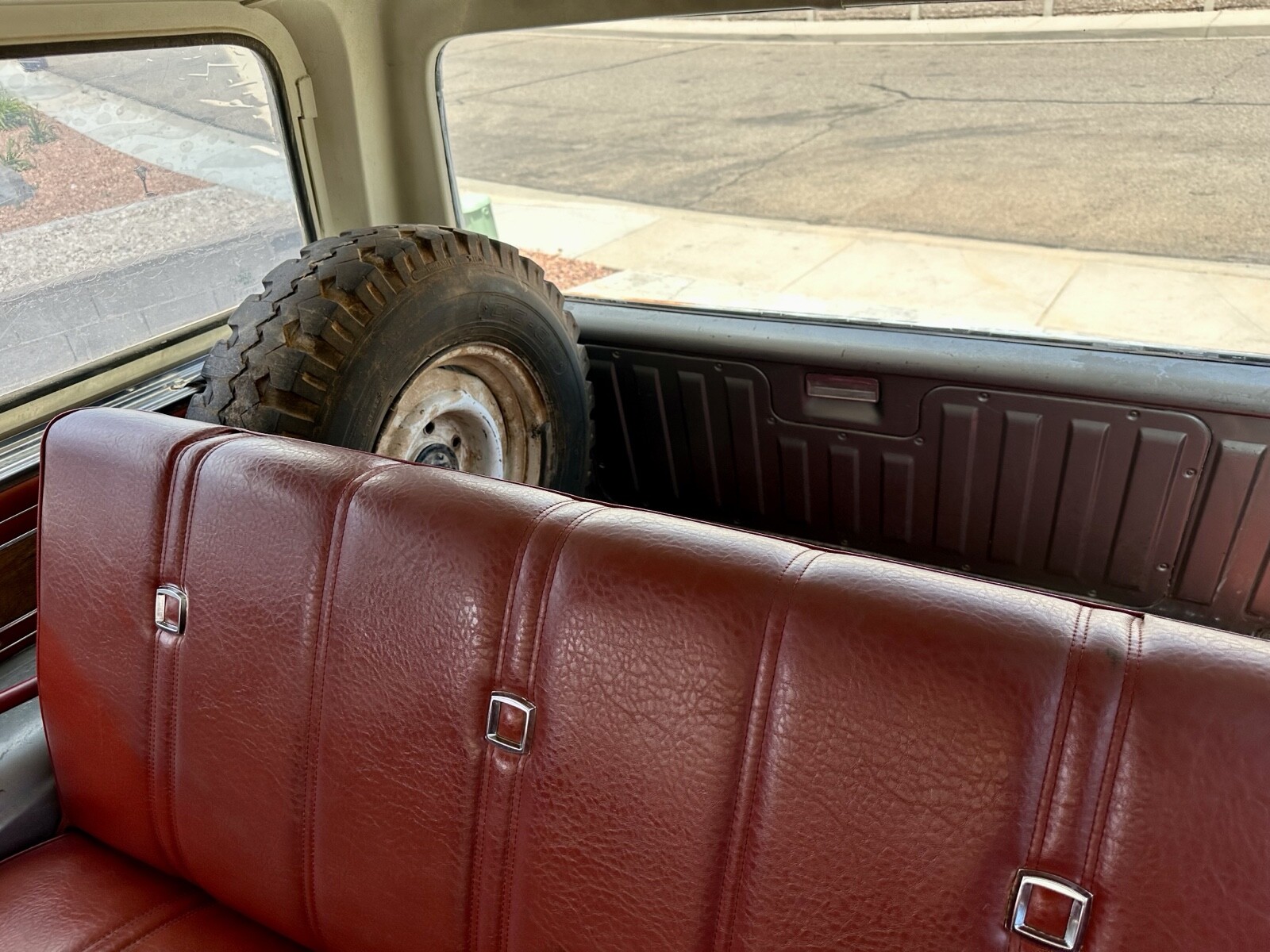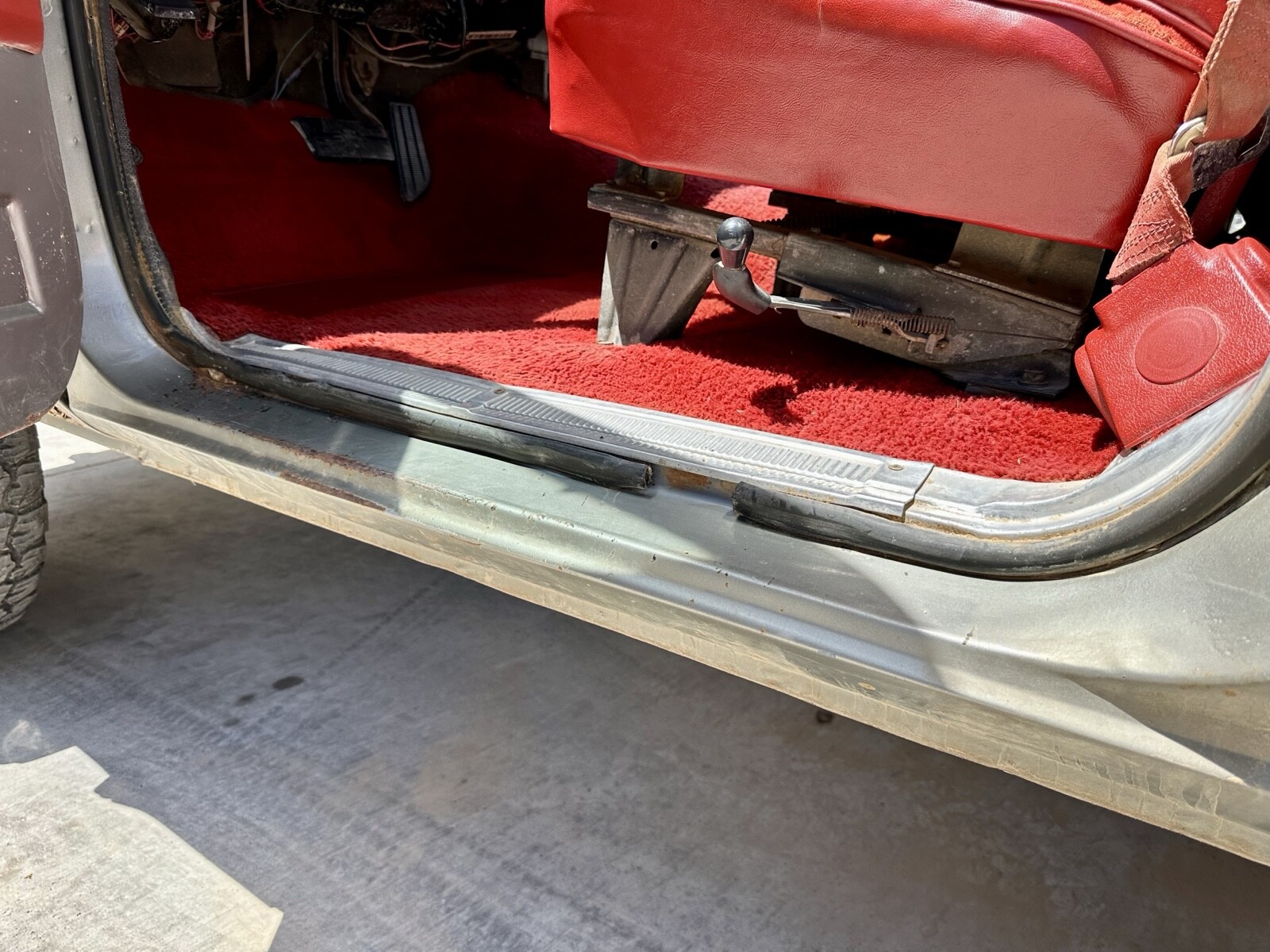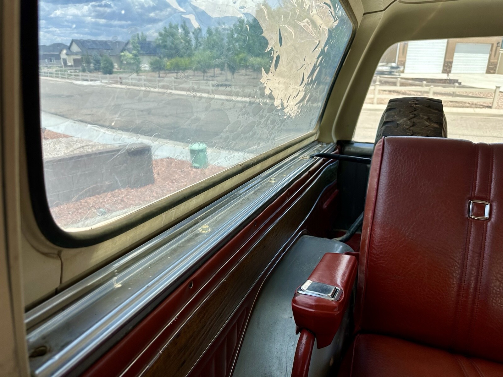This Jimmy is quite solid and all original, never wrecked, all original panels, carpet, seating material etc. the only rust is has is some lower rear quarter and outer rocker stuff. Floors, boxes, frame, windshield frame and everything is nice. The rear bumper has a dent, the Fiberglass top has never been off for what it’s worth.
