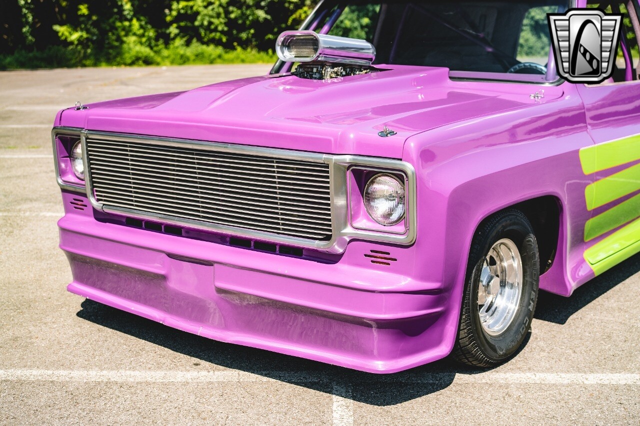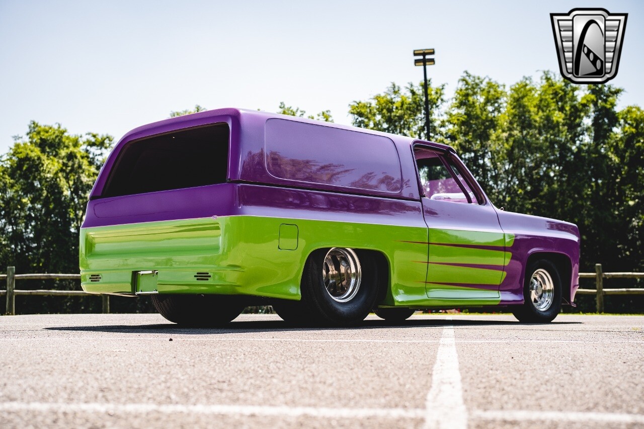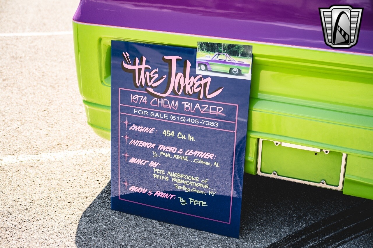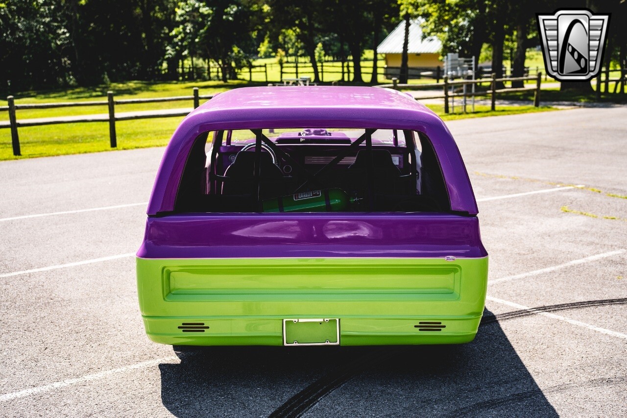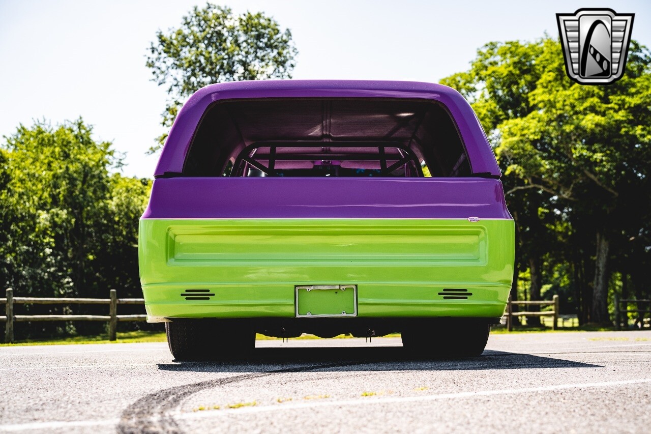 Gateway Classic Cars is proud to digitally present to you a classic blend of power and nostalgia: this 1974 GMC disguised as the iconic Chevy Blazer with a striking purple pearl and green exterior and a matching purple tweed interior. This remarkable vehicle was professionally built by Pete's Fabrication in Bowling Green, KY. Every piece of sheet metal was replaced with genuine GM parts. Equipped with a robust 454cid big block V8 engine topped with a 6-71 supercharger and Nitrous injection. Behind that is a TH400 automatic transmission, Currie 9-inch rear axle, coil over shocks, ladder bars. A blast to drive.