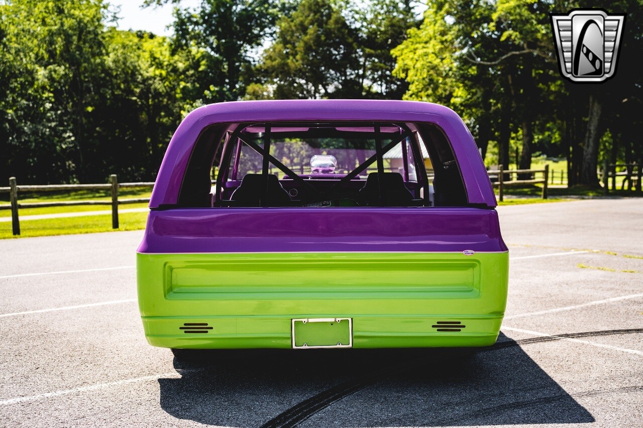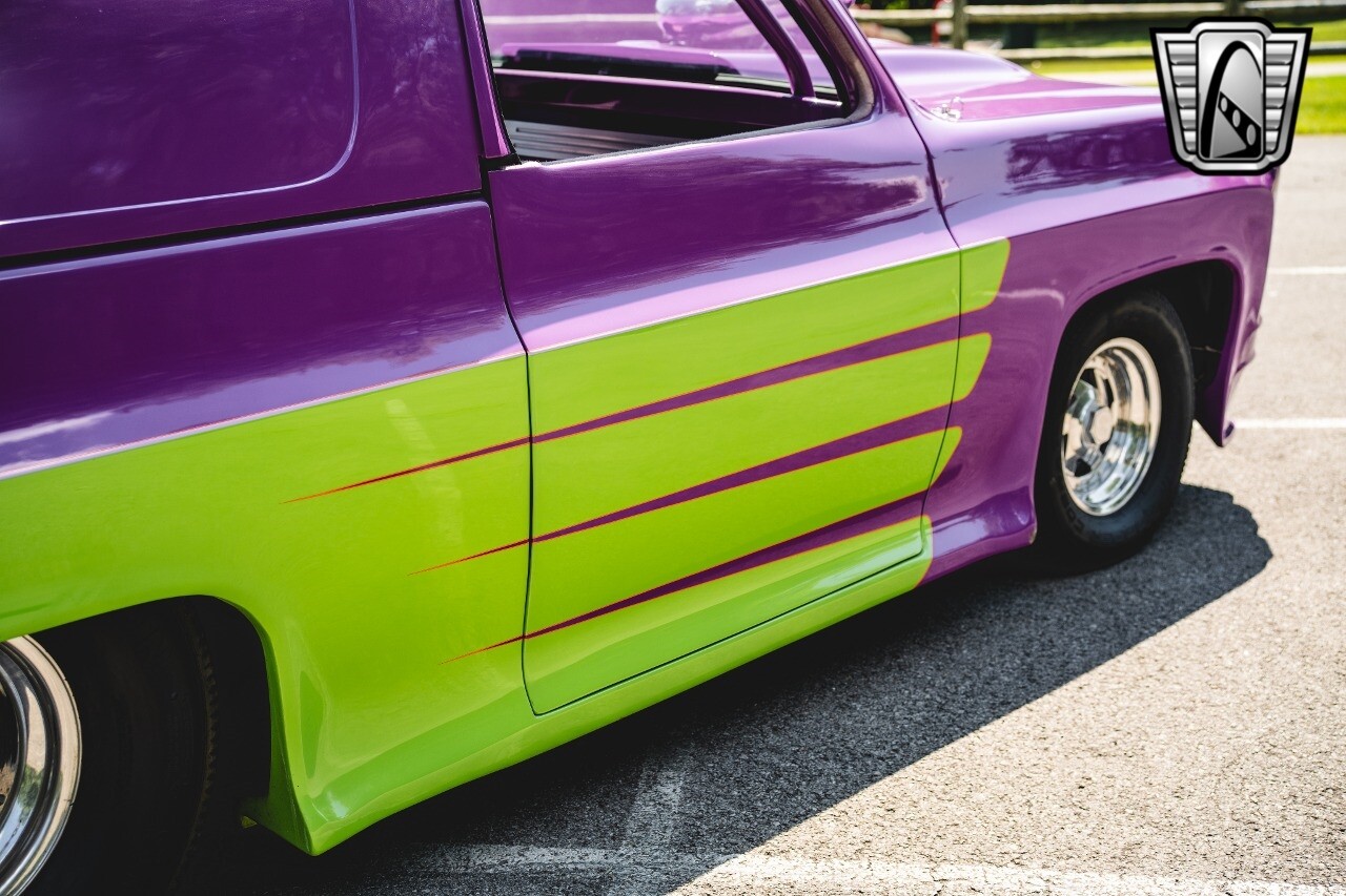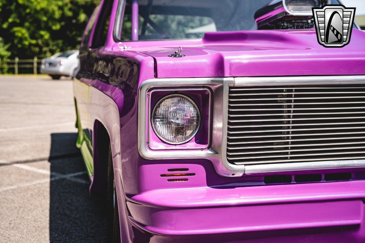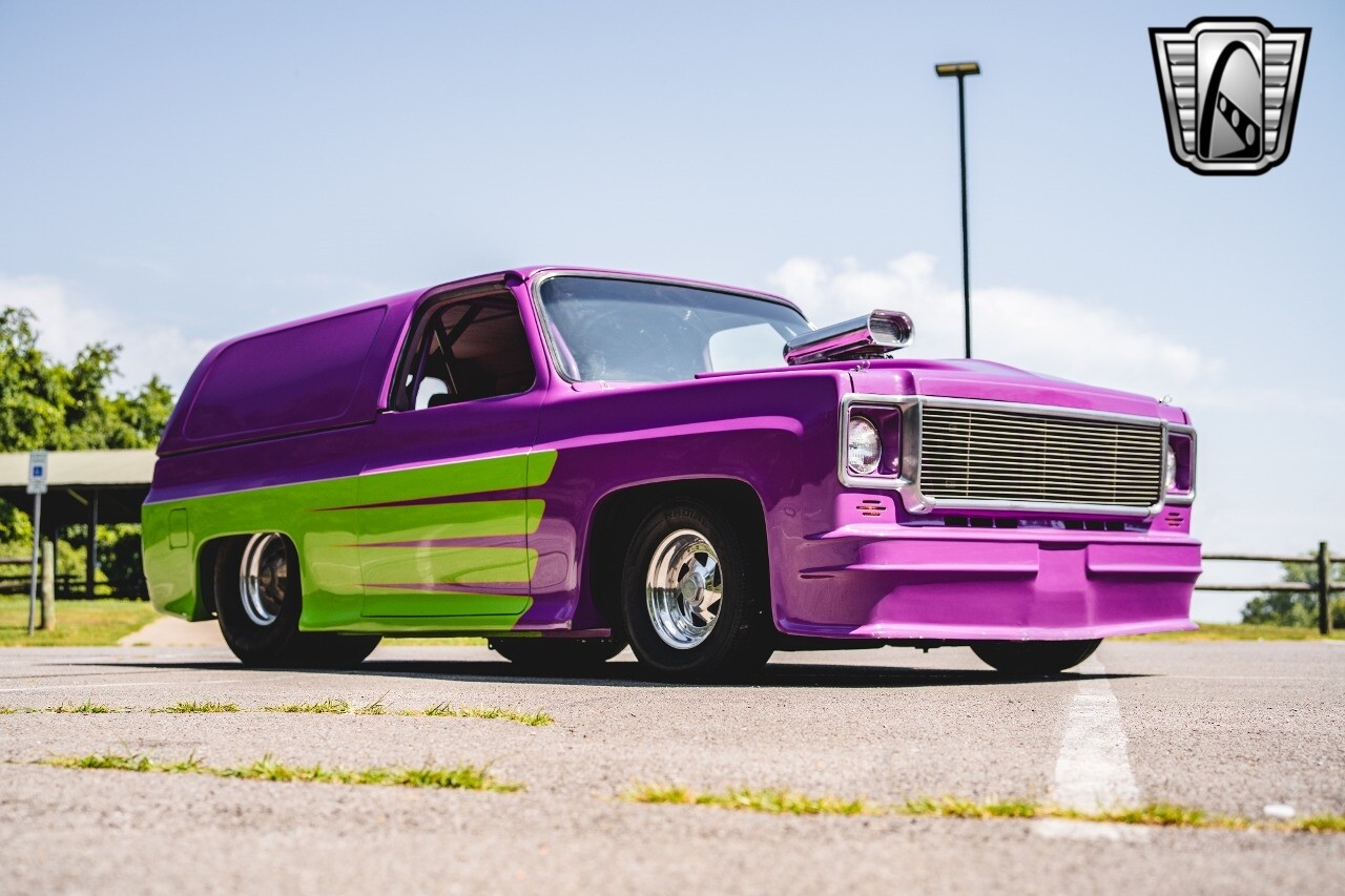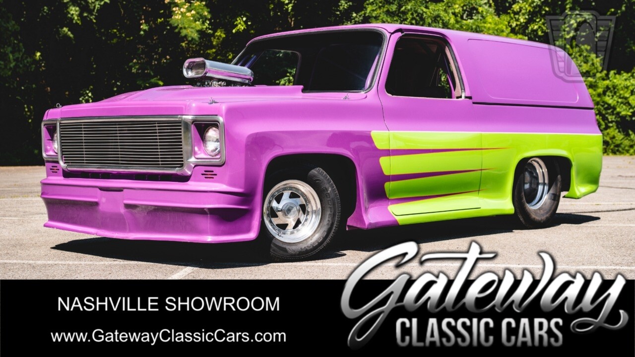 Gateway Classic Cars is proud to digitally present to you a classic blend of power and nostalgia: this 1974 GMC disguised as the iconic Chevy Blazer with a striking purple pearl and green exterior and a matching purple tweed interior. This remarkable vehicle was professionally built by Pete's Fabrication in Bowling Green, KY. Every piece of sheet metal was replaced with genuine GM parts. Equipped with a robust 454cid big block V8 engine topped with a 6-71 supercharger and Nitrous injection. Behind that is a TH400 automatic transmission, Currie 9-inch rear axle, coil over shocks, ladder bars. A blast to drive.