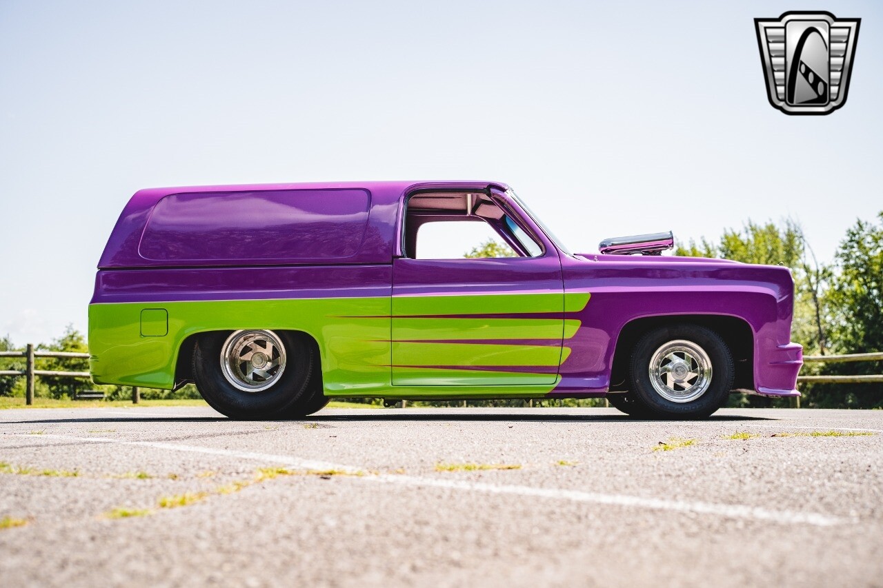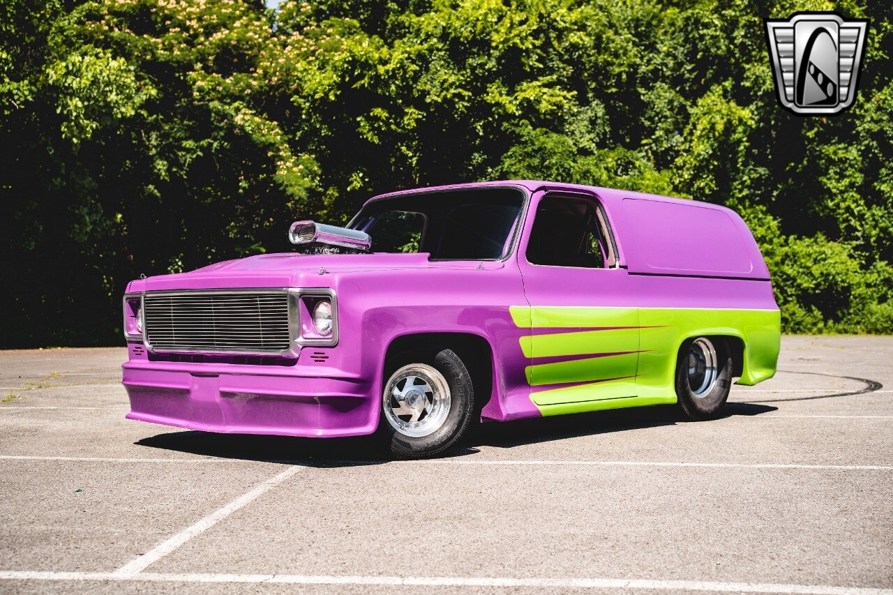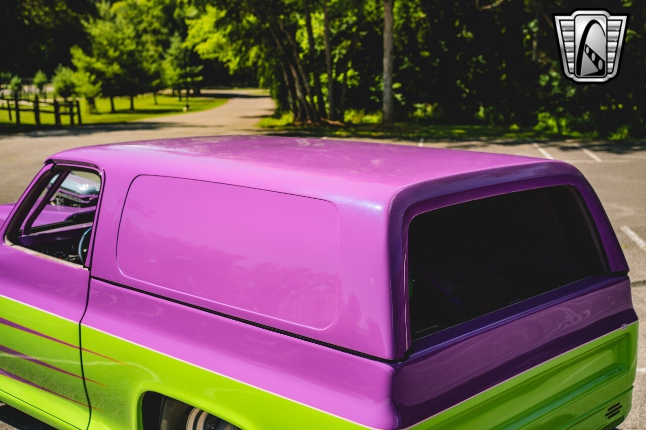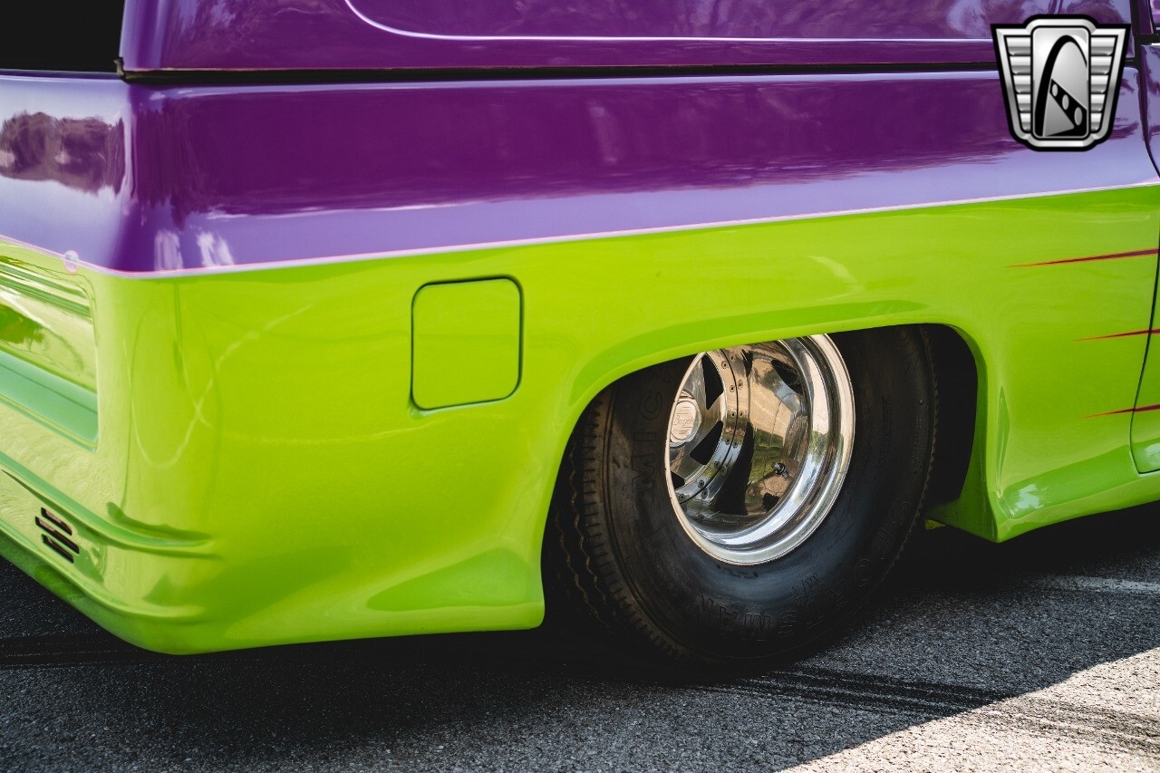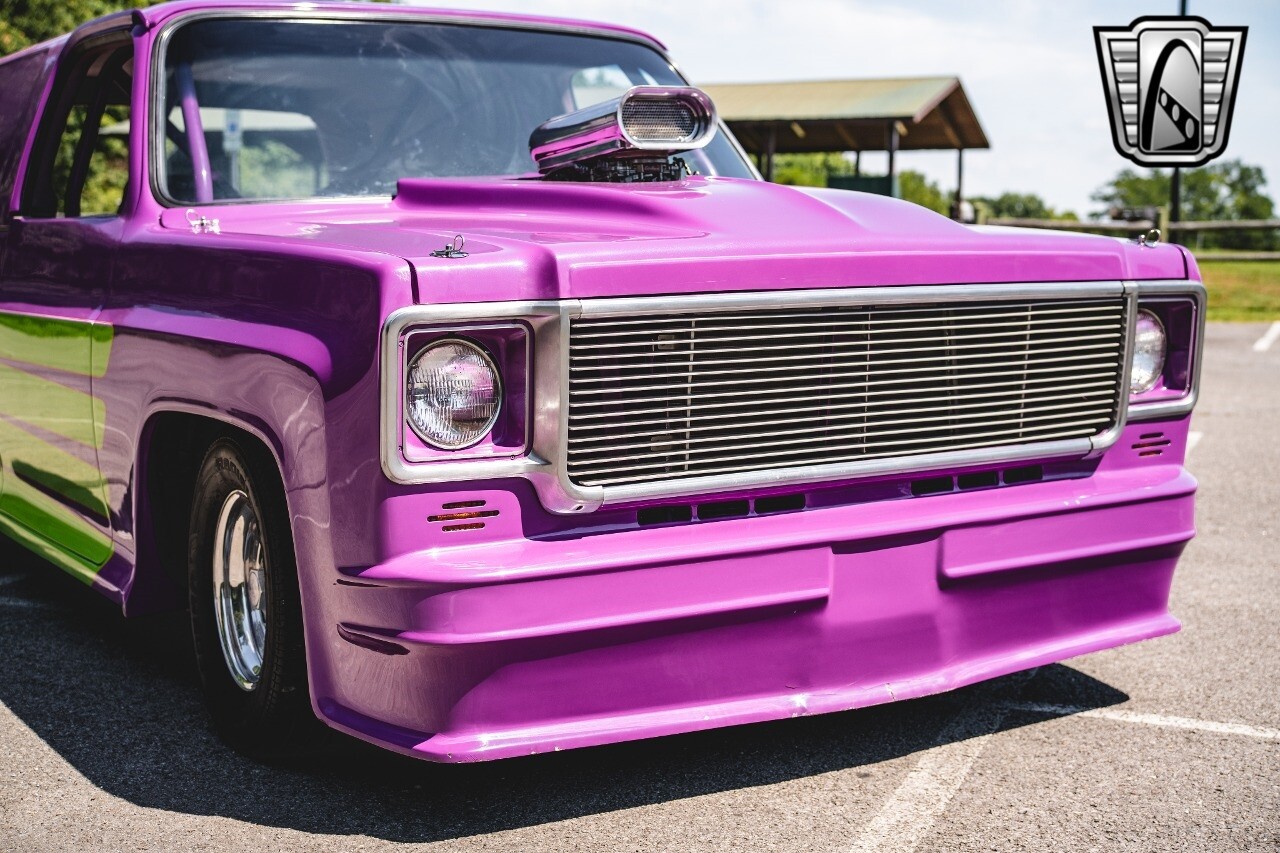 Gateway Classic Cars is proud to digitally present to you a classic blend of power and nostalgia: this 1974 GMC disguised as the iconic Chevy Blazer with a striking purple pearl and green exterior and a matching purple tweed interior. This remarkable vehicle was professionally built by Pete's Fabrication in Bowling Green, KY. Every piece of sheet metal was replaced with genuine GM parts. Equipped with a robust 454cid big block V8 engine topped with a 6-71 supercharger and Nitrous injection. Behind that is a TH400 automatic transmission, Currie 9-inch rear axle, coil over shocks, ladder bars. A blast to drive.