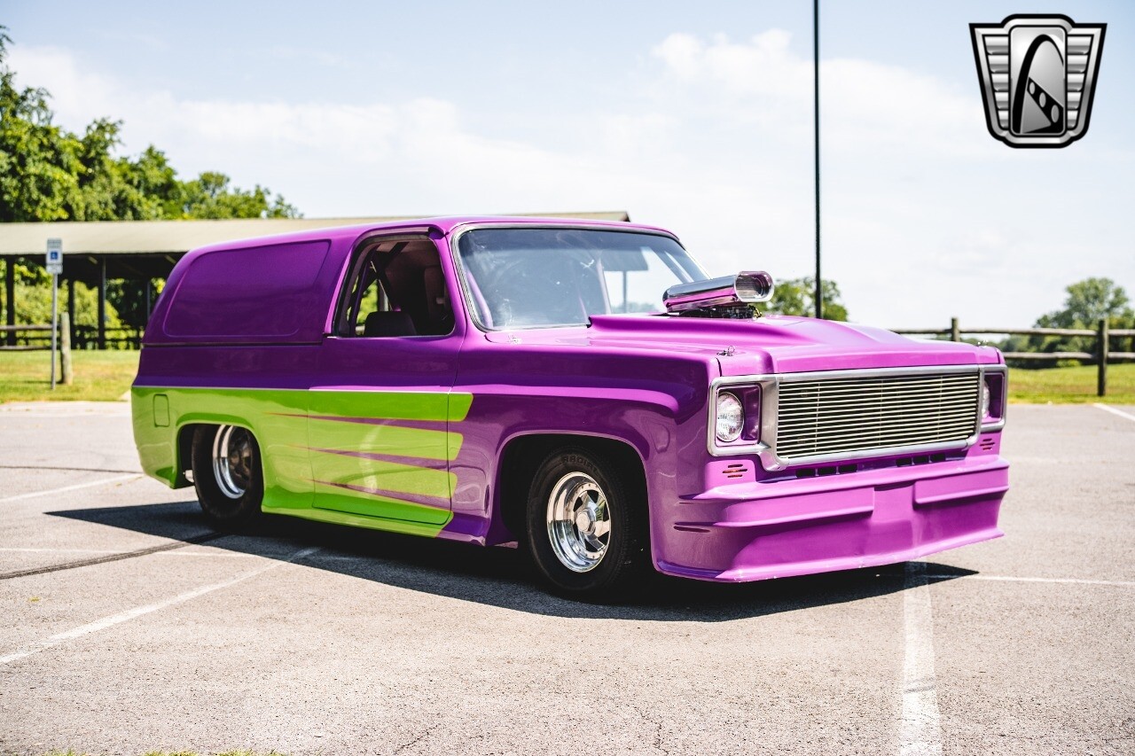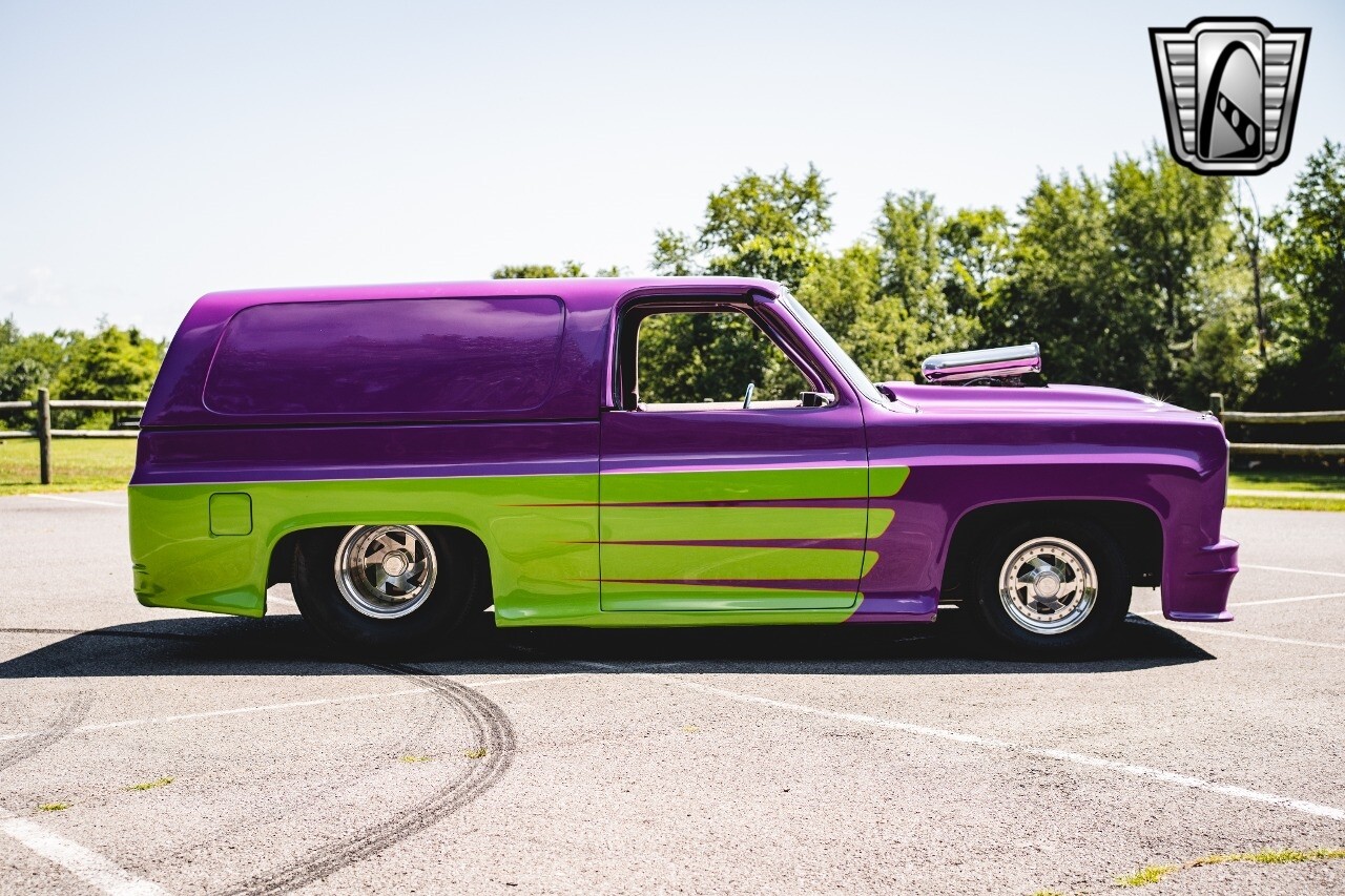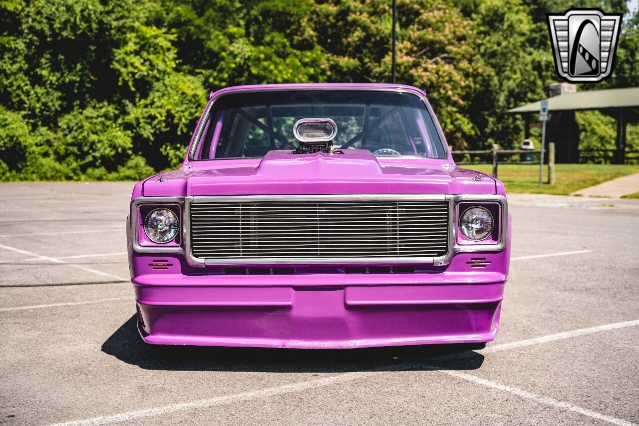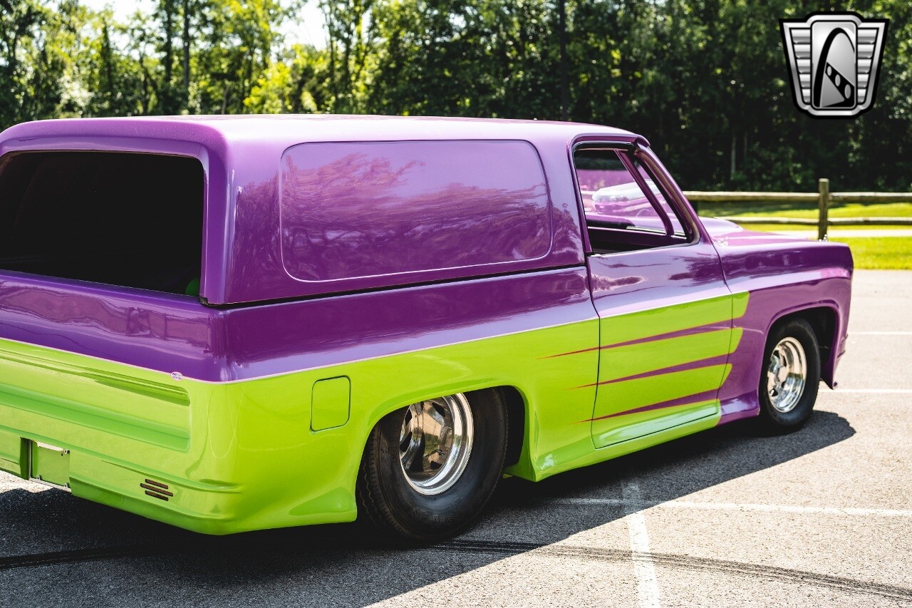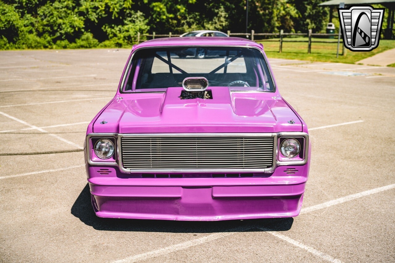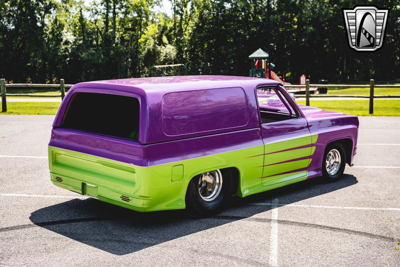 Gateway Classic Cars is proud to digitally present to you a classic blend of power and nostalgia: this 1974 GMC disguised as the iconic Chevy Blazer with a striking purple pearl and green exterior and a matching purple tweed interior. This remarkable vehicle was professionally built by Pete's Fabrication in Bowling Green, KY. Every piece of sheet metal was replaced with genuine GM parts. Equipped with a robust 454cid big block V8 engine topped with a 6-71 supercharger and Nitrous injection. Behind that is a TH400 automatic transmission, Currie 9-inch rear axle, coil over shocks, ladder bars. A blast to drive.