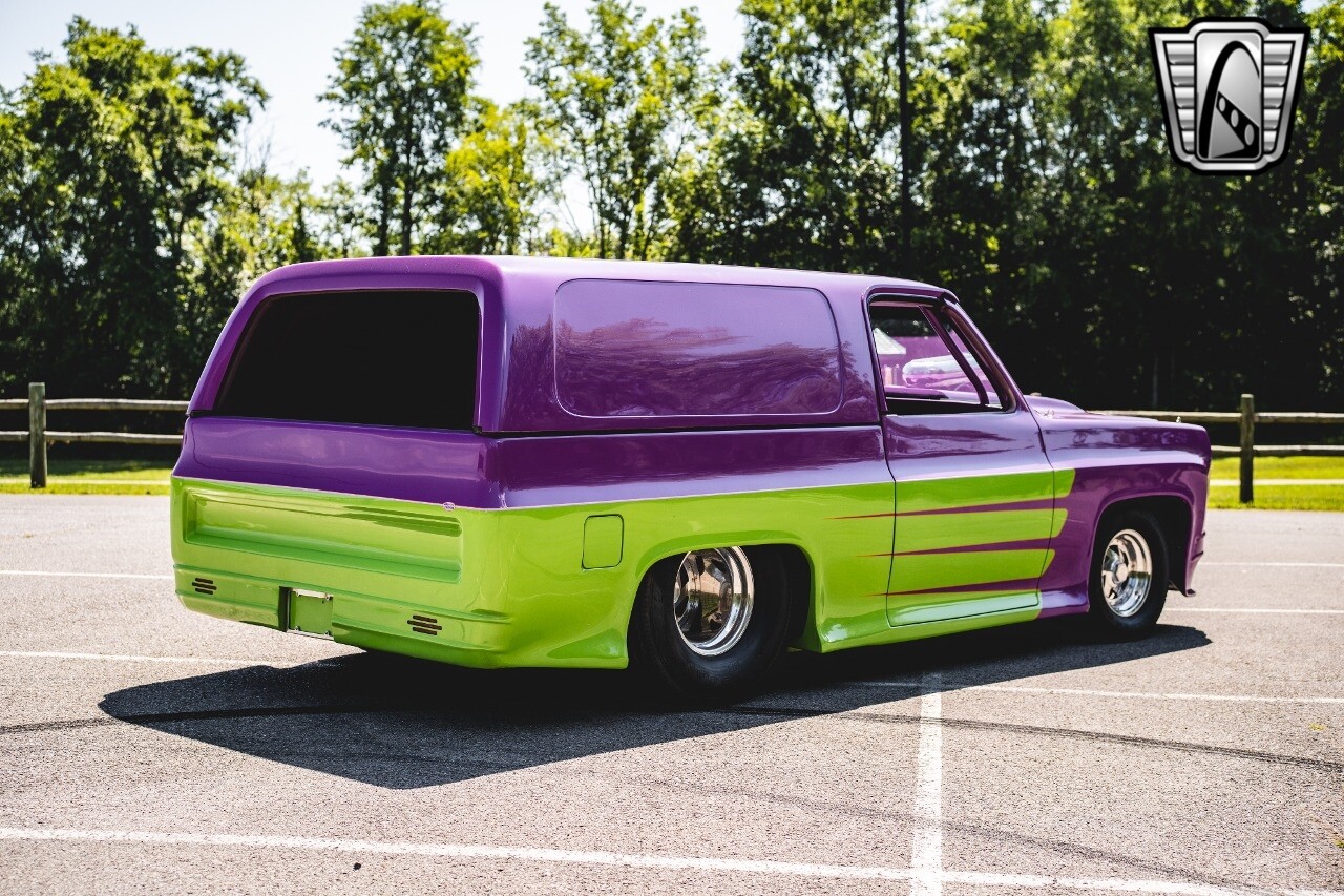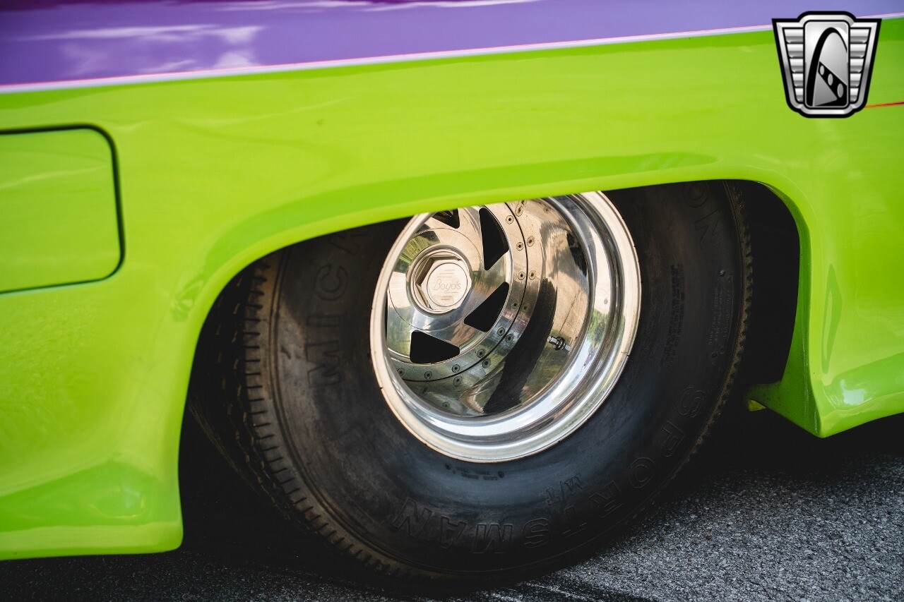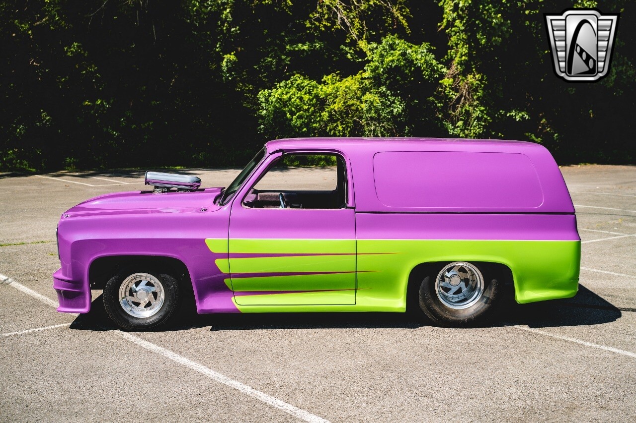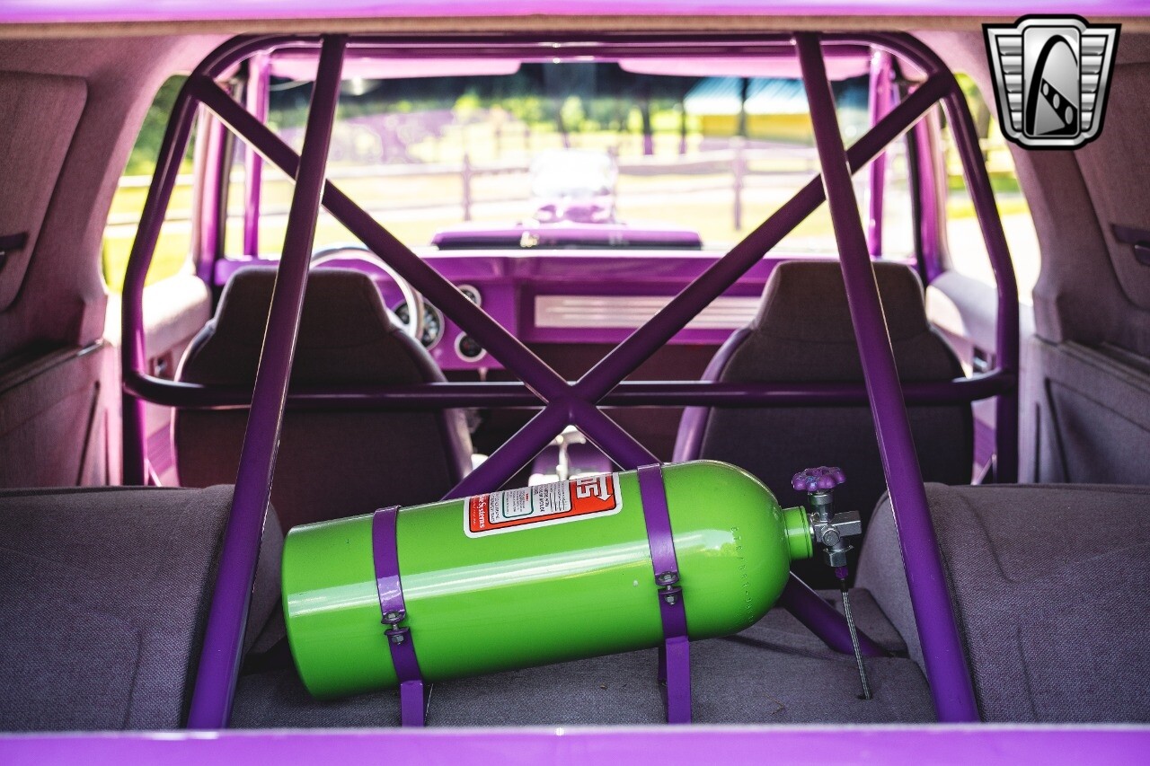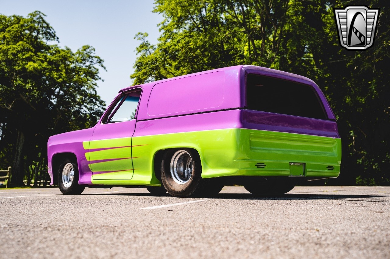 Gateway Classic Cars is proud to digitally present to you a classic blend of power and nostalgia: this 1974 GMC disguised as the iconic Chevy Blazer with a striking purple pearl and green exterior and a matching purple tweed interior. This remarkable vehicle was professionally built by Pete's Fabrication in Bowling Green, KY. Every piece of sheet metal was replaced with genuine GM parts. Equipped with a robust 454cid big block V8 engine topped with a 6-71 supercharger and Nitrous injection. Behind that is a TH400 automatic transmission, Currie 9-inch rear axle, coil over shocks, ladder bars. A blast to drive.