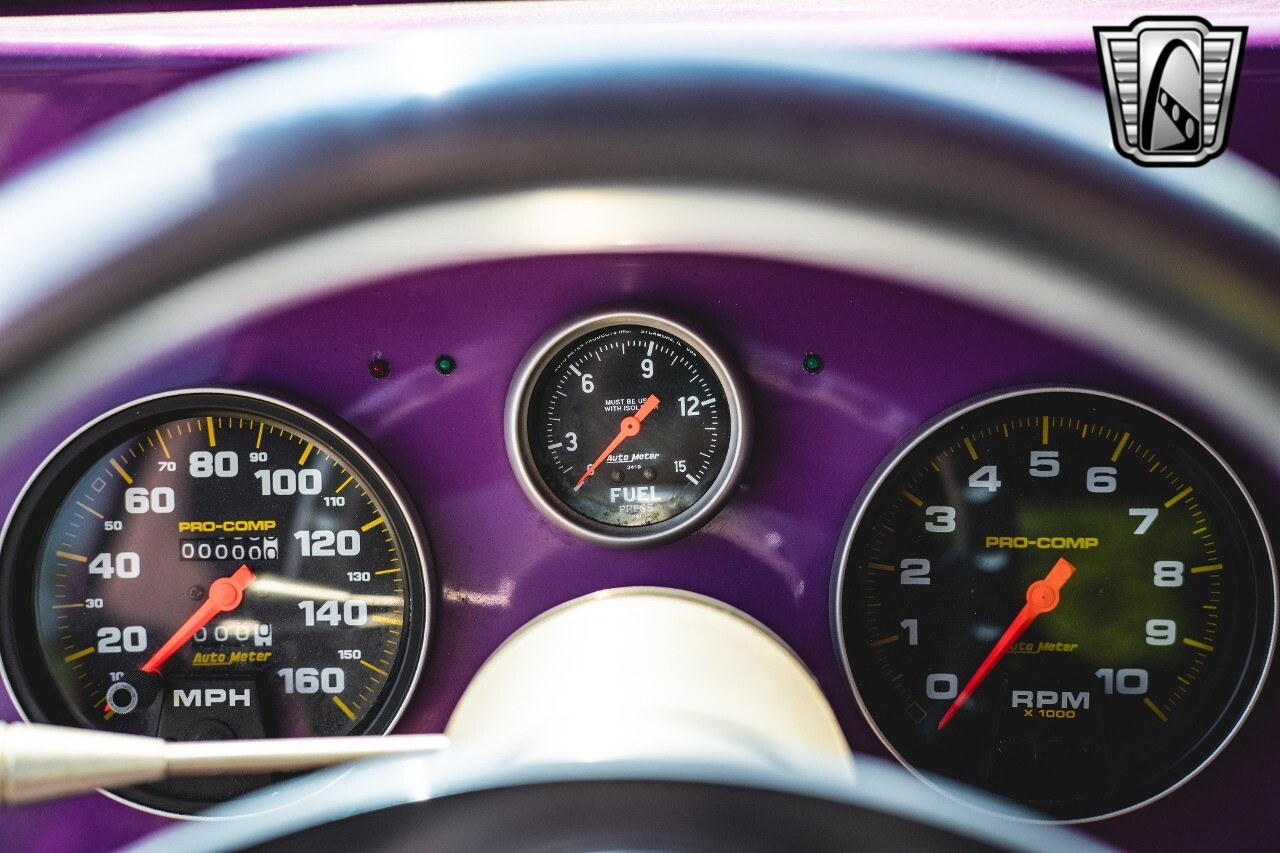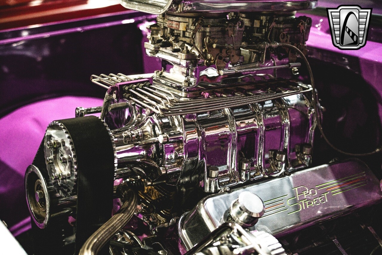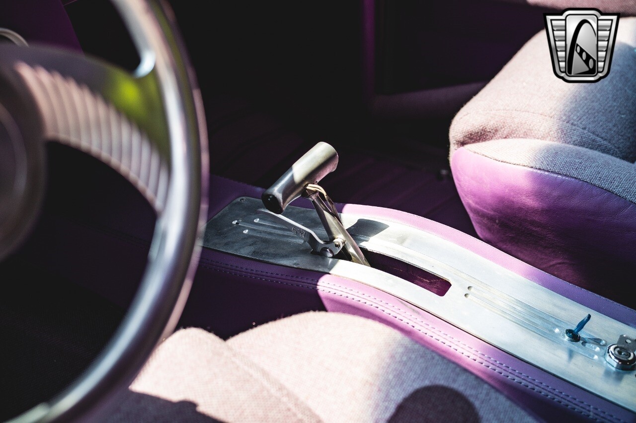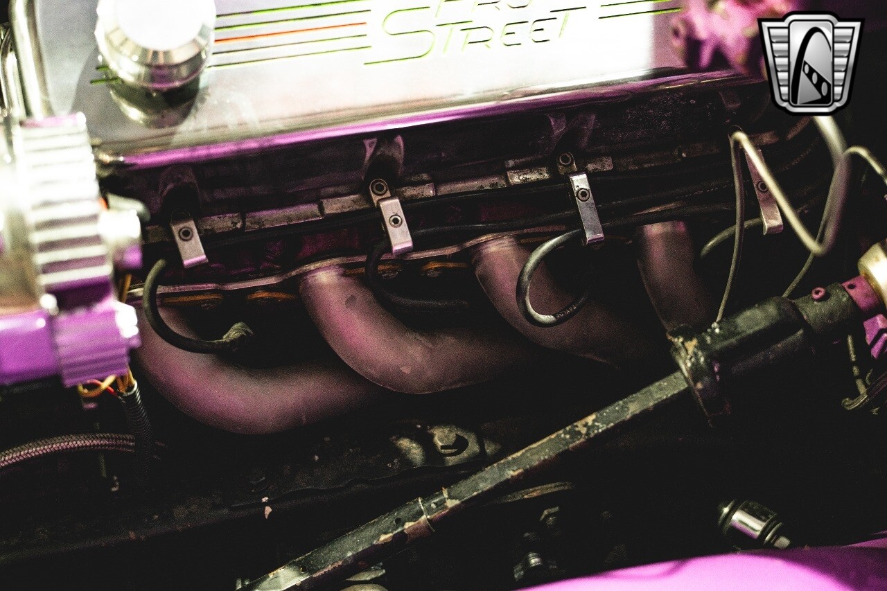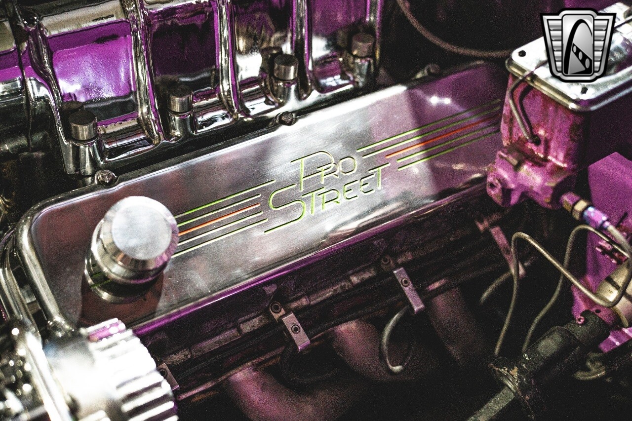 The aluminum wheels are Boyd Coddington that are mounted to giant Mickey Thompson tires giving it that mean Pro Street look. The interior was also professionally done by Paul Atkins Interiors. Custom color matched dash and roll cage with the rest finished in leather and tweed. Billet tilt steering column, AutoMeter gauges, seatbelts and a B&M shifter.