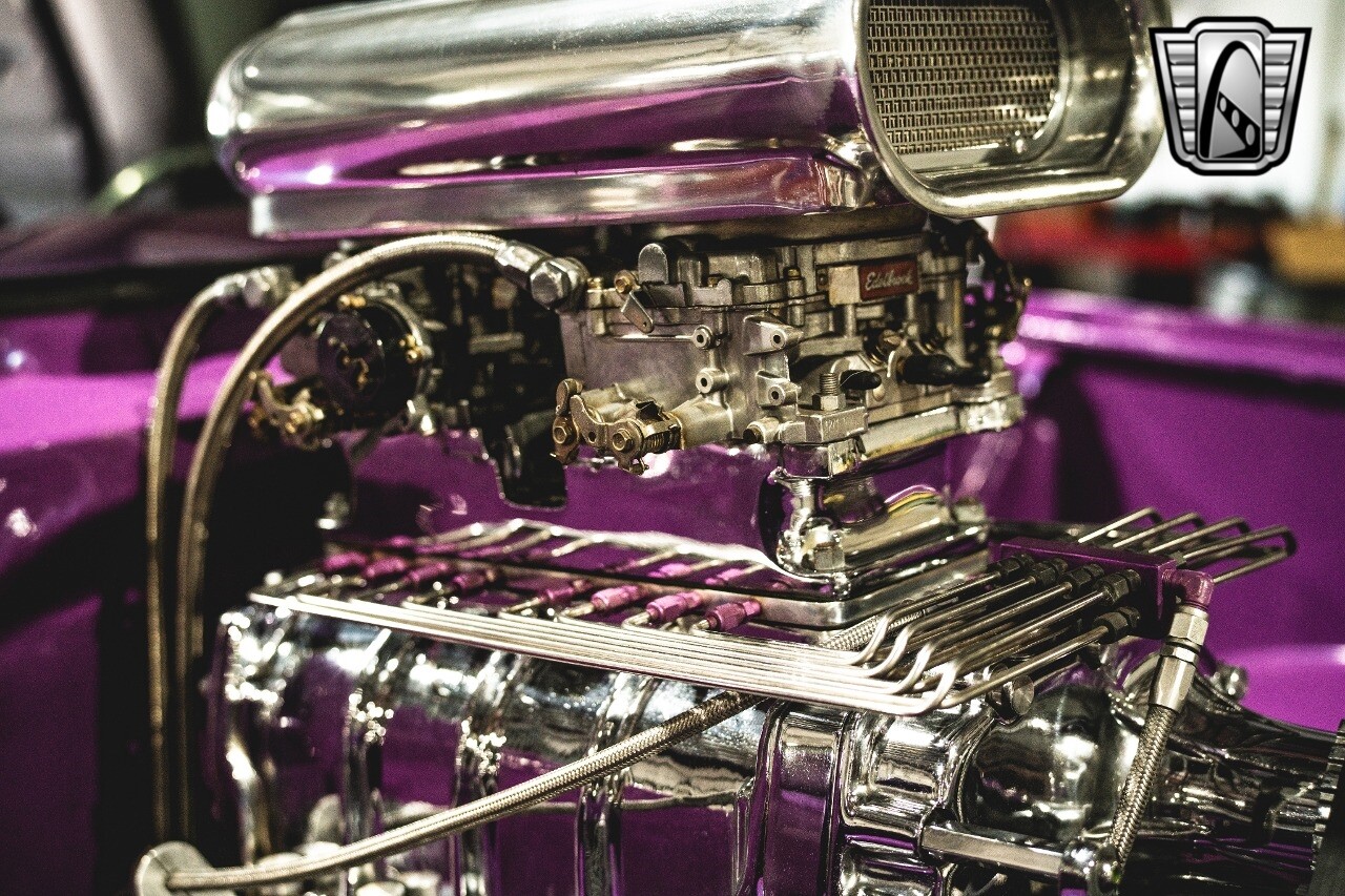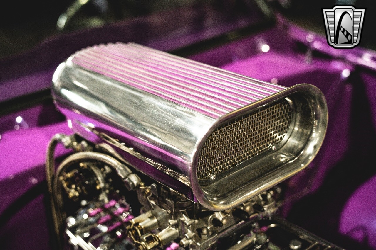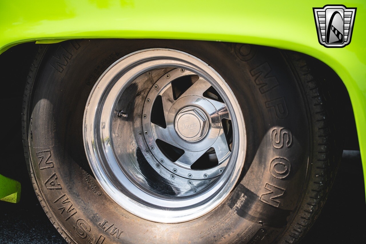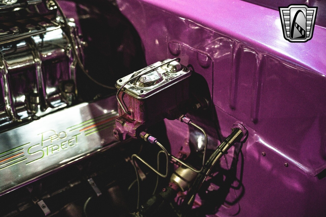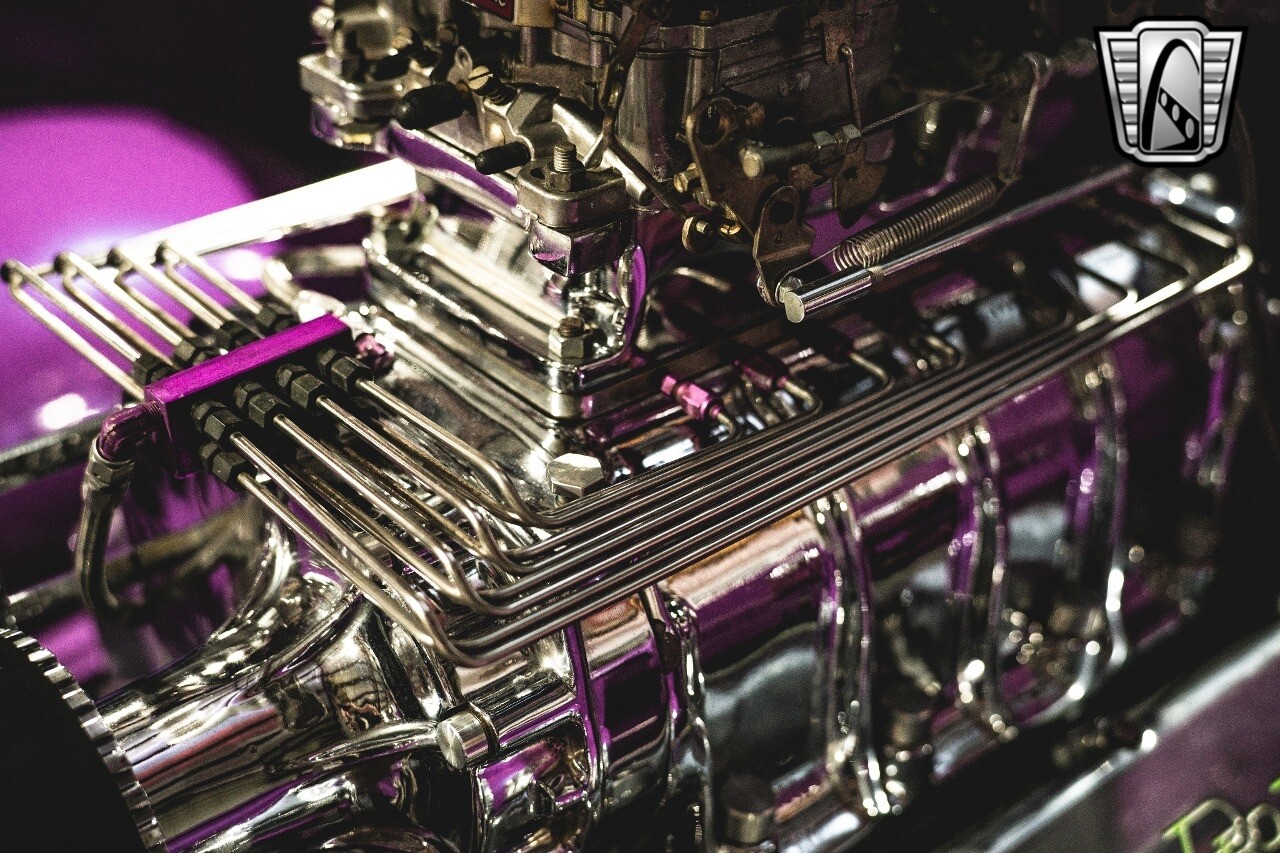 The aluminum wheels are Boyd Coddington that are mounted to giant Mickey Thompson tires giving it that mean Pro Street look. The interior was also professionally done by Paul Atkins Interiors. Custom color matched dash and roll cage with the rest finished in leather and tweed. Billet tilt steering column, AutoMeter gauges, seatbelts and a B&M shifter.