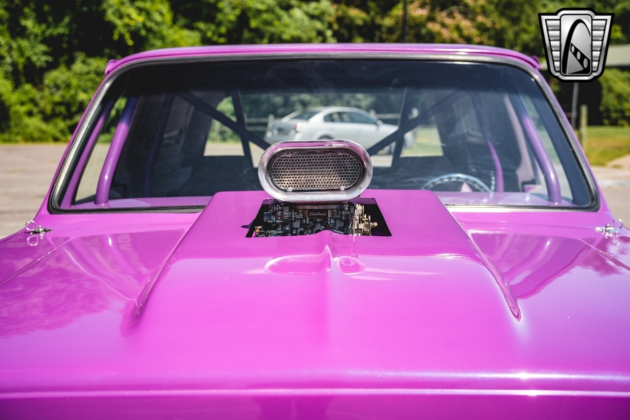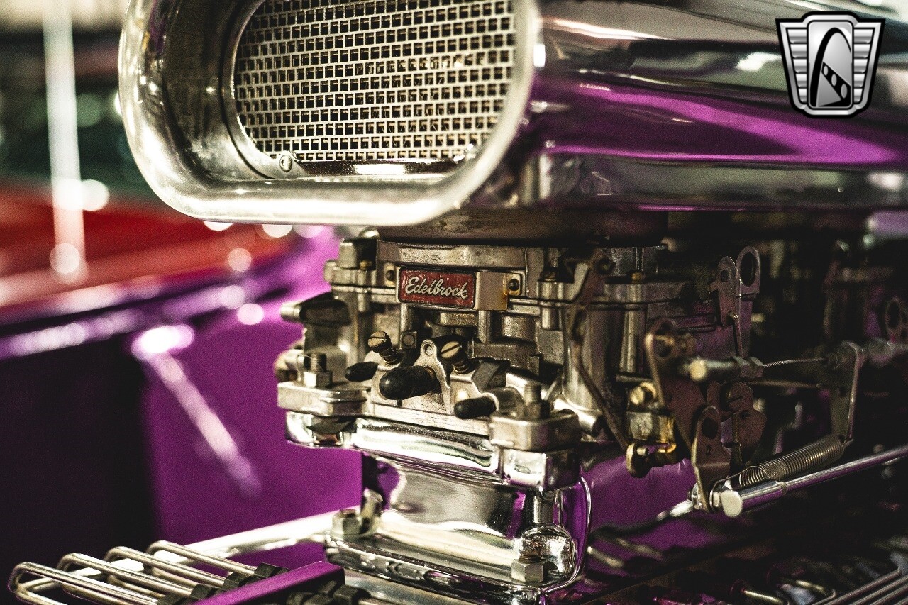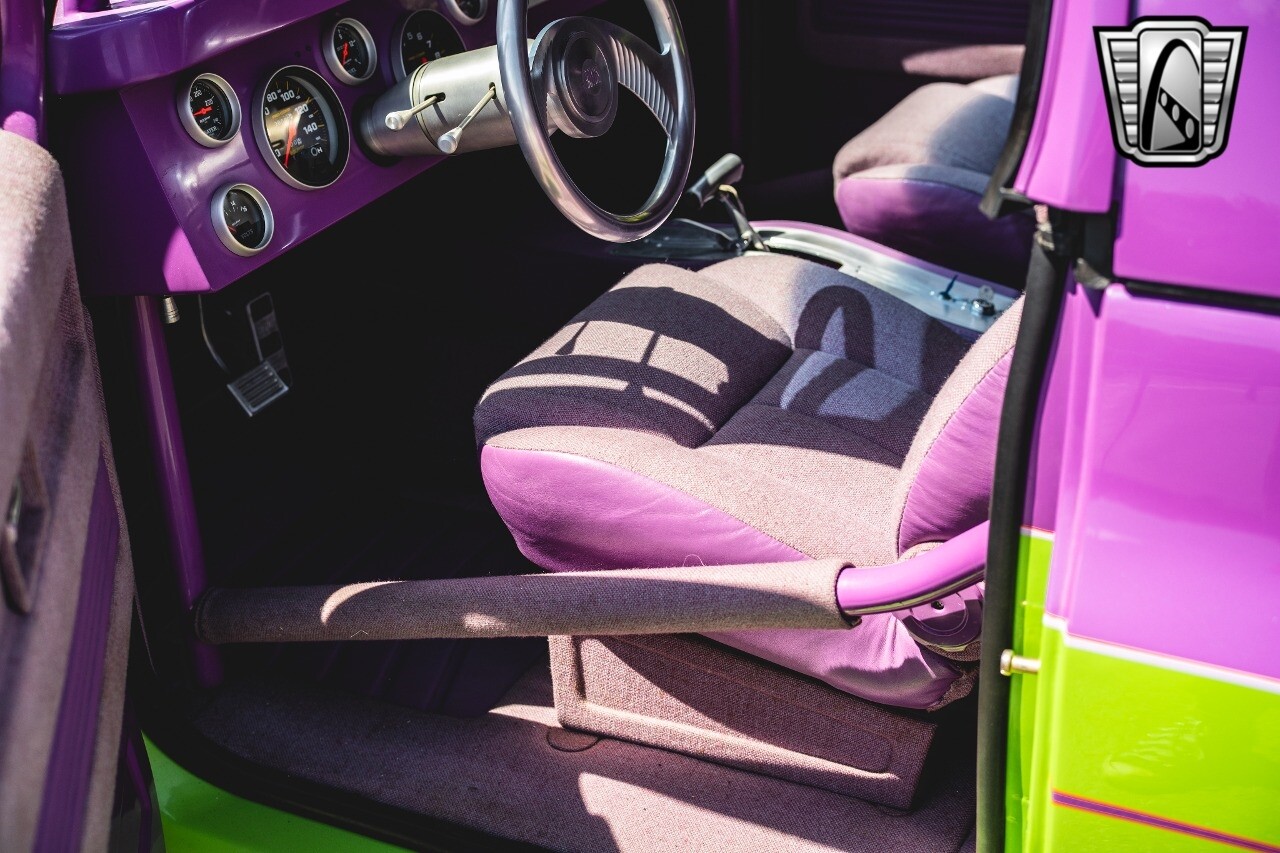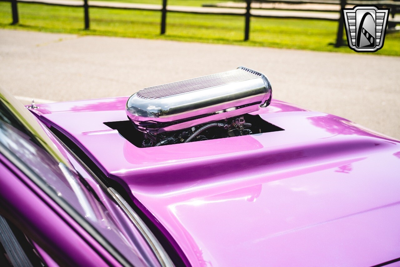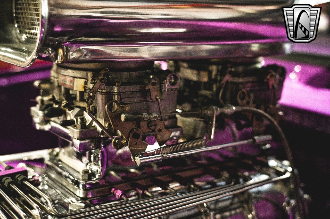 The aluminum wheels are Boyd Coddington that are mounted to giant Mickey Thompson tires giving it that mean Pro Street look. The interior was also professionally done by Paul Atkins Interiors. Custom color matched dash and roll cage with the rest finished in leather and tweed. Billet tilt steering column, AutoMeter gauges, seatbelts and a B&M shifter.