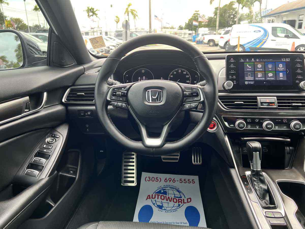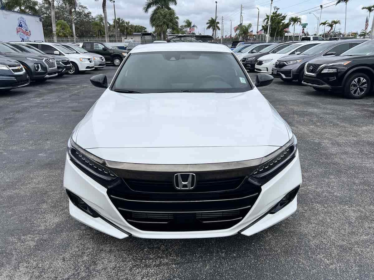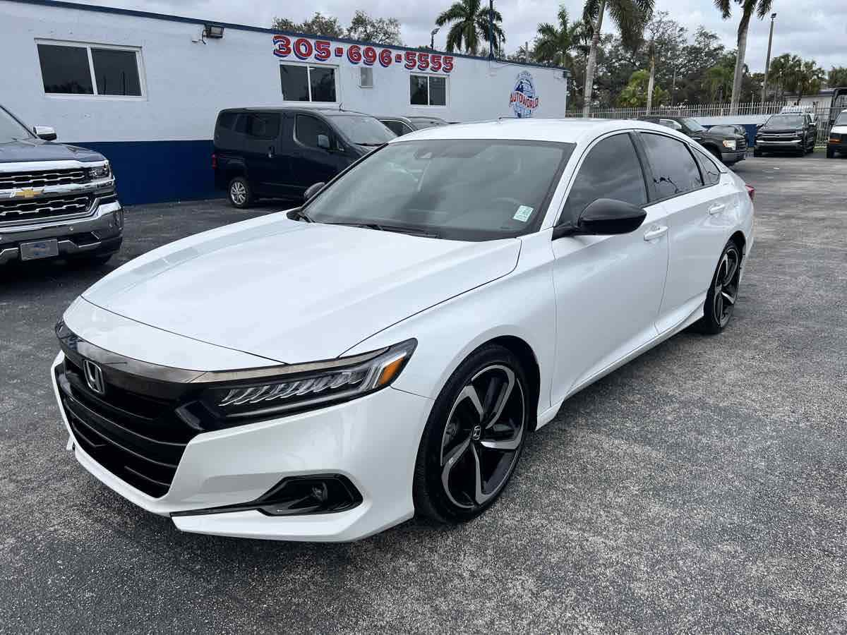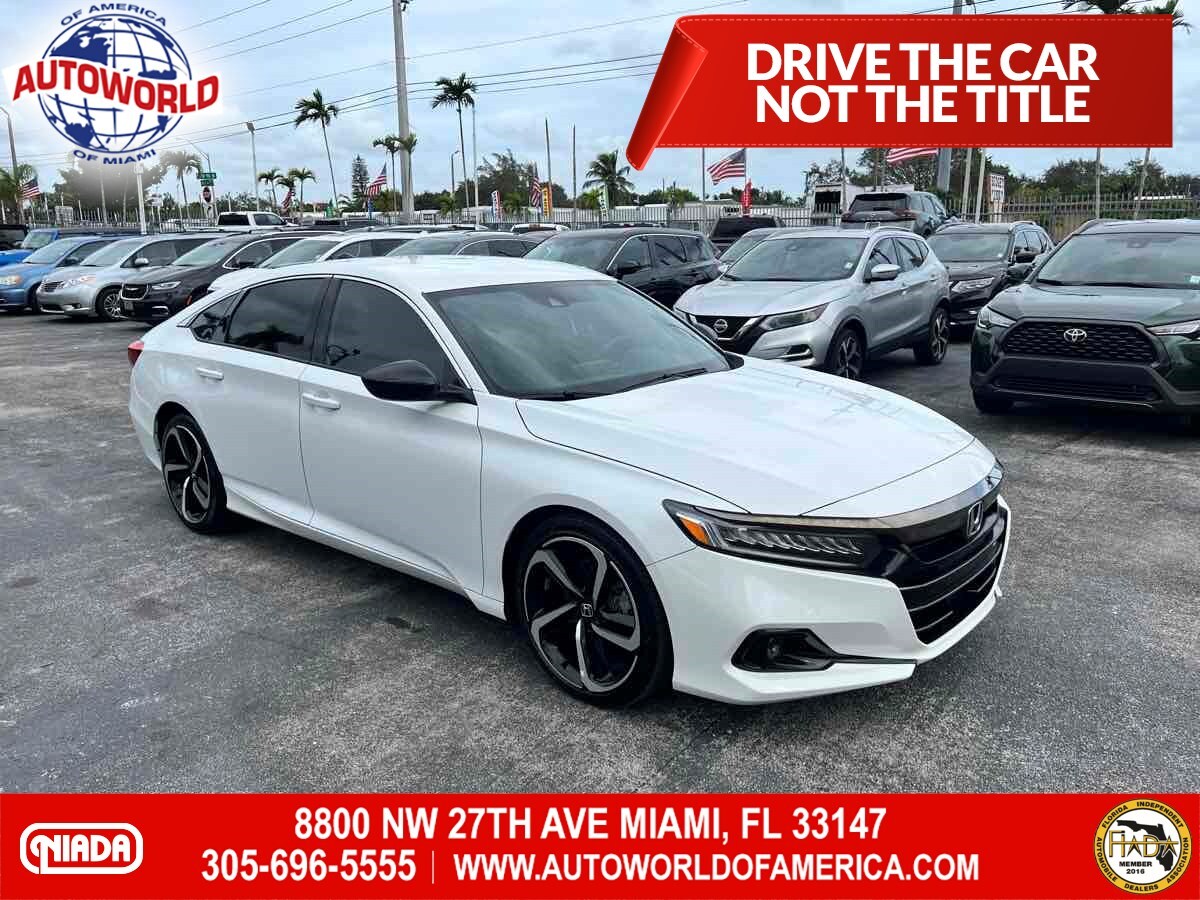 Sleek and sophisticated - our 2022 Honda Accord Sport Sedan sets a high bar for better driving in Platinum White Pearl! Powered by a TurboCharged 1.5 Liter 4 Cylinder generating 192hp for a paddle-shifted CVT for precise performance. You can also enjoy enhanced handling in this Front Wheel Drive sedan - and it sees nearly 35mpg on the highway with a crisp and commanding design. Our Accord's highly acclaimed exterior excites your senses with LED lighting - fog lamps - bold 19-inch alloy wheels - chrome exhaust finishers - and a gloss-black rear spoiler. Our Sport cabin can make you feel special with comfortable cloth seats - 12-way power for the driver - a leather-wrapped steering wheel - dual-zone automatic climate control - sport pedals - keyless access - and pushbutton ignition. High-tech Honda infotainment is at your service with an 8-inch touchscreen - Apple CarPlay - Android Auto - Bluetooth - and an eight-speaker sound system. There's clever interior storage - too! Honda helps keep you safely on the move with intelligent assistance from automatic braking - a multi-angle rearview camera - lane-keeping assistance - adaptive cruise control - ABS - airbags - and more. It's time to get more out of everyday driving in our Accord Sport! Save this Page and Call for Availability. We Know You Will Enjoy Your Test Drive Towards Ownership! This vehicle has a branded title and was DMV inspected in Florida. It is in excellent condition - and everything works perfectly - we have test driven it several times and checked to make sure all the options and features work as they should. It is priced thousands below its J.D. Power retail value based on advertised trim - miles - and options. Our vehicles go through a 151-Point Inspection and this vehicle includes a 6 Month 6 -000 Miles in-house warranty*. It is ready to go for local - nationwide - or international shipping. At Autoworld you will save thousands without sacrificing quality. You can now afford a newer model year - higher trim level - and even lower miles than what you were expecting in your price range. For more than 30 years customers worldwide agree that vehicles from Autoworld of America offer the best value and quality. $$$ DRIVE THE CAR - NOT THE TITLE - SAVE THOUSANDS $$$