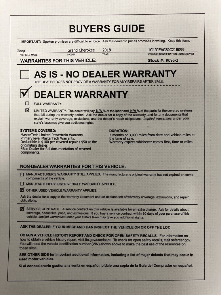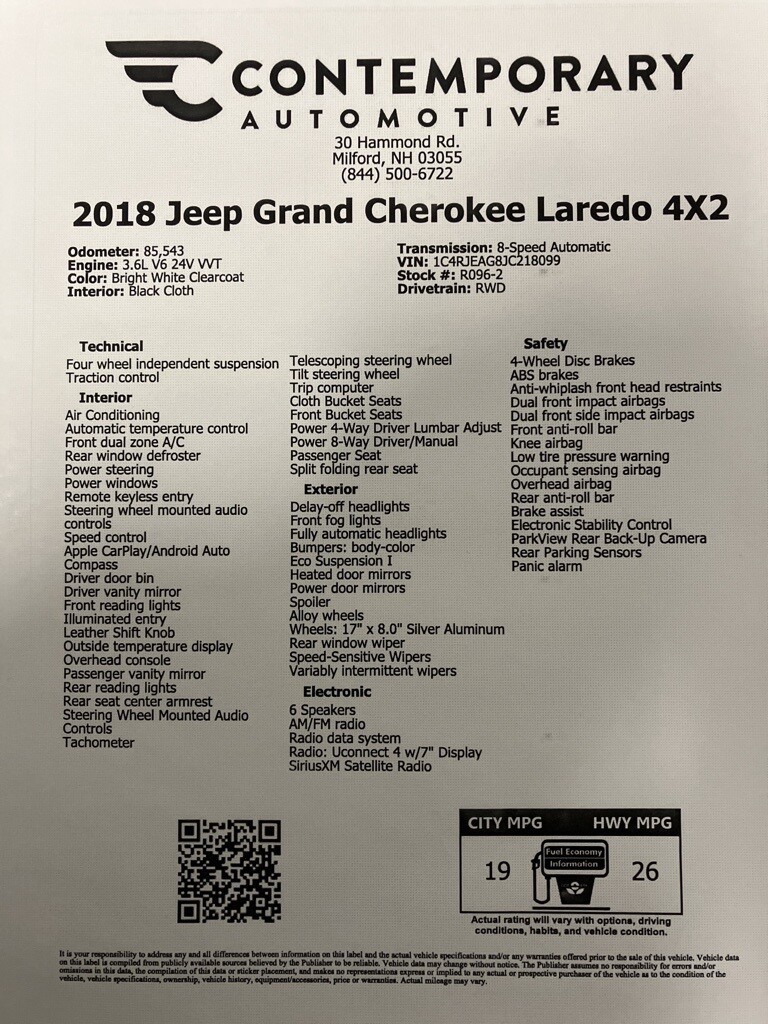 CONTEMPORARY CHRYSLER DODGE JEEP RAM is proud to present you with another True Market Priced Pre-Owned Vehicle. This 2018 Jeep Grand Cherokee Laredo 4X2 is loaded with the following Factory Options: Quick Order Package 2BE Laredo E (Bright Side Roof Rails, Power 4-Way Driver Lumbar Adjust, Power 8-Way Driver/Manual Passenger Seat, and SiriusXM Satellite Radio), ParkView Rear Back-Up Camera, Rear Parking Sensors, and Wheels: 17 x 8.0 Silver Aluminum Quick Order Package 2BE Laredo E (Bright Side Roof Rails, Power 4-Way Driver Lumbar Adjust, Power 8-Way Driver/Manual Passenger Seat, and SiriusXM Satellite Radio), ParkView Rear Back-Up Camera, Rear Parking Sensors, Wheels: 17 x 8.0 Silver Aluminum, 3.27 Rear Axle Ratio, 4-Wheel Disc Brakes, 6 Speakers, ABS brakes, Air Conditioning, Alloy wheels, AM/FM radio, Anti-whiplash front head restraints, Apple CarPlay/Android Auto, Automatic temperature control, Brake assist, Bumpers: body-color, Cloth Bucket Seats, Compass, Delay-off headlights, Driver door bin, Driver vanity mirror, Dual front impact airbags, Dual front side impact airbags, Eco Suspension I, Electronic Stability Control, Four wheel independent suspension, Front anti-roll bar, Front Bucket Seats, Front Center Armrest w/Storage, Front dual zone A/C, Front fog lights, Front reading lights, Fully automatic headlights, Heated door mirrors, Illuminated entry, Knee airbag, Leather Shift Knob, Low tire pressure warning, Occupant sensing airbag, Outside temperature display, Overhead airbag, Overhead console, Panic alarm, Passenger door bin, Passenger vanity mirror, Power door mirrors, Power steering, Power windows, Radio data system, Radio: Uconnect 4 w/7 Display, Rear anti-roll bar, Rear reading lights, Rear seat center armrest, Rear window defroster, Rear window wiper, Remote keyless entry, Speed control, Speed-Sensitive Wipers, Split folding rear seat, Spoiler, Steering Wheel Mounted Audio Controls, Steering wheel mounted audio controls, Tachometer, Telescoping steering wheel, Tilt steering wheel, Traction control, Trip computer, and Variably intermittent wipers!!