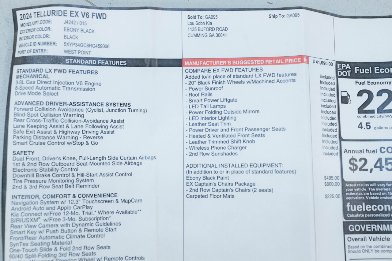 FULL HIGH RESOLUTION PHOTOS AND DETAILED DESCRIPTION ON YOU HAVE A VEHICLE YOU ARE LOOKING TO SELL, PLEASE CALL US AT 770-769-1398WE SHOW VEHICLES BY APPOINTMENT ONLY. PLEASE CALL TO SCHEDULE AN APPOINTMENT IN ORDER TO VIEW A LISTING IN PERSON.NEW ARRIVAL!! ONE OWNER CAR, STILL UNDER FACTORY WARRANTY! SUPER CLEAN LOCALLY OWNED KIA TELLURIDE EXIN GREAT CONDITION!! ADULT OWNED, ALWAYS GARAGE KEPT. NICE CAR INSIDE AND OUT, NEEDS NOTHING. COMES WITH BOOKS, MANUALS, RUBBER MATS, AND ORIGINAL WINDOW STICKER.EXTERIOR IS FINISHED IN EBONY BLACK OVER BLACK LEATHER INTERIOR.FACTORY OPTIONS AND FEATURES INCLUDE:3.8L V6 ENGINE8-SPEED AUTOMATIC TRANSMISIONFRONT WHEEL DRIVEHEATED AND VENTILATED FRONT SEATSSELECTABLE DRIVE MODES2ND ROW CAPTAINS CHAIRSONE-TOUCH SLIDE AND FOLD 2ND ROW SEATS3RD ROW SEATING20 BLACK WHEELS WITH MACHINED ACCENTSPOWER SUNROOFSMART POWER LIFTGATEREAR VIEW CAMERAROOF RAILSWIRELESS PHONE CHARGER2ND ROW SUNSHADESNAVIGATIONBLUETOOTHAPPLE CARPLAYFORWARD COLLISION AVOIDANCEBLIND-SPOT COLLISION WARNINGREAR CROSS-TRAFFIC COLLISION-AVOIDANCE ASSISTLANE KEEPING ASSIST & LANE FOLLOWING ASSISTAND MUCH MORE.GAS MOTORCARS IS A FAMILY OWNED AND OPERATED CAR DEALERSHIP LOCATED IN MARIETTA, GA. WE ONLY SELL VEHICLES OF THE HIGHEST QUALITY. WE SHIP VEHICLES WORLDWIDE AT THE BUYER'S EXPENSE. WE TAKE CONSIGNMENTS AS WELL AS TRADES.WE SHOW VEHICLES BY APPOINTMENT ONLY.PLEASE CALL AHEAD TO SCHEDULE A DATE AND TIME IN ORDER TO VIEW A LISTING IN PERSON.CONNECT WITH US ON INSTAGRAM @GASMOTORCARSIt is the customers sole responsibility to verify the existence and condition of any equipment listed. Neither the dealership nor DealerCarSearch is responsible for misprints on prices or equipment. It is the customers sole responsibility to verify the accuracy of the prices with the dealer, including the pricing for all added accessories. Visit Gas Motorcars online at to see more pictures of this vehicle or call us at770-769-1398 today to schedule your test drive.