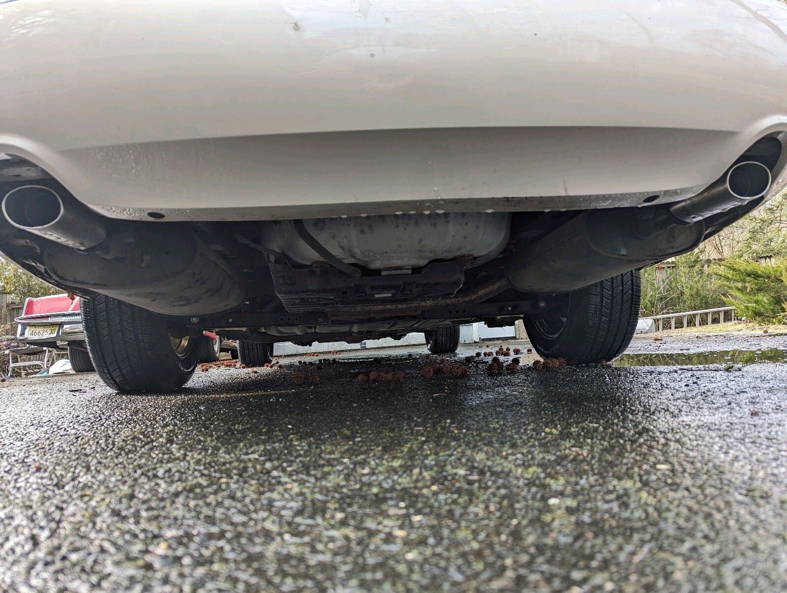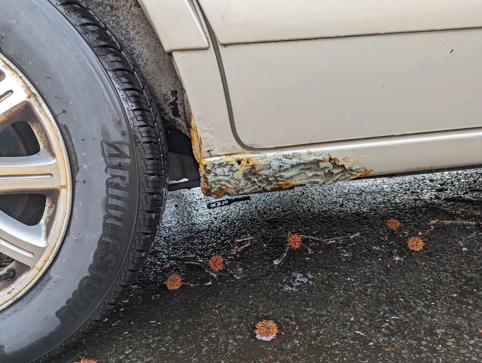 Two small tears in driver's seat. Clunking sound from rear over bumps, haven't had chance to have it fixed. Bondo repair of rust on rocker ahead of passenger side rear wheel. CD changer sometimes doesn't load properly.