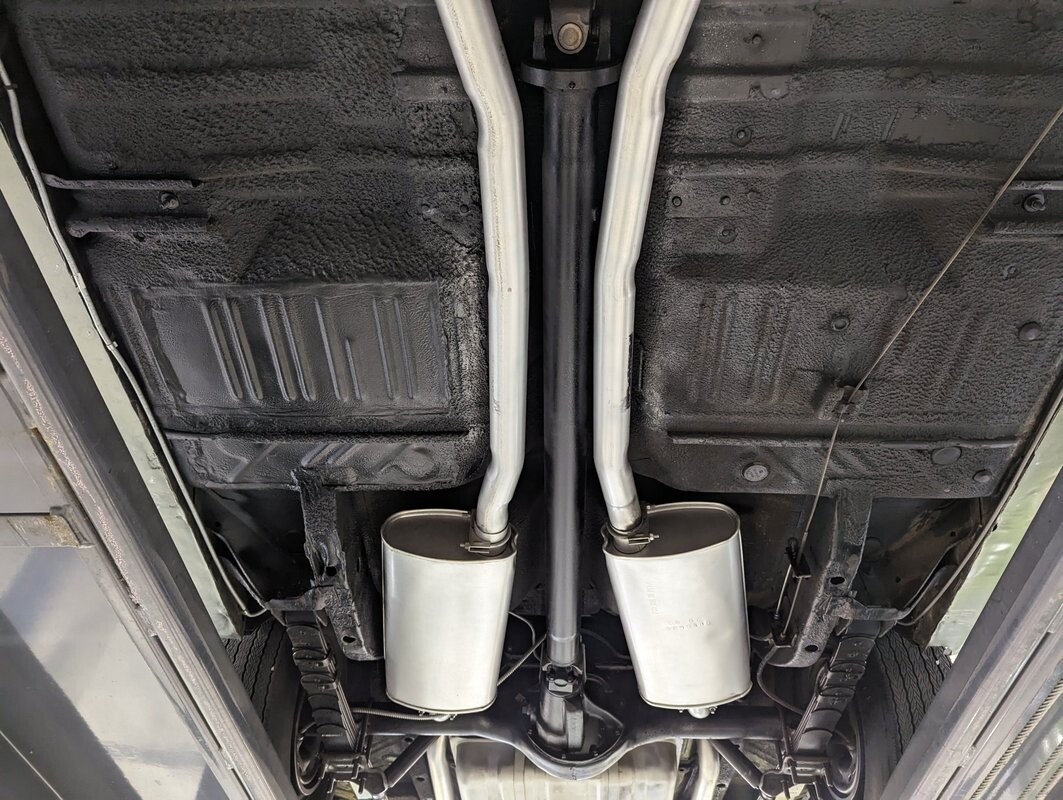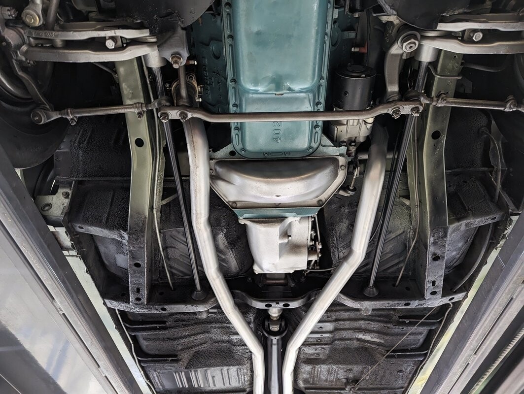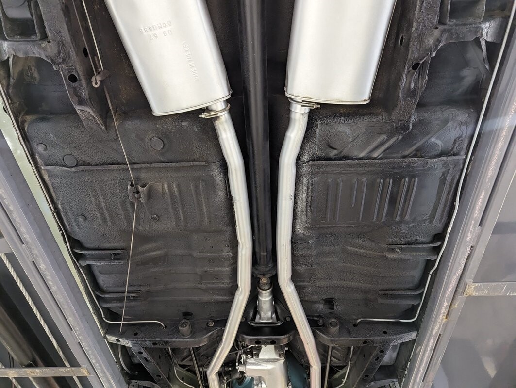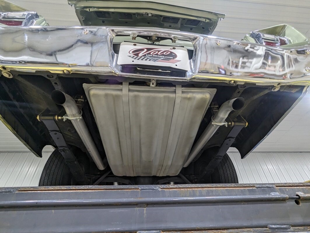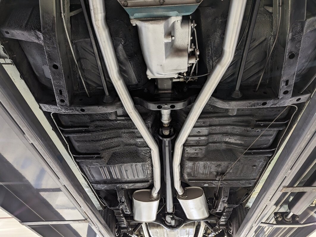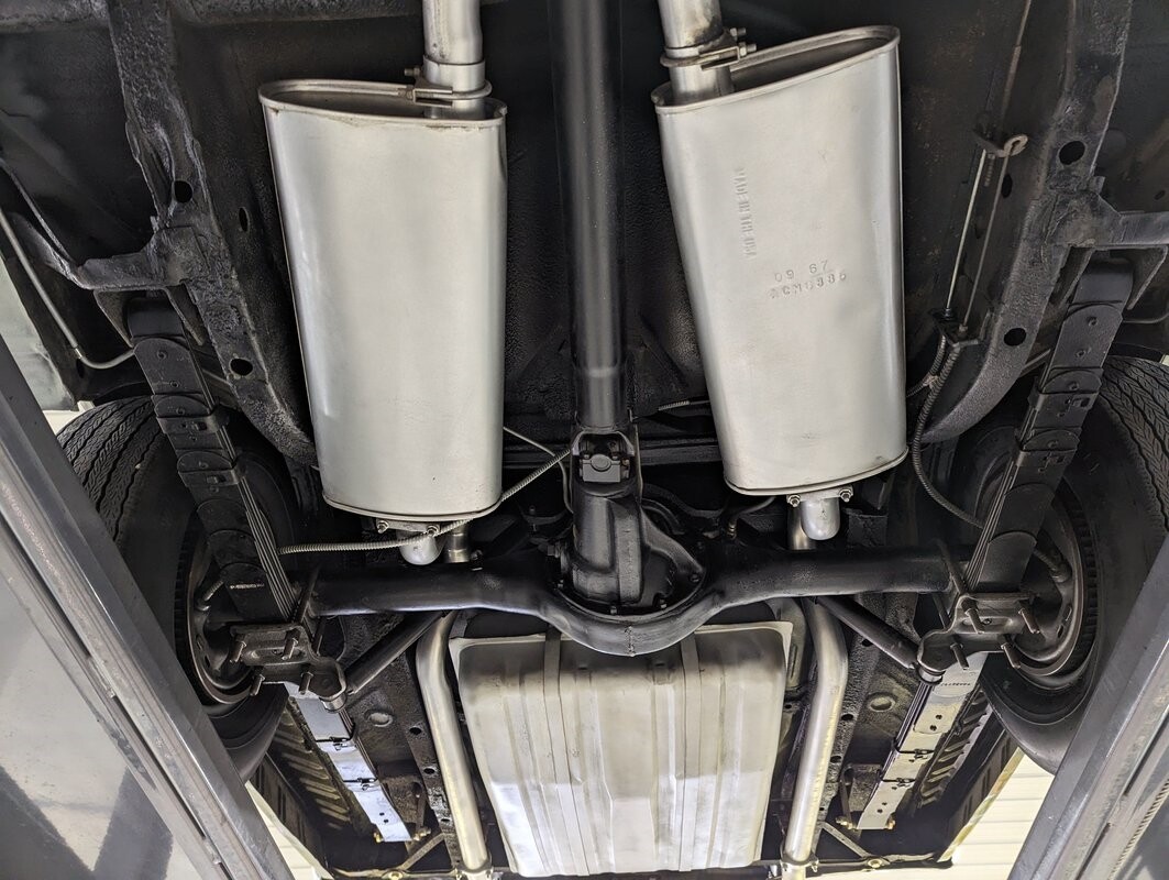 UNDERSIDE: Under this car appears to be rust free original metal. It looks like just about every component has been rebuilt or replaced. The steering, front and rear suspension were rebuilt. New dual exhaust was neatly installed. The fuel system was replaced including the tank. Correct drum brakes at all four wheels have been gone through, e-brake is hooked up. Looking up at the motor, it's clean and painted nicely, it has a high torque starter. Original #s matching 4-speed transmission was completely rebuilt. Everything is powered through the original restored 8 3/4 rear end with 3.55 Sure Grip gears.
