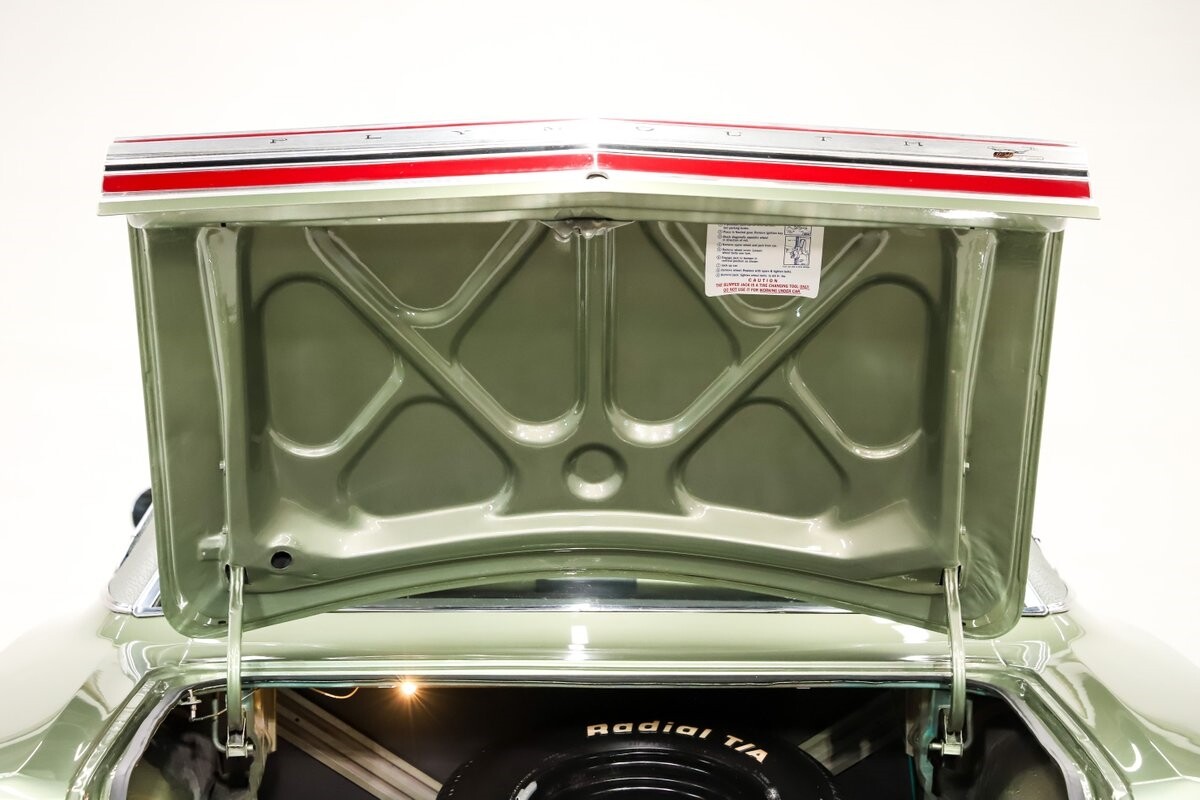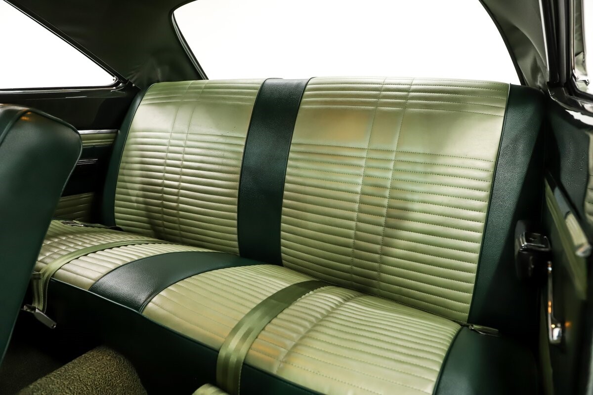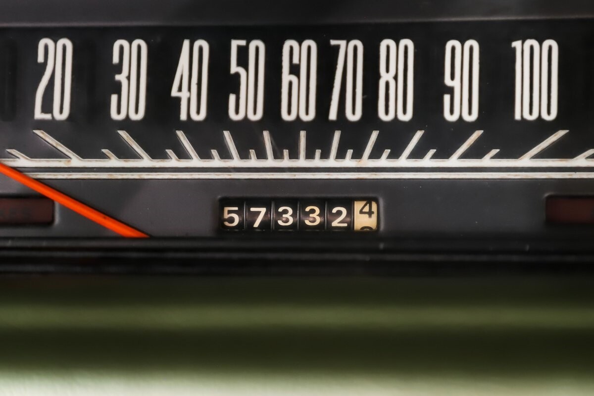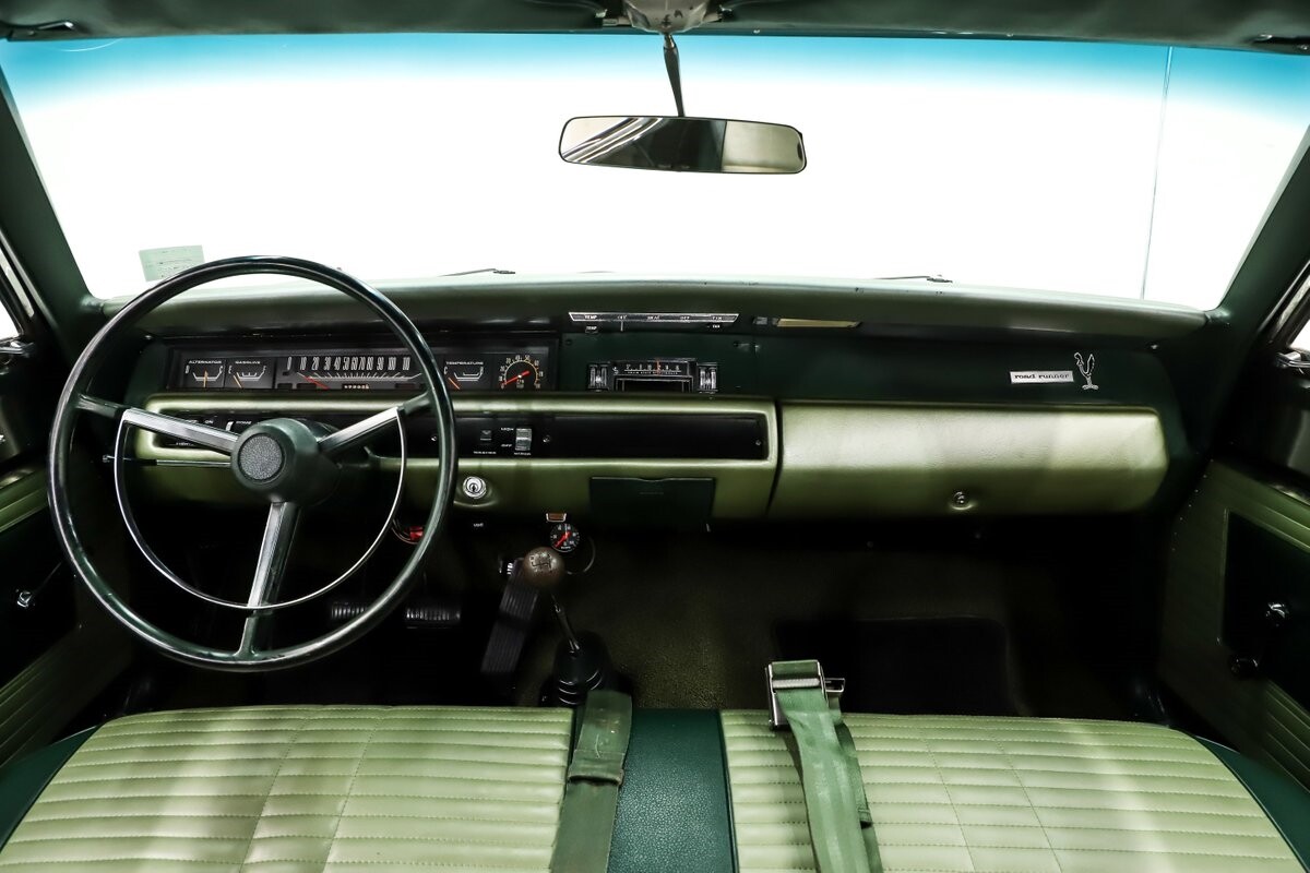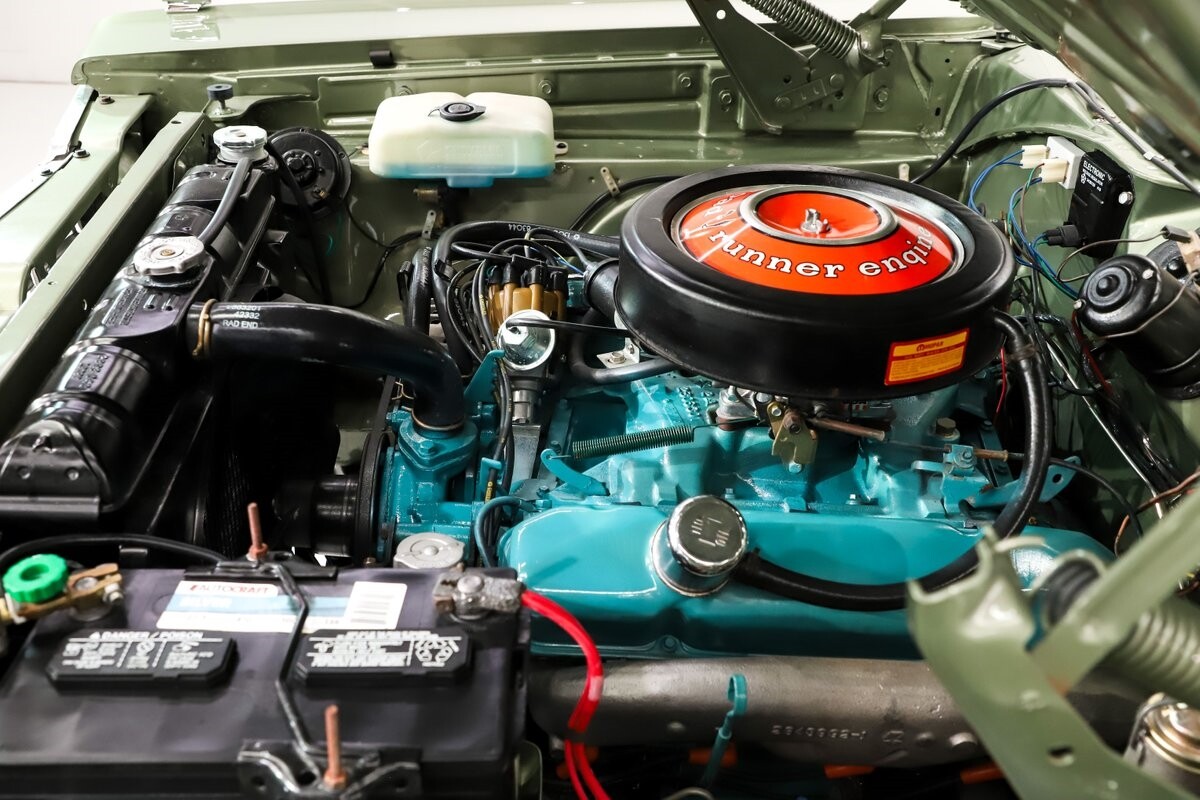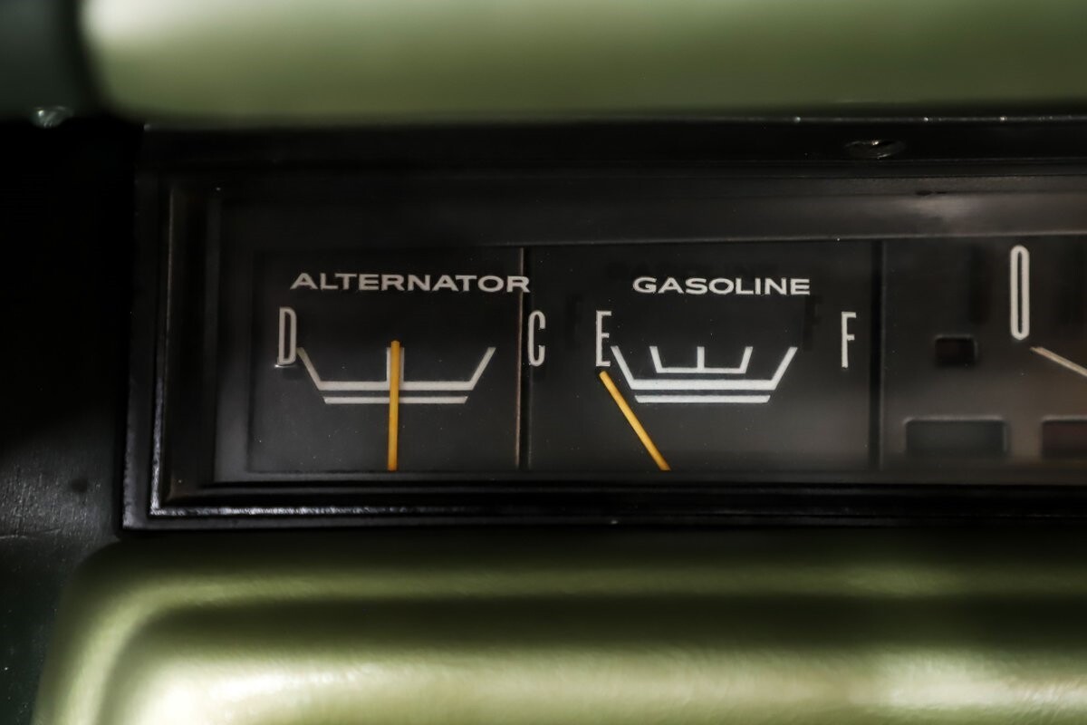 EXTERIOR: The body is clean and straight with excellent gaps. It was media blasted before being painted professionally back to its original Avocado Green with black vinyl top. 3 coats of base coat, 3 coats of clear, sanded between coats. The vinyl top looks new. Mostly original chrome with minimal patina. Optional fender mounted turn signals look new. Crystal clear windshield. Rolling on correct magnum wheels wrapped in reproduction Wide Oval redlines.