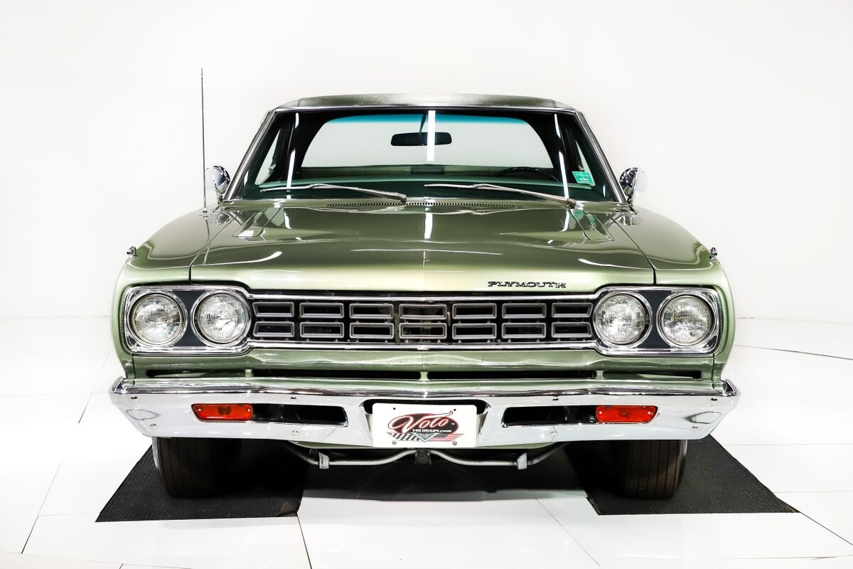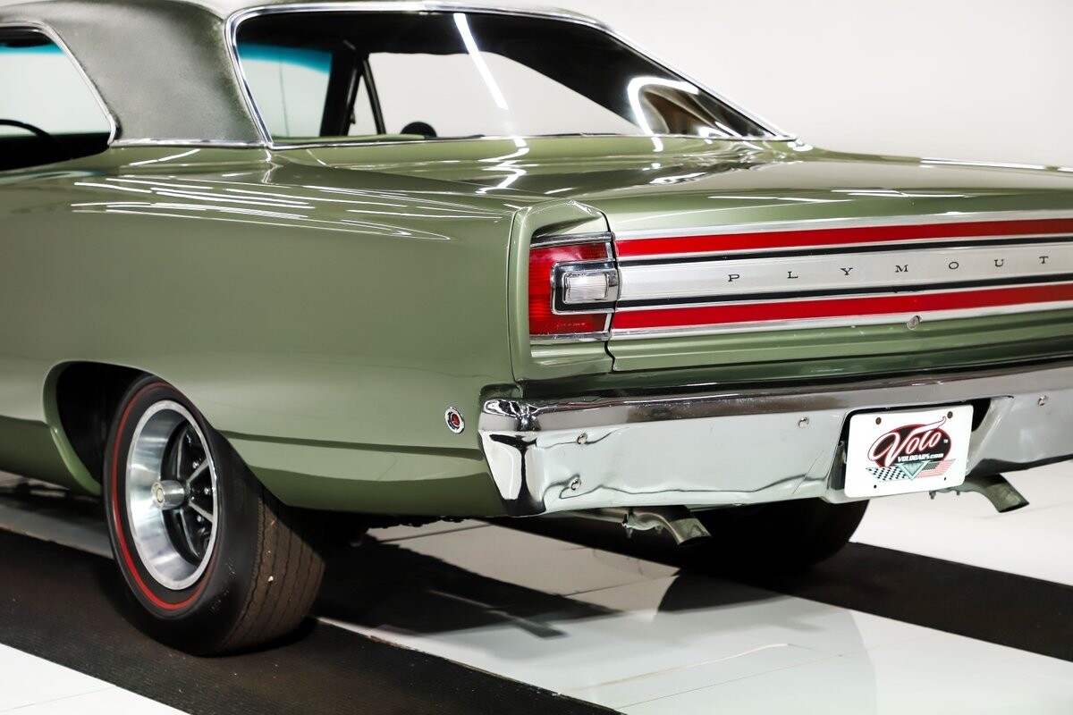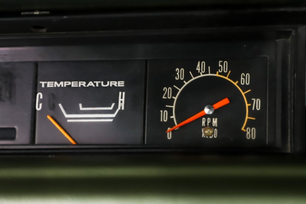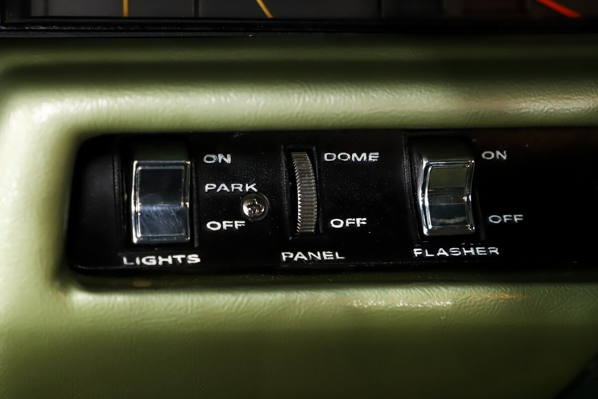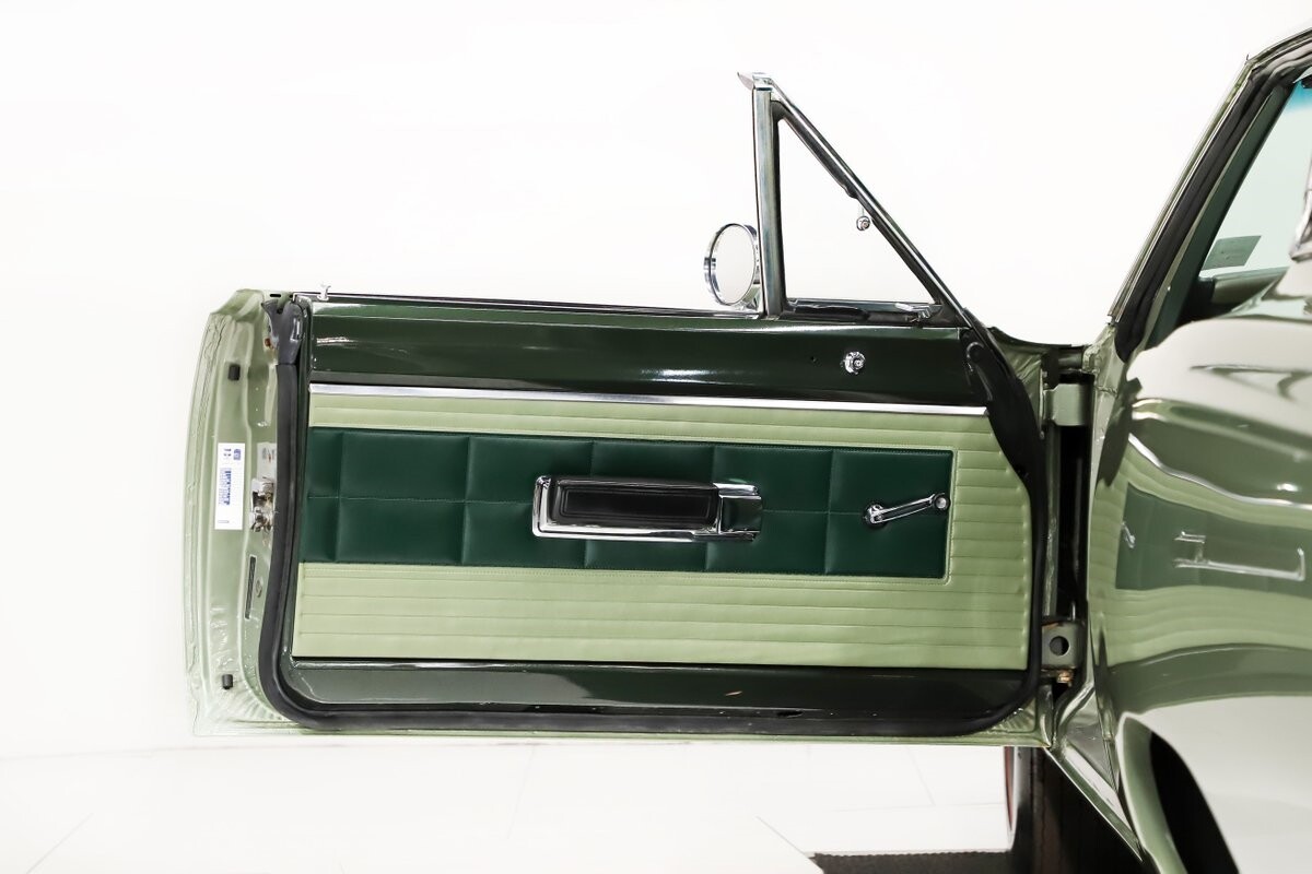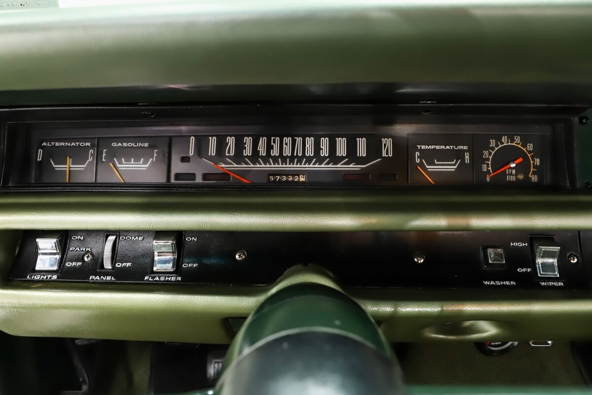 EXTERIOR: The body is clean and straight with excellent gaps. It was media blasted before being painted professionally back to its original Avocado Green with black vinyl top. 3 coats of base coat, 3 coats of clear, sanded between coats. The vinyl top looks new. Mostly original chrome with minimal patina. Optional fender mounted turn signals look new. Crystal clear windshield. Rolling on correct magnum wheels wrapped in reproduction Wide Oval redlines.