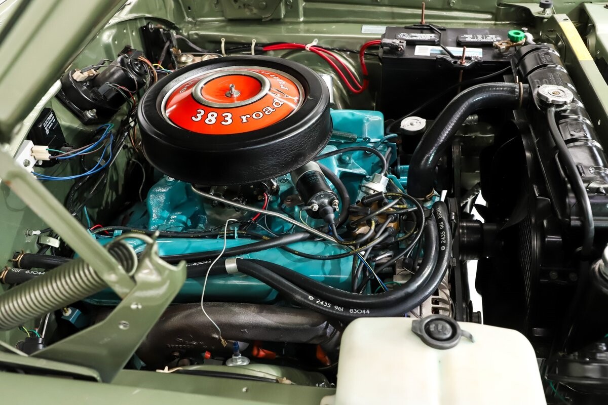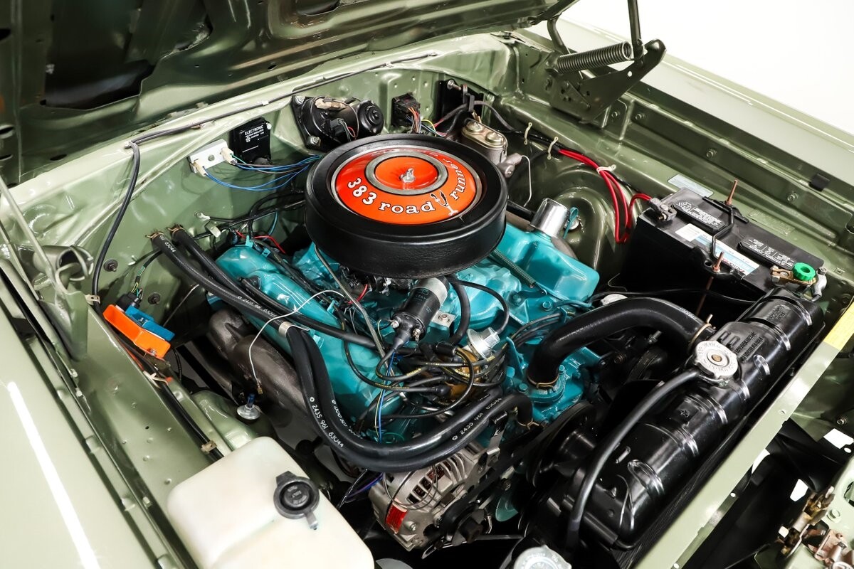 ENGINE COMPARTMENT: Numbers matching 383 rebuilt and bored to 406ci! Upgraded with Keith Black pistons, Comp Cams, Magnum Muscle cam and high-volume oil pump, rebuilt heads. Stock manifolds, air cleaner, valve covers etc. Reproduction plug wires, hoses and clamps. Upgraded Edelbrock carb, high-capacity alternator, and electronic ignition added. It has power steering; the steering column has been rebuilt. It is very proper: battery is secured, wires are properly attached and routed, squirters are hooked up. The original fender tag is still in place and #s on core support matches. The engine bay is painted beautifully.