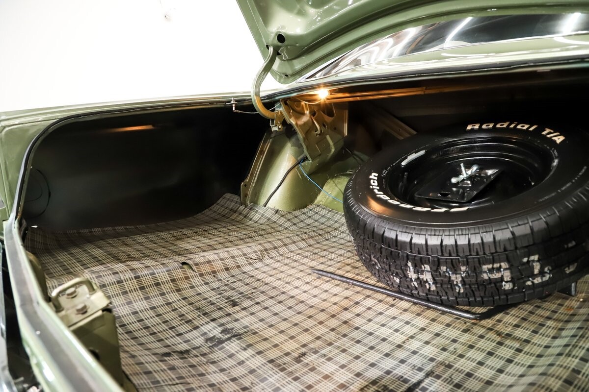 TRUNK COMPARTMENT: Under the trunk lid and the jamb is painted slick like the car. The sticker and weatherstrip has been replaced. Inside is clean, solid metal. It has the original plaid mat and working trunk light. Painted rim with a new BFG tire for a spare and it has the jack.
