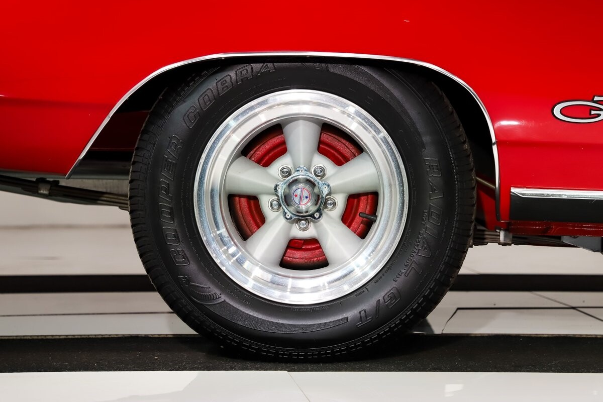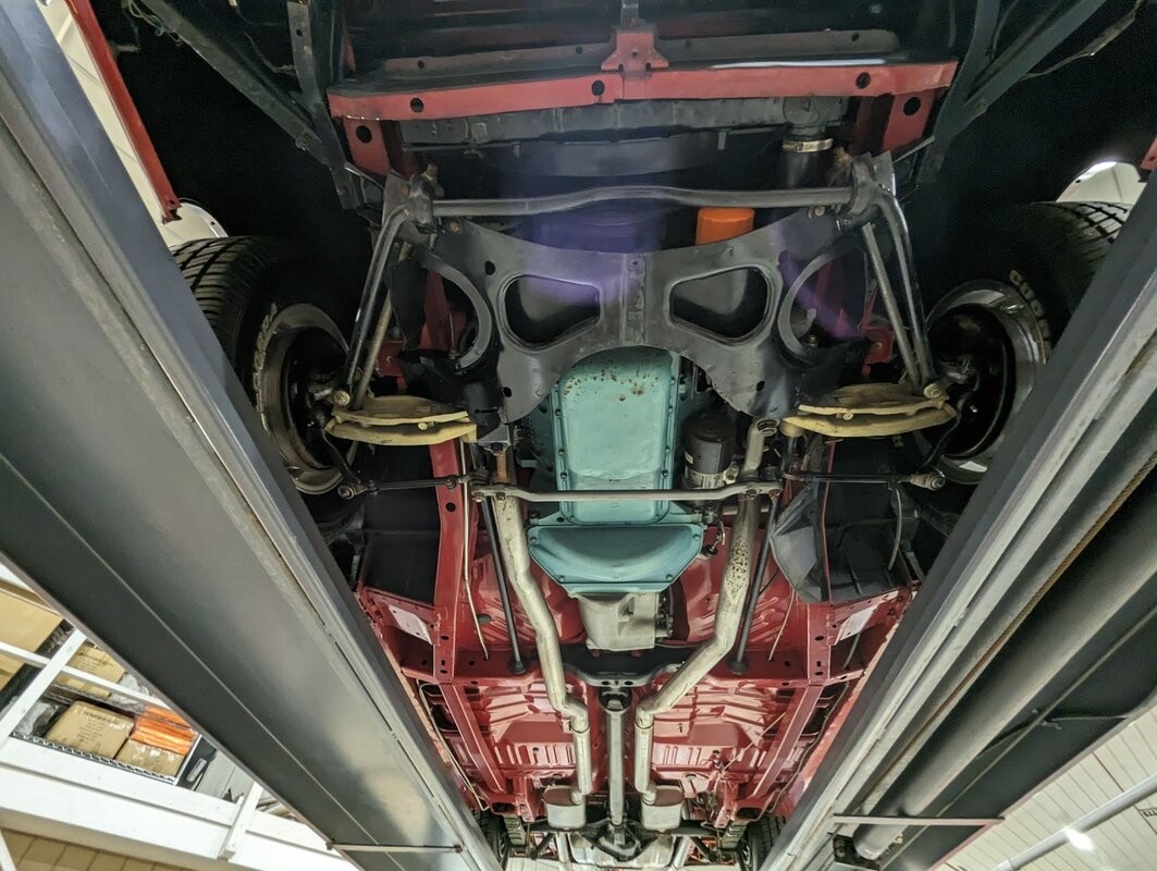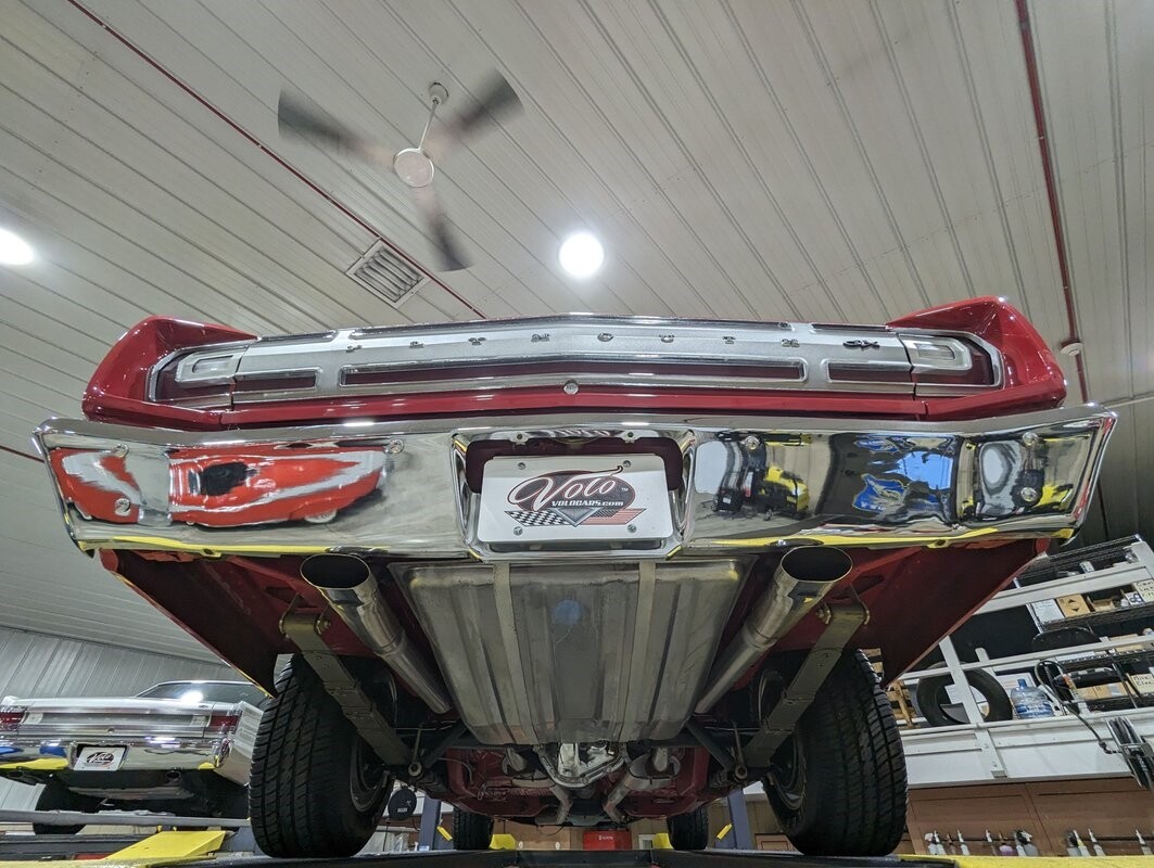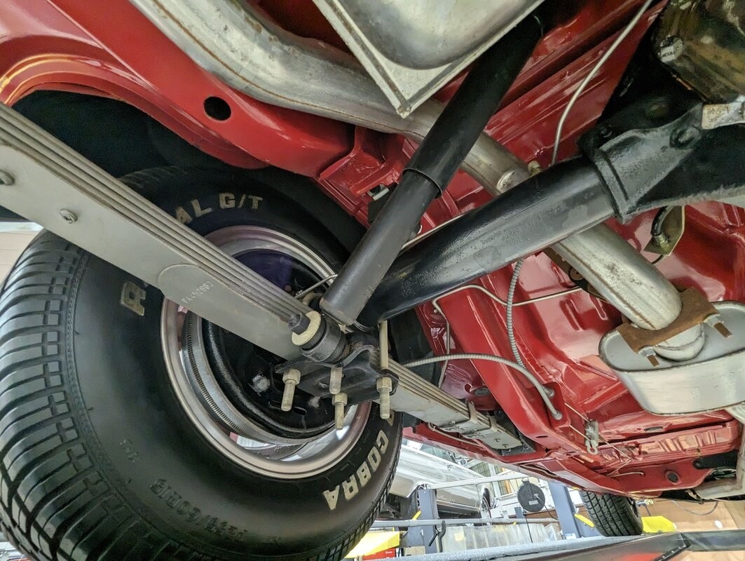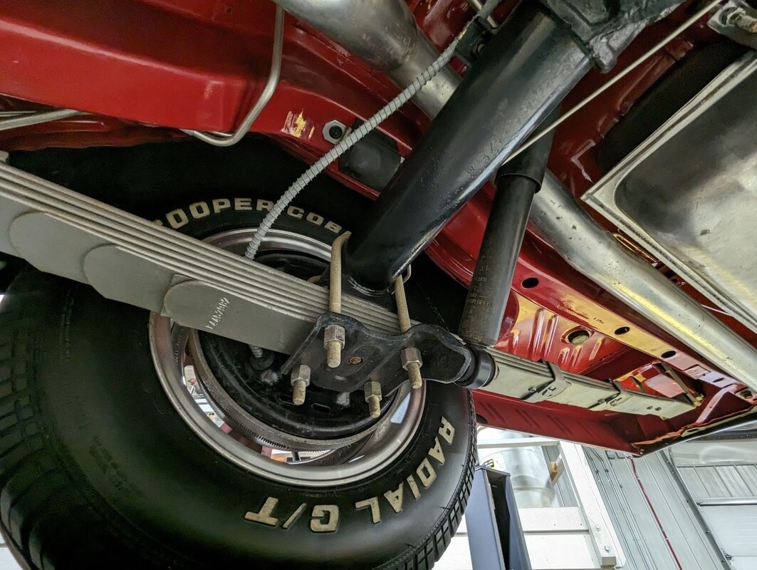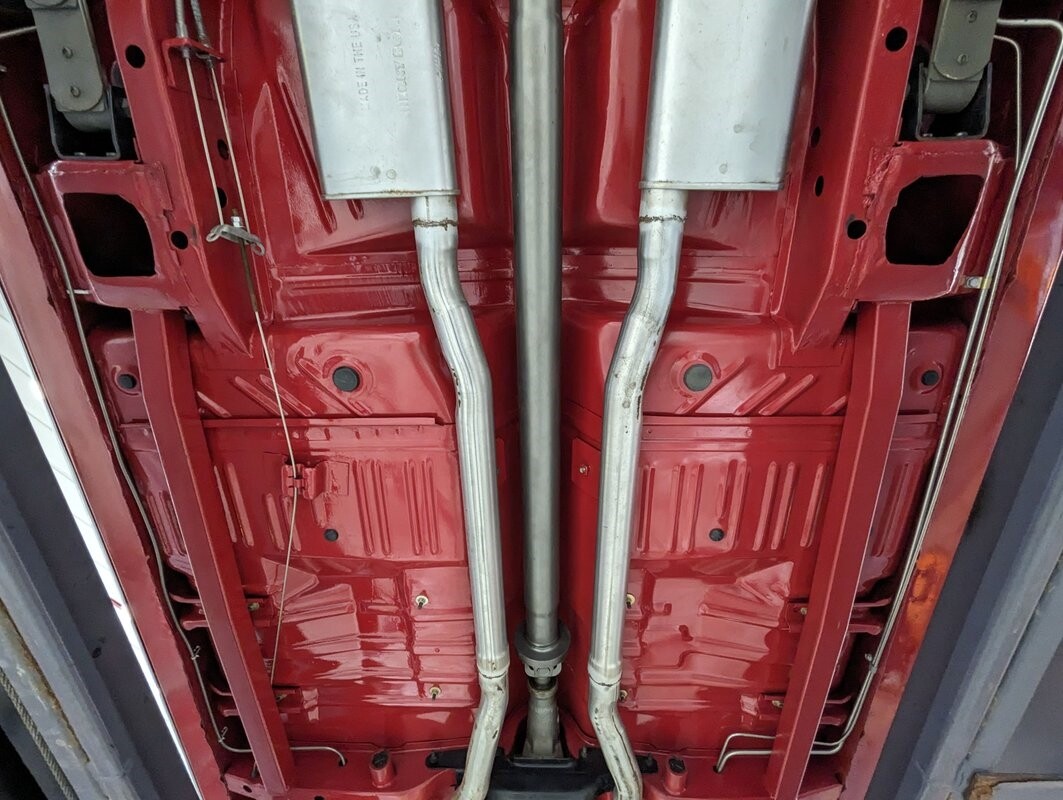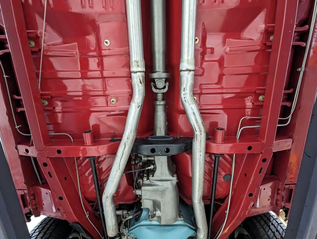 UNDERSIDE: Underneath is extra clean. The floors are such nice metal that they were painted gloss red. Frame rails were neatly welded in to prevent body twist when hammering through the gears. The H.D. suspension is all rebuilt. The rear leaf springs, shackles, and shocks were rebuilt. The 4 wheel drum brakes were restored, new parking brake lines. The gas tank still looks like new, and new lines and pump were routed nicely. The dual exhaust was custom built with Cherry Bomb mufflers and correct oval tips out the rear. Looking up at the motor it still looks fresh and has a high torque starter. The correct dated 4-speed trans is also clean. Everything's powered through its original Dana 60 rear end with 3.54 Sure Grip gears and a chrome cover. It's really impressive underneath this car!
