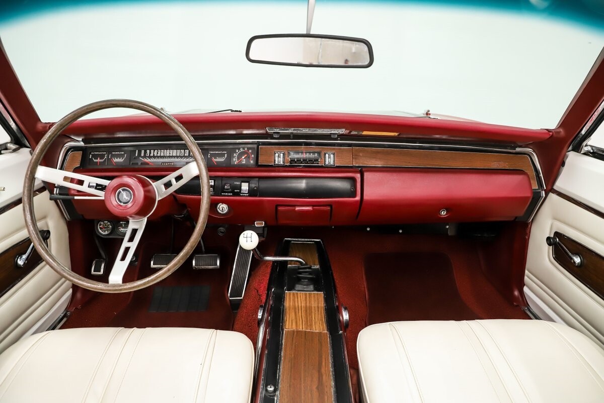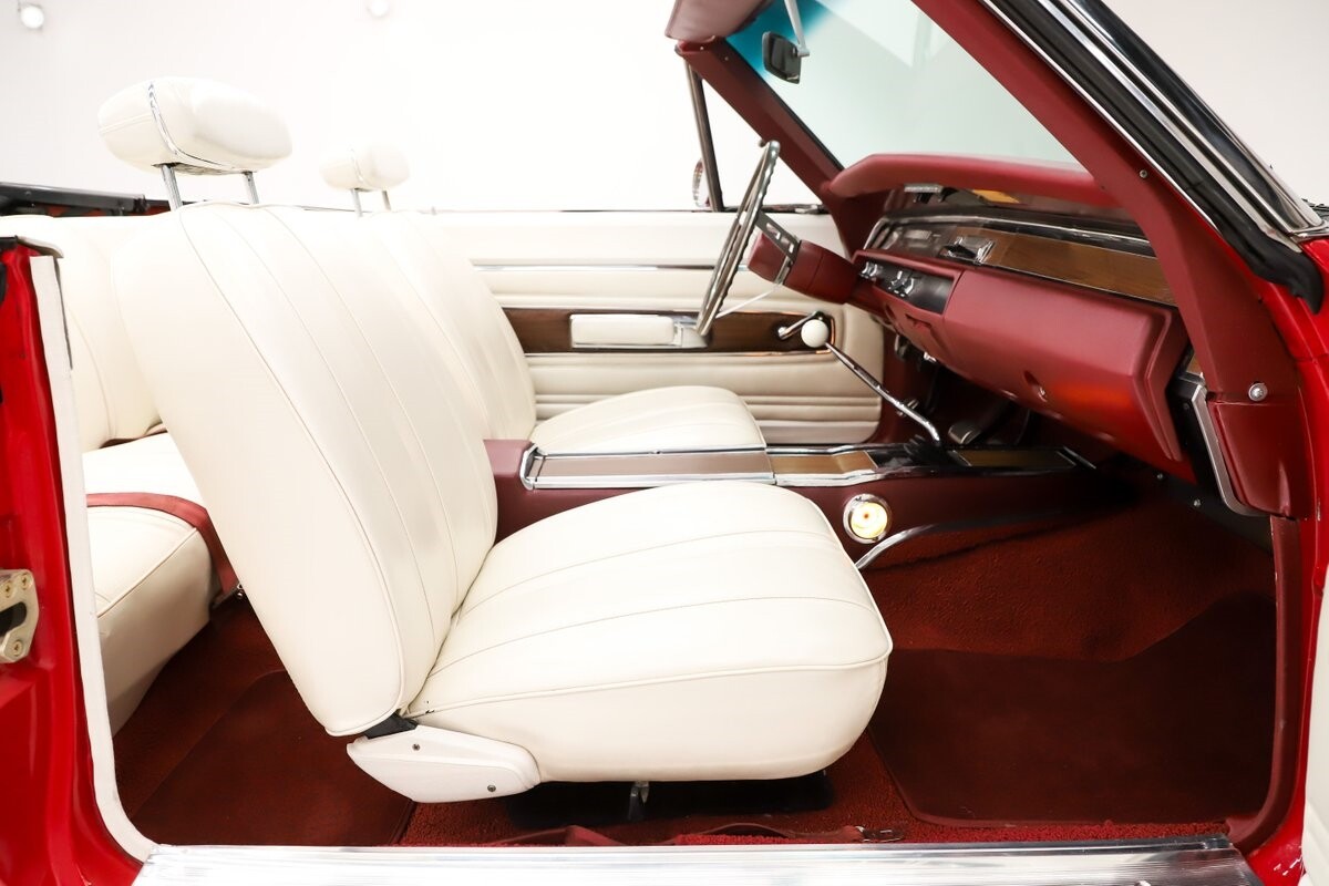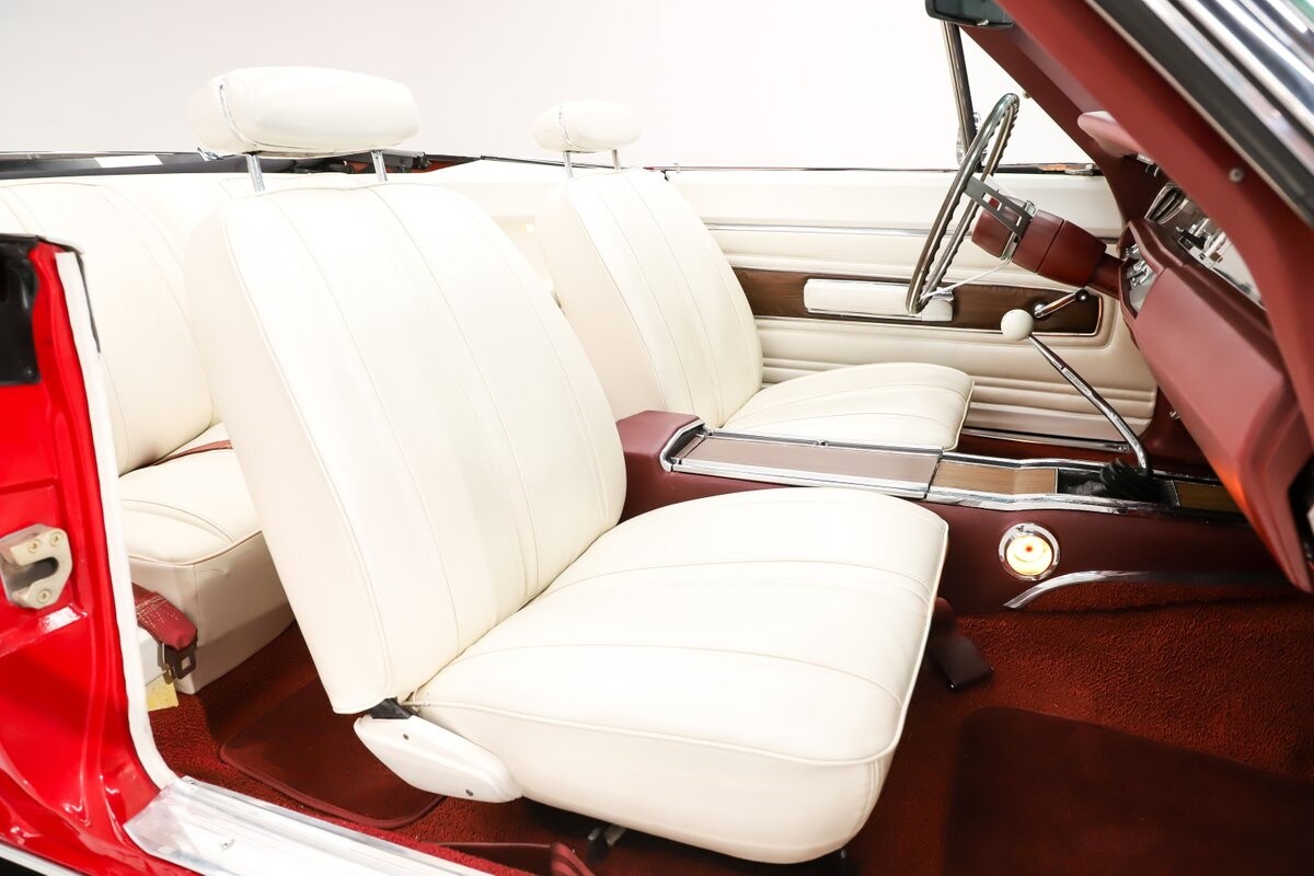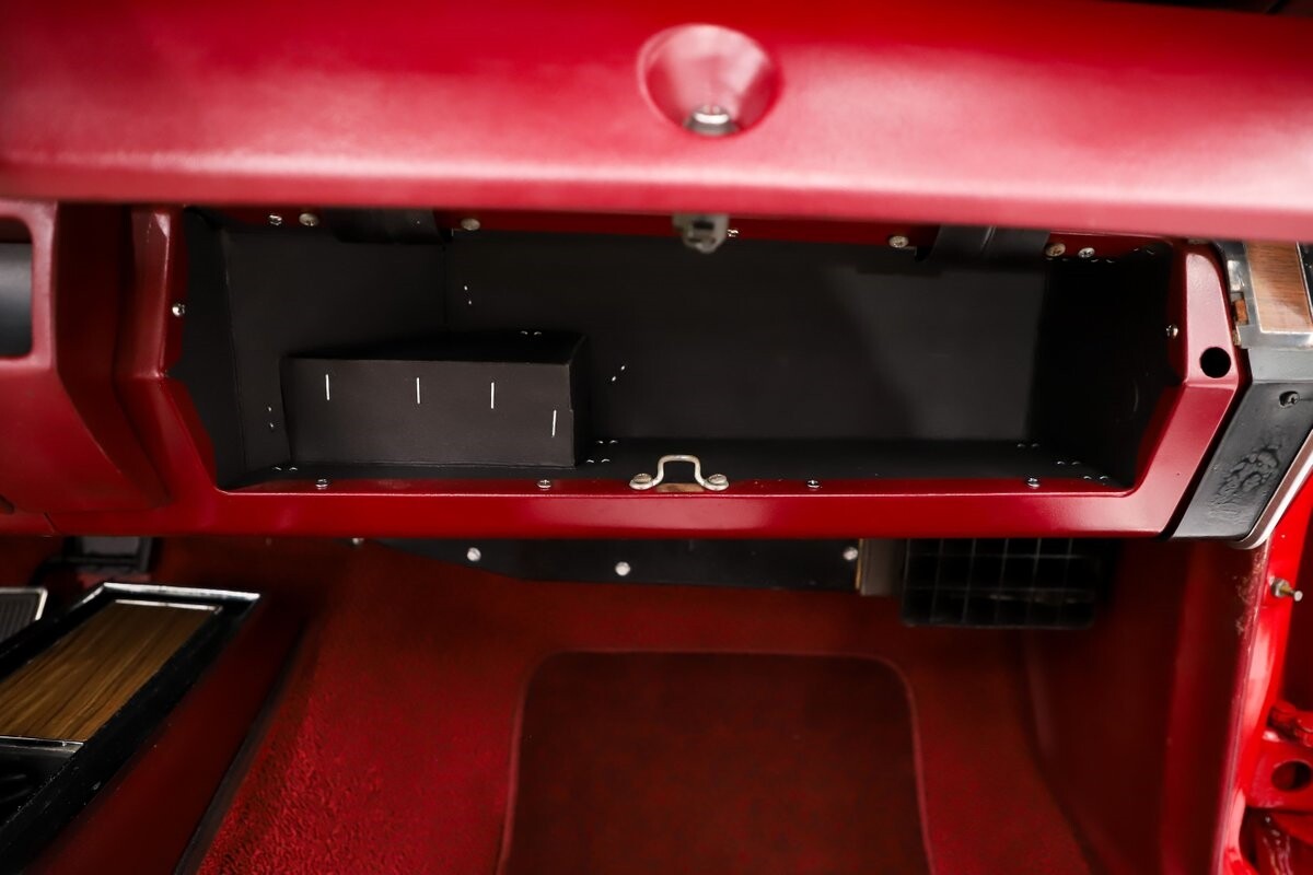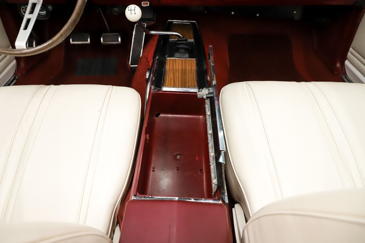 INTERIOR: Factory born with a white interior. The door panels and armrests were replaced. The dash area is very nice, not abused or altered. It has a factory tachometer in the dash and original AM radio and it's correct location. Down on the floor it has good red carpets and original 4-speed console in nice shape. Seats have been reupholstered. Interior lights work throughout.