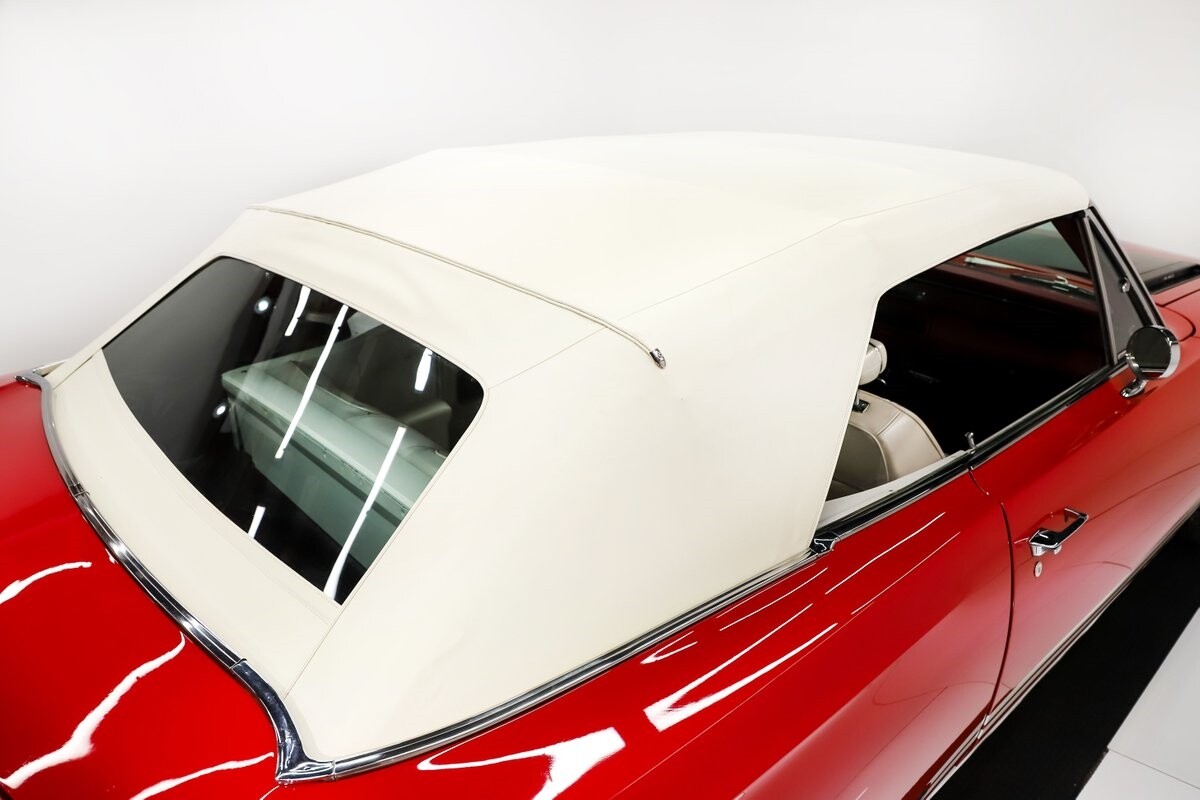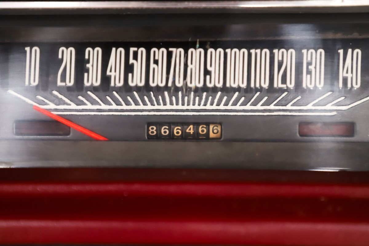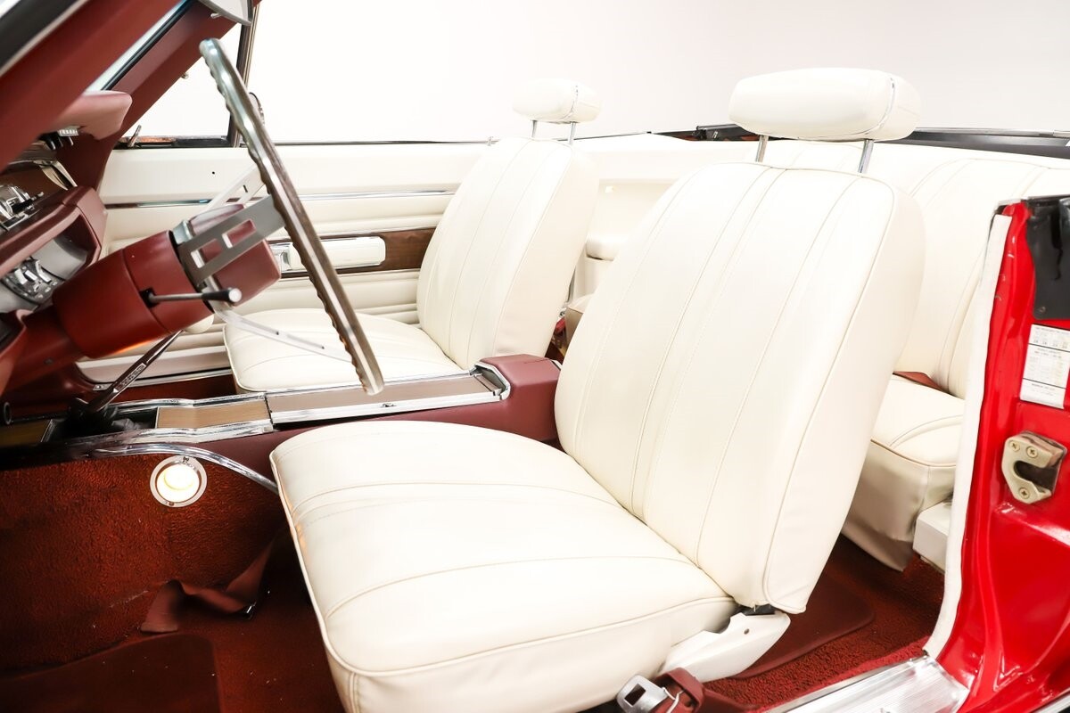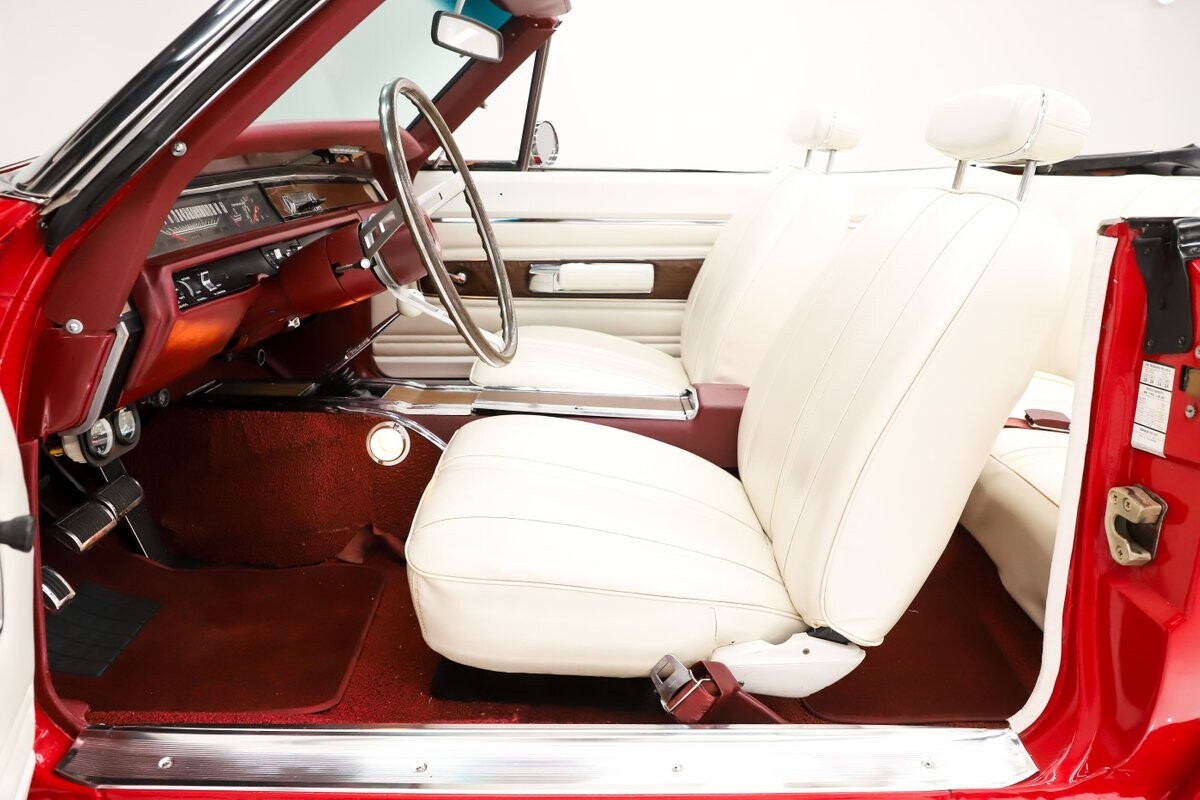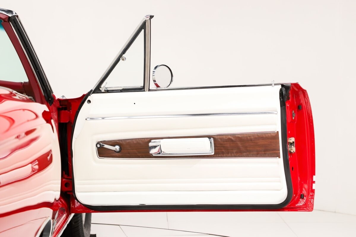 INTERIOR: Factory born with a white interior. The door panels and armrests were replaced. The dash area is very nice, not abused or altered. It has a factory tachometer in the dash and original AM radio and it's correct location. Down on the floor it has good red carpets and original 4-speed console in nice shape. Seats have been reupholstered. Interior lights work throughout.
